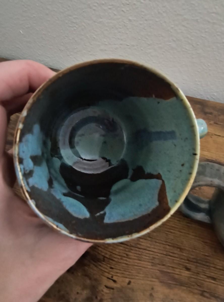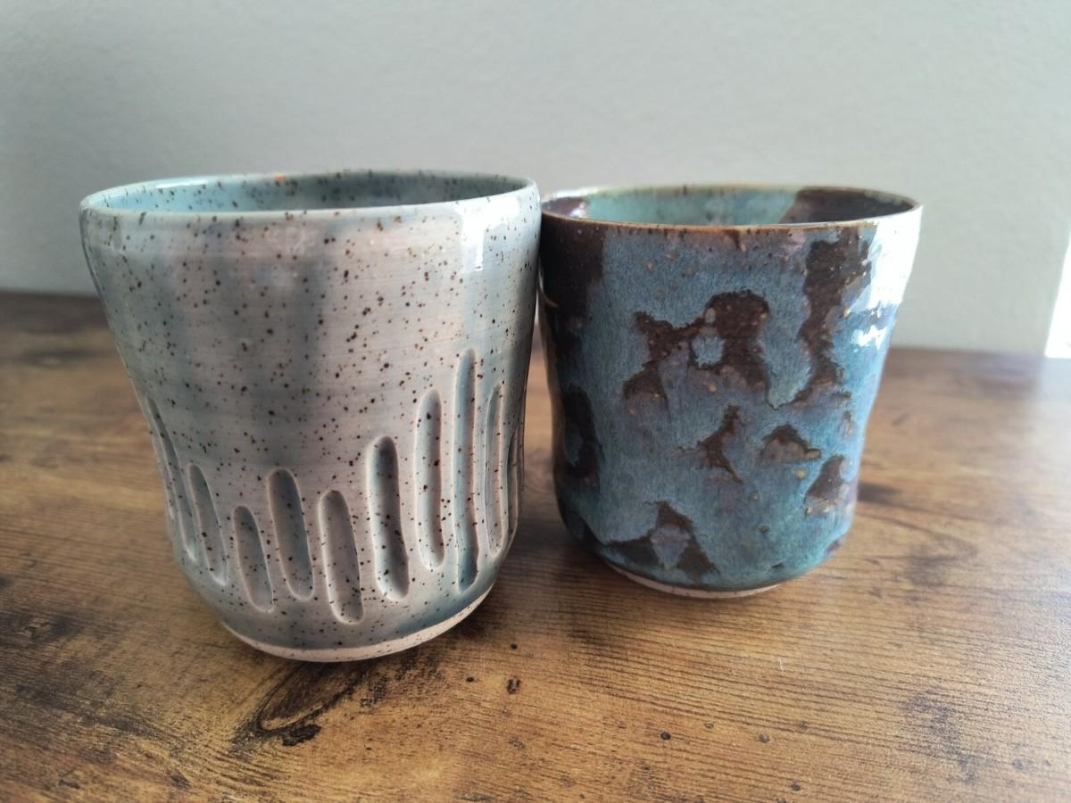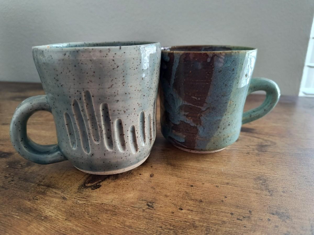 Mismatched Studio Art pottery coffee mug cup, ceramic, artist signed, total of 2