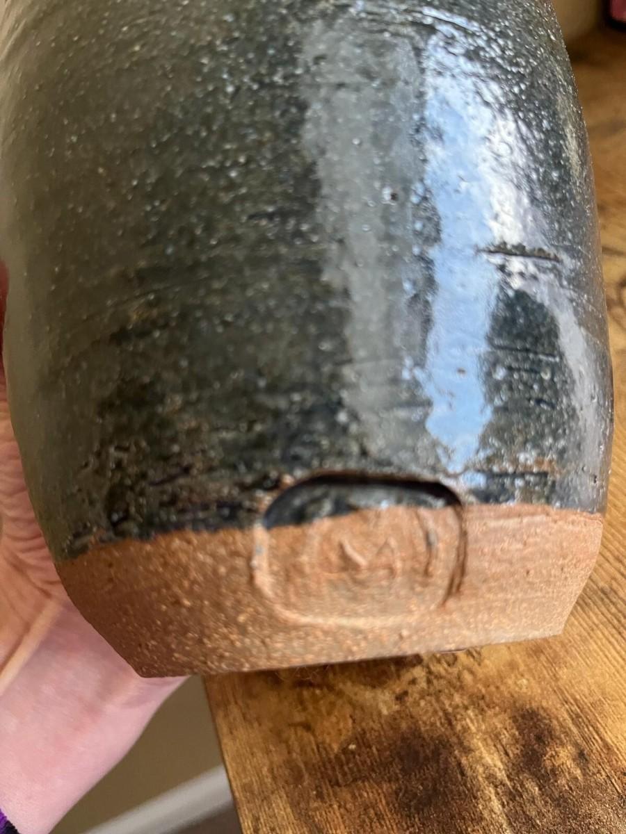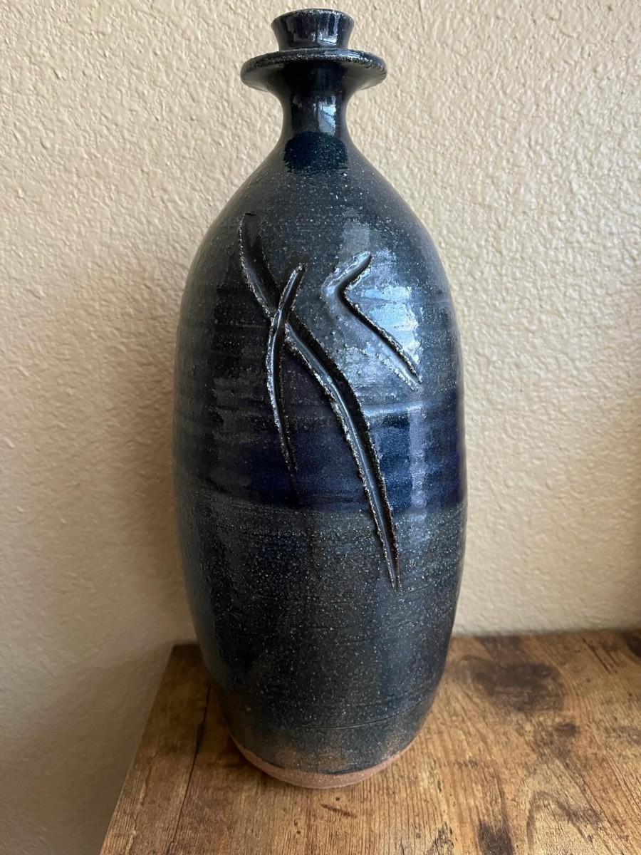 Studio Art Pottery Vase Tall 13" dark grey blue tones glossy drip glaze signed