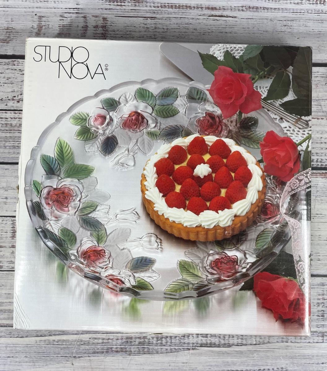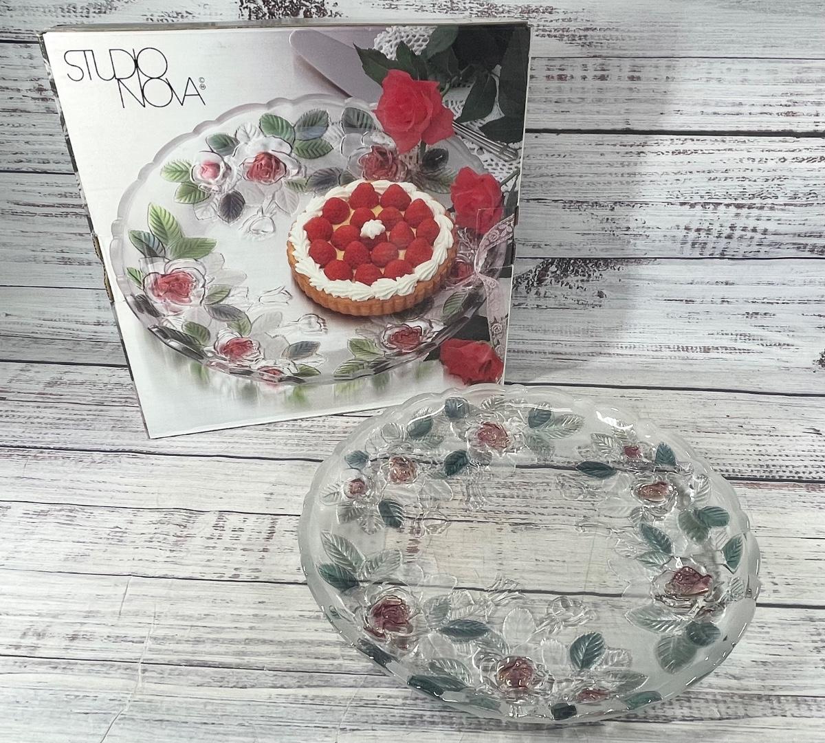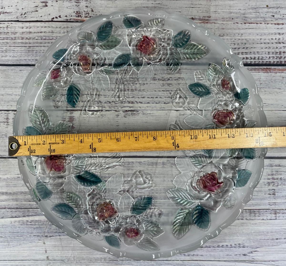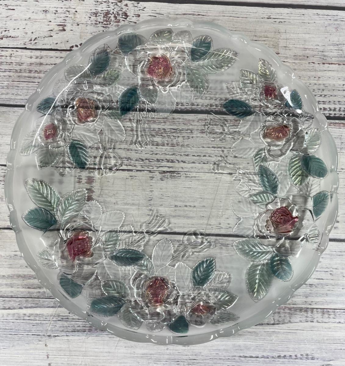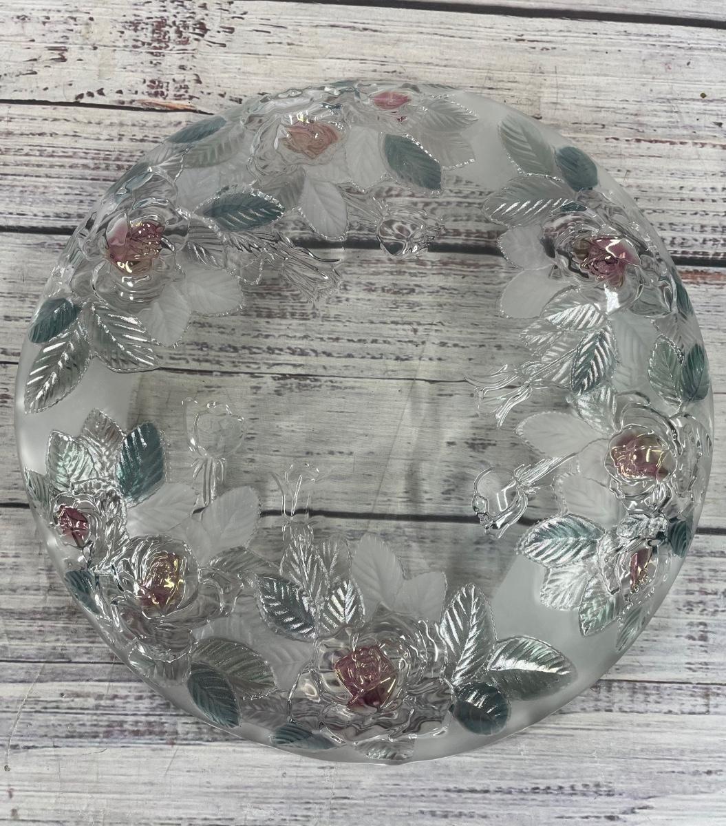 Item is in great condition and comes in it’s original packaging. There is a frosted glass in the sides and the middle is crystal glass. It is approximately 14” wide and perfect to use as a serving platter.