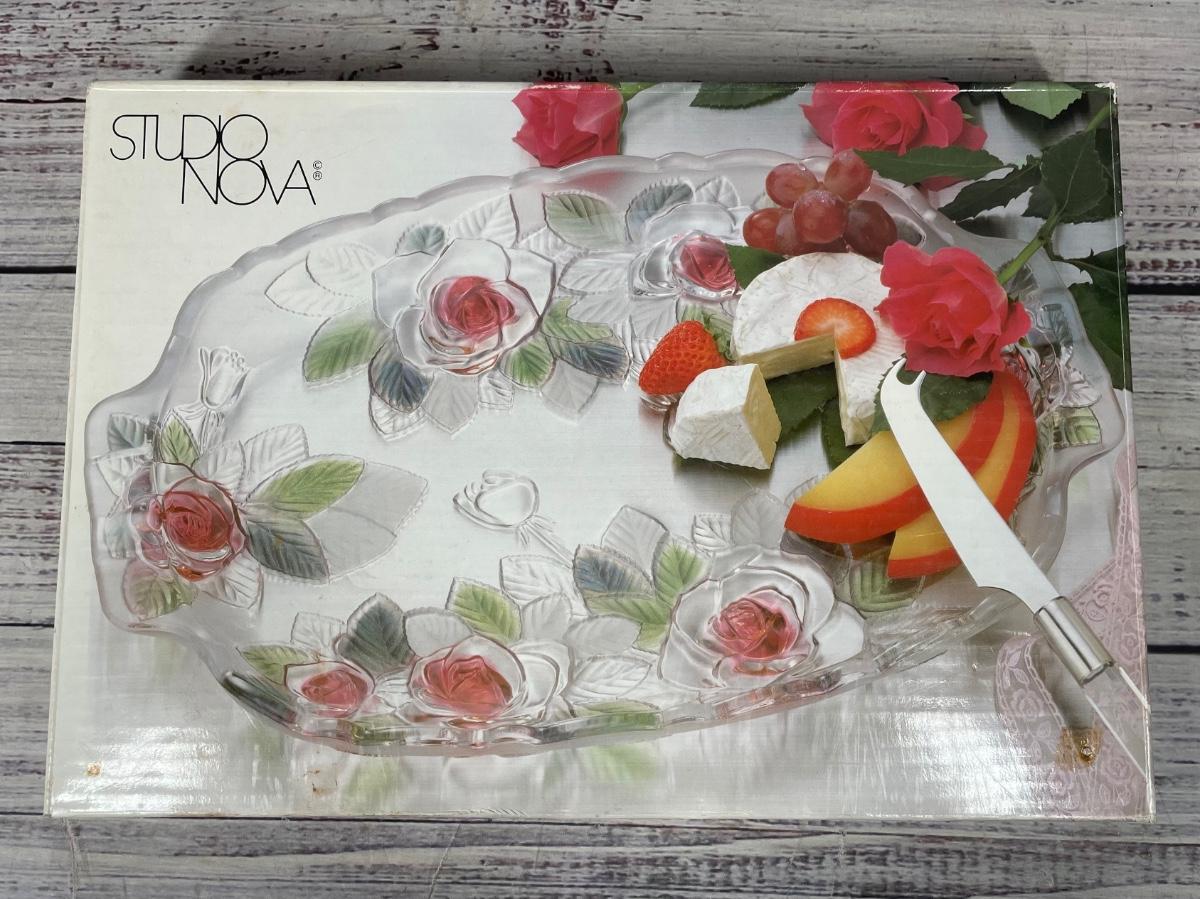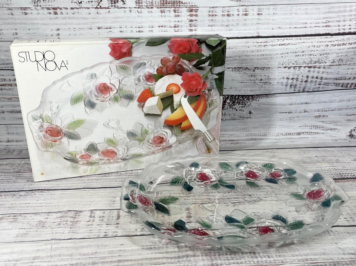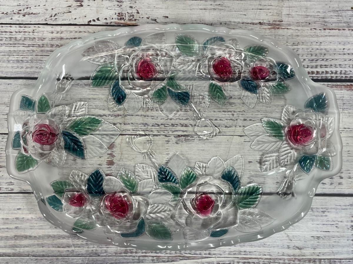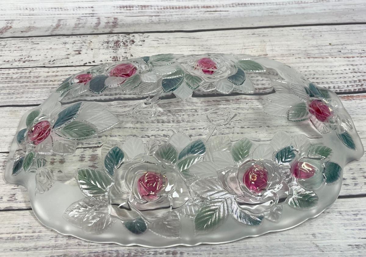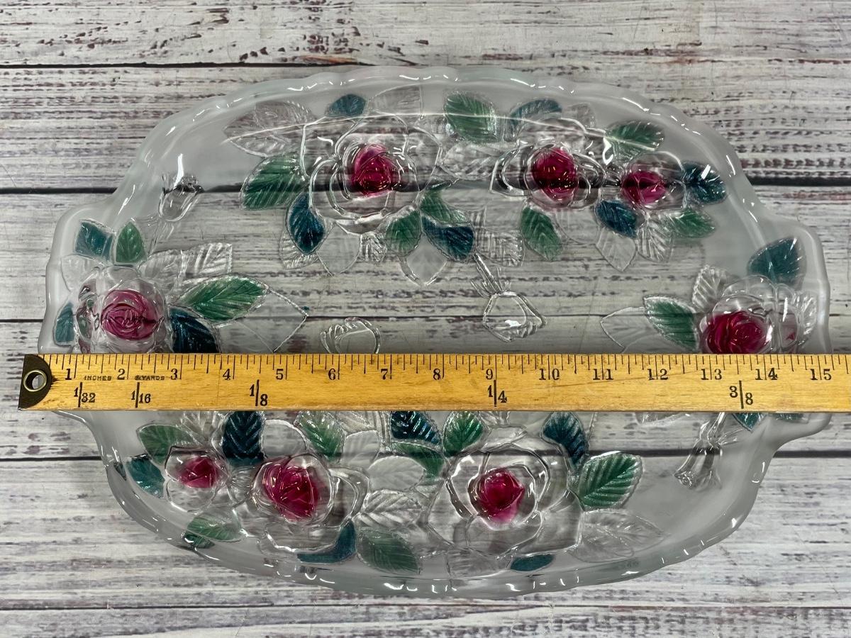 This floral platter is in great condition and comes in it’s original packaging. The platter is 13” long without counting the handles, but 15” long when they are counted. The serving tray has frosted glass on the sides and the middle is crystal glass.