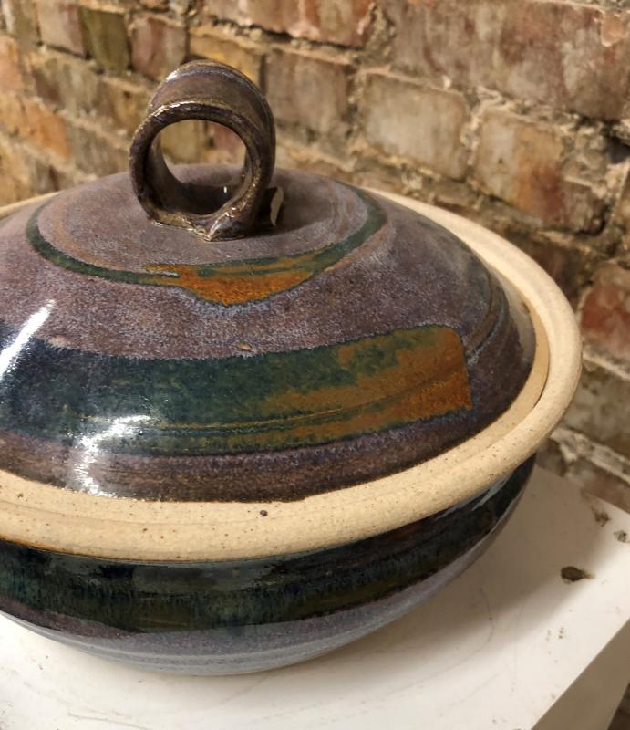Here is a beautiful piece of stoneware...this studio pottery covered casserole is signed by the artist...9 1/2" diameter...Excellent condition showing little or no use...