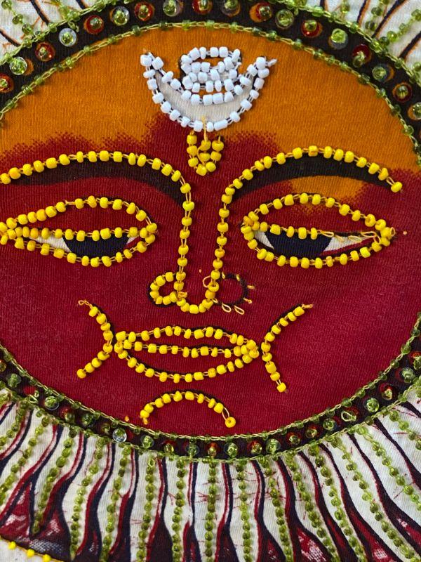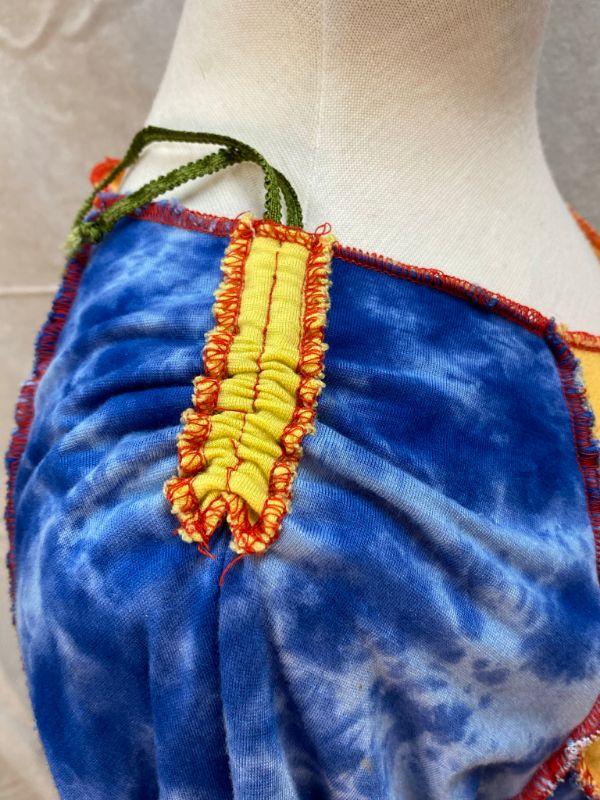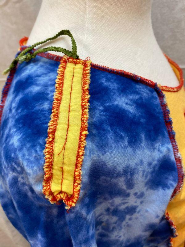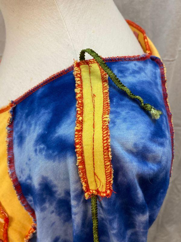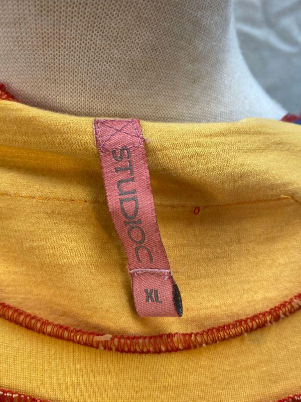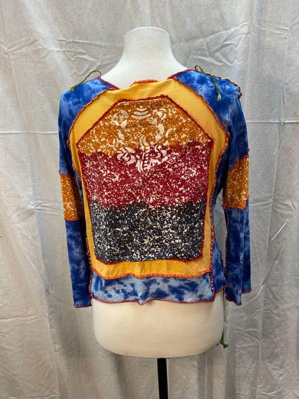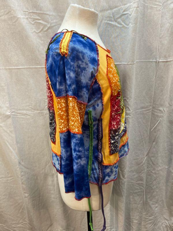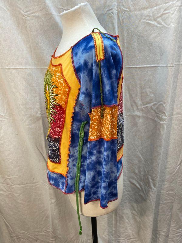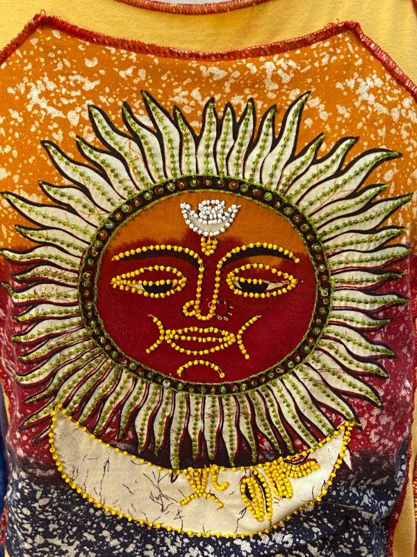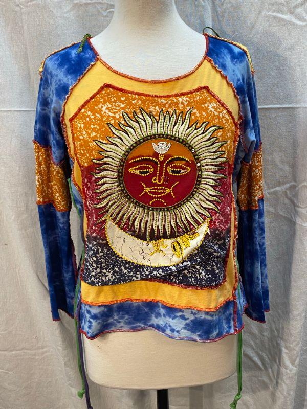 StudioC beaded sun & moon top. Patchwork style. Drawstring pulls at the shoulder to give shape to neckline. Size XL, but looks smaller. There is a few beads missing from the sun's nose.