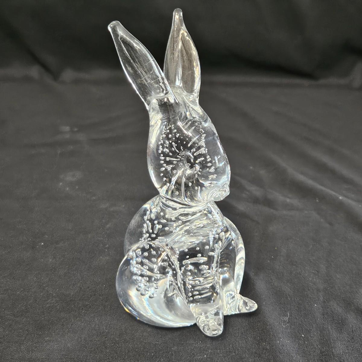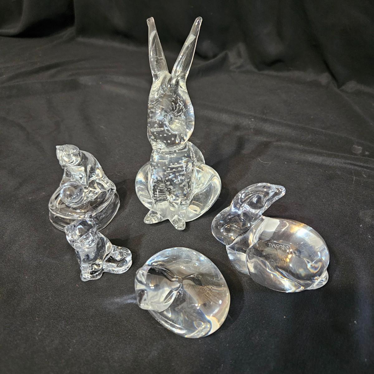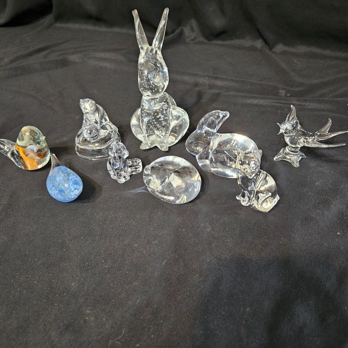 An assortment of glass and crystal critters that includes cats, bunnies and birds. The curled up cat has 'Steuben' etched in the back and upright cat has a Bohemia sticker. The rabbit measures approximately 3" x 3.5" x 6"H. Shipping available