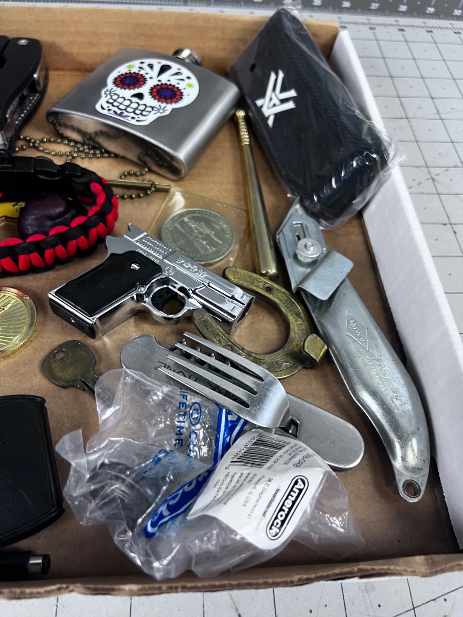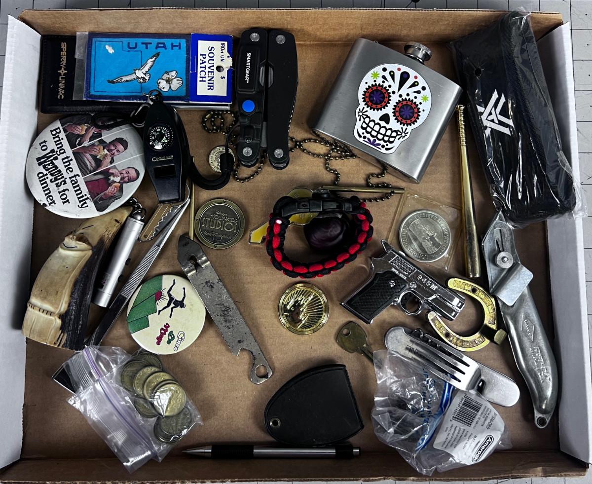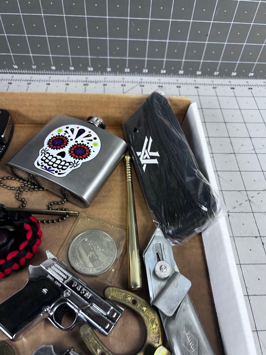 Stuff Lot: Leathers, Tokens, Lighter, Whistle, Flask ETC.