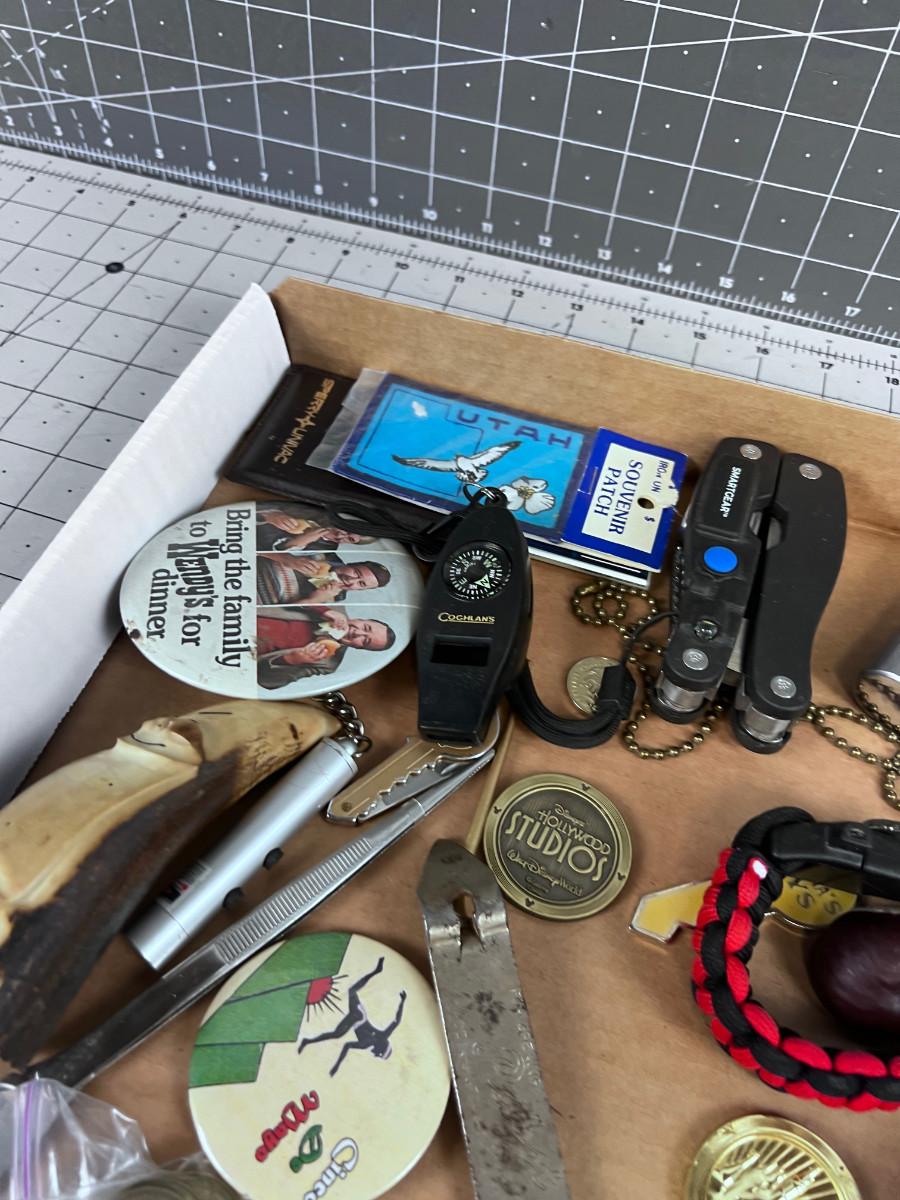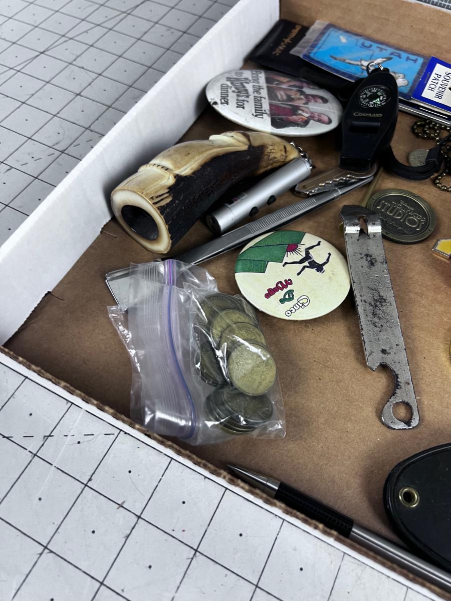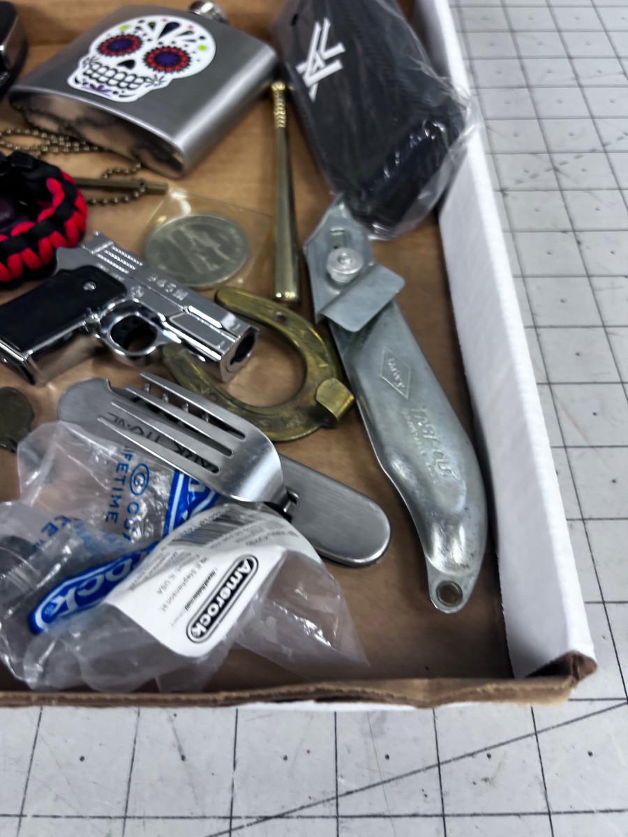 Stuff Lot: Leathers, Tokens, Lighter, Whistle, Flask ETC.