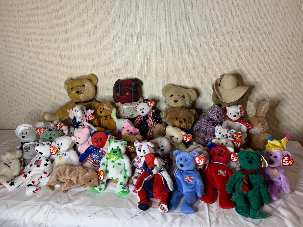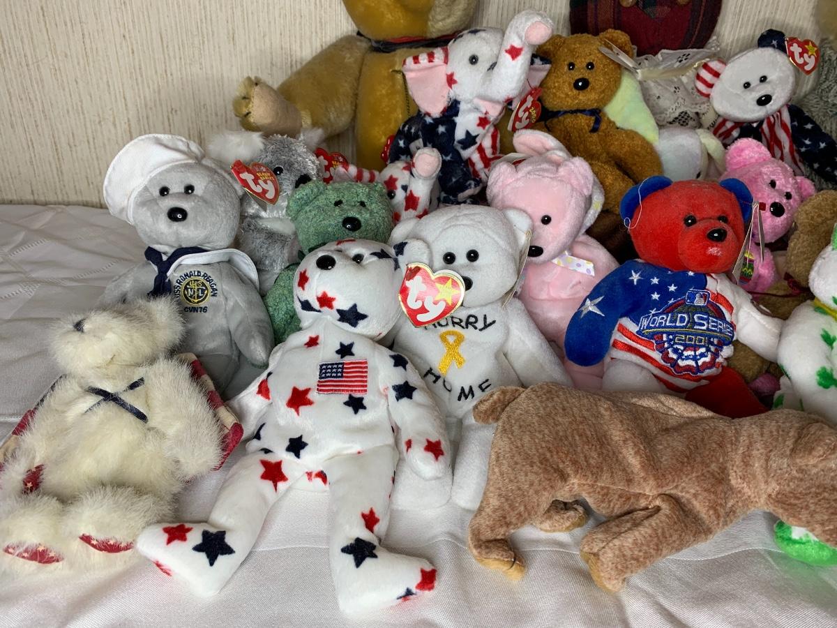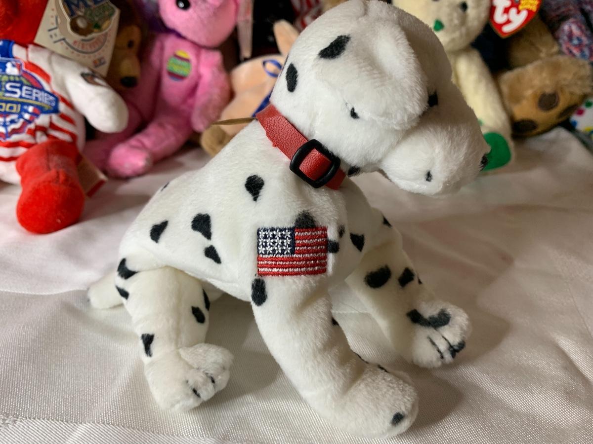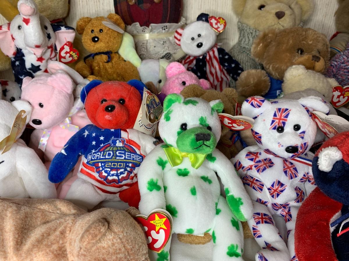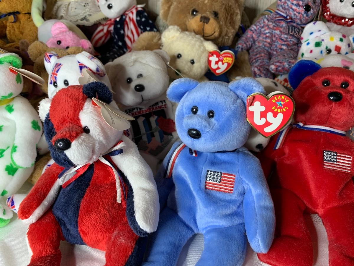Stuffed animals including LOTS of Beanie Babies (including Dalmatian, elephant, koala, 4th of July bears, MLB world series 2001 bear, UK bear, st patties bear, 911 bear, USS Ronald Reagan bear, April fools bear, Hermann Teddy Original and more