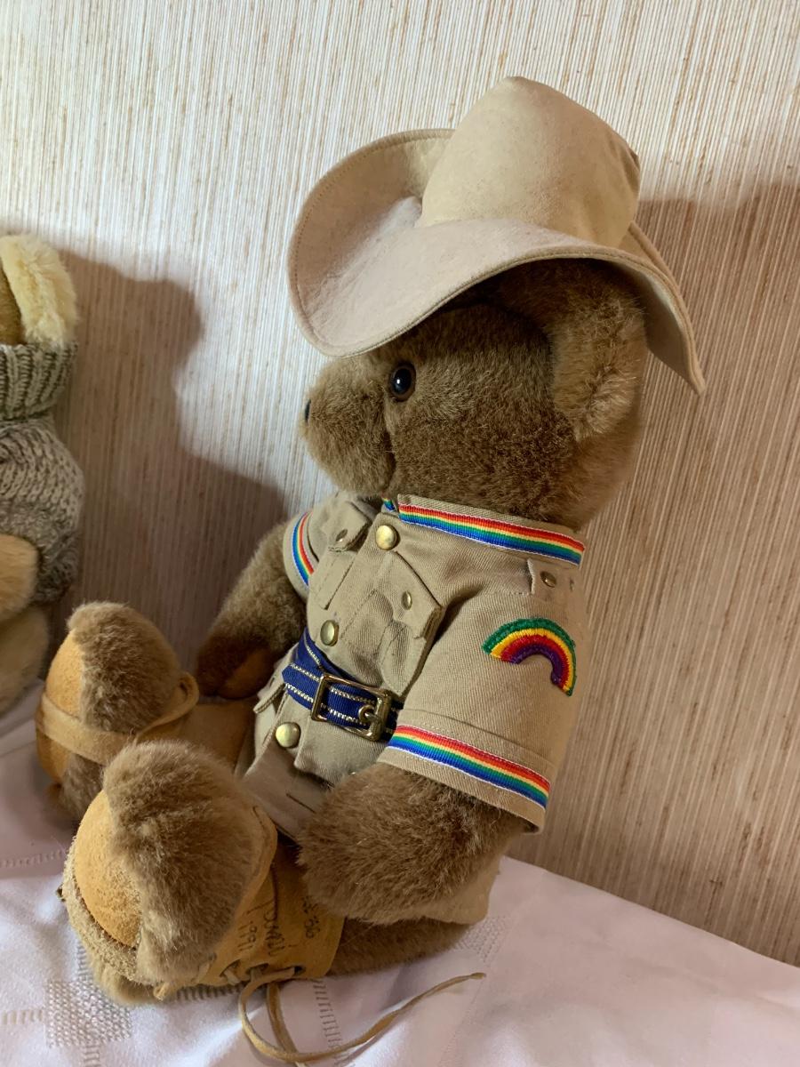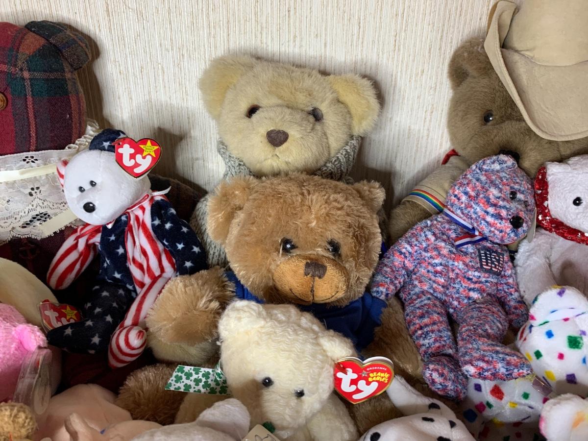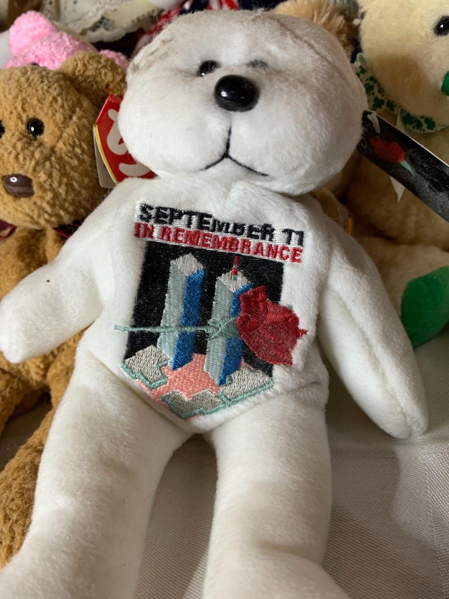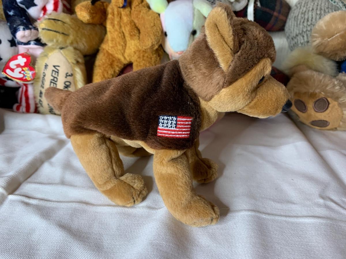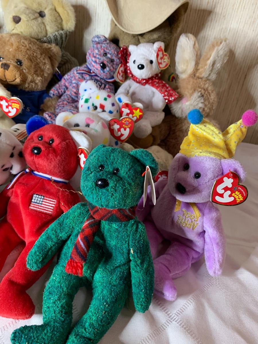 Stuffed animals including LOTS of Beanie Babies (including Dalmatian, elephant, koala, 4th of July bears, MLB world series 2001 bear, UK bear, st patties bear, 911 bear, USS Ronald Reagan bear, April fools bear, Hermann Teddy Original and more