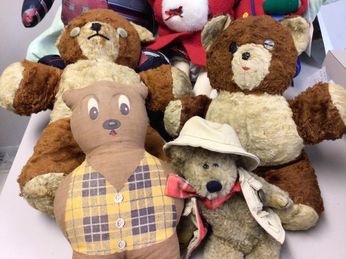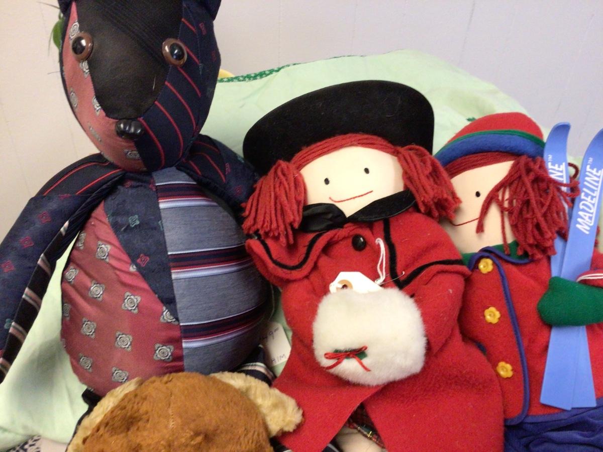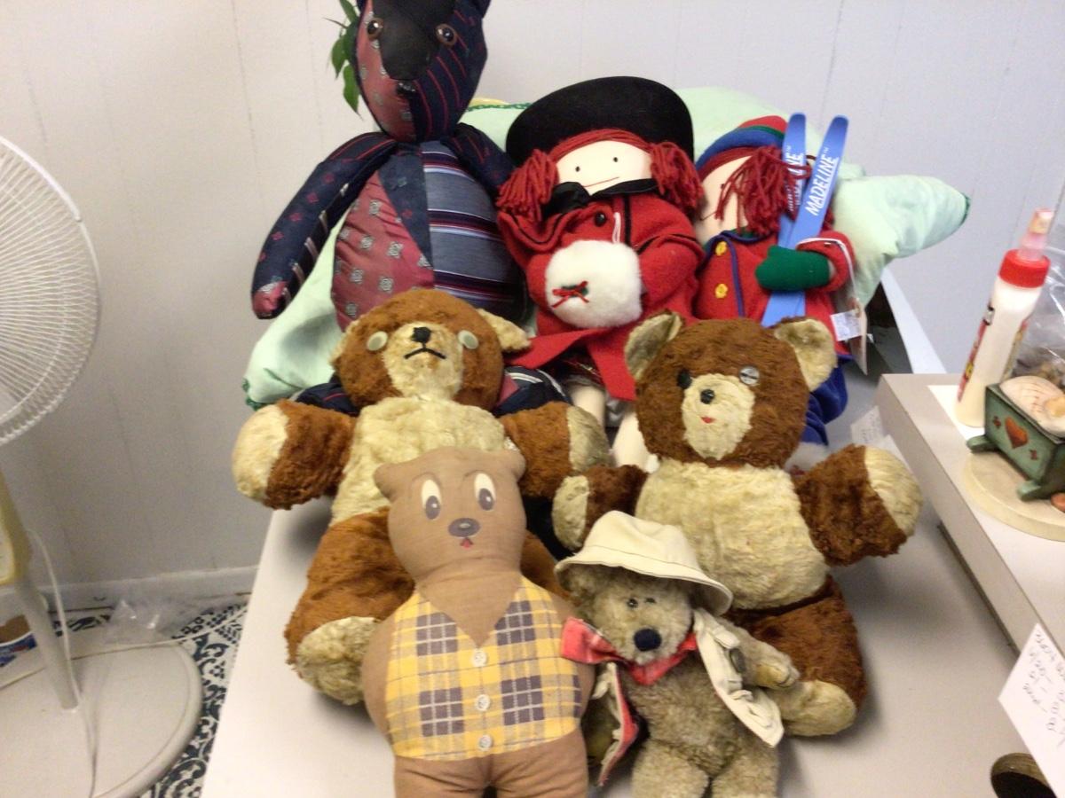 Two dolls, bear made of ties, two matching vintage bears Boyce’s Bear, another vintage bear.