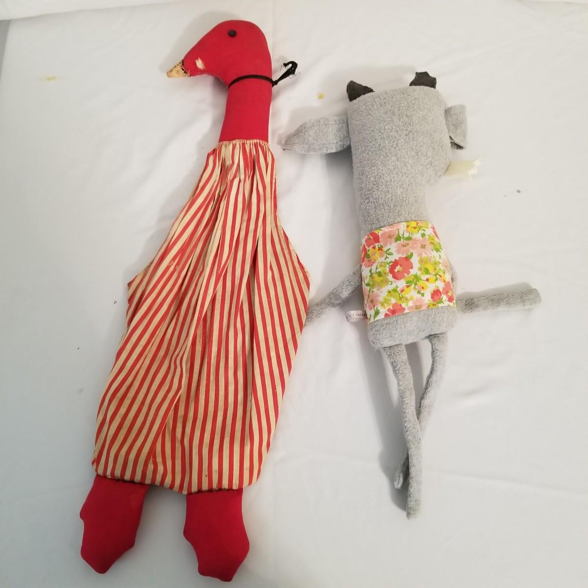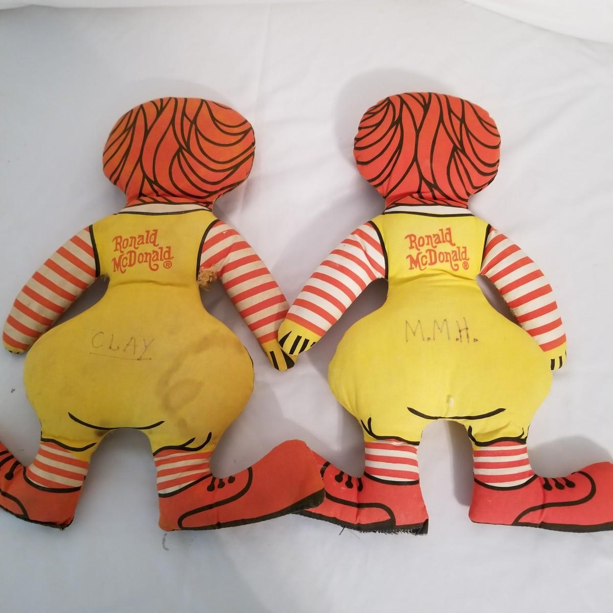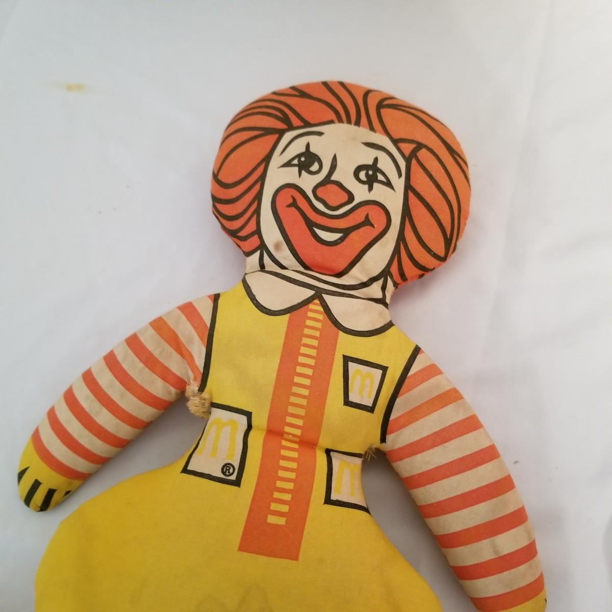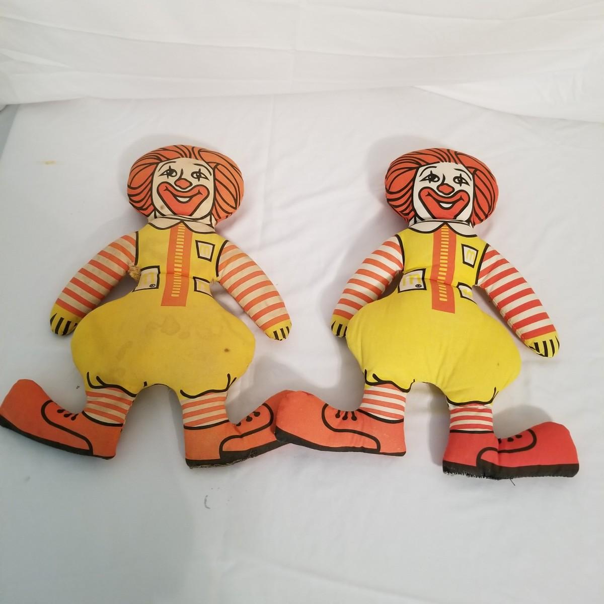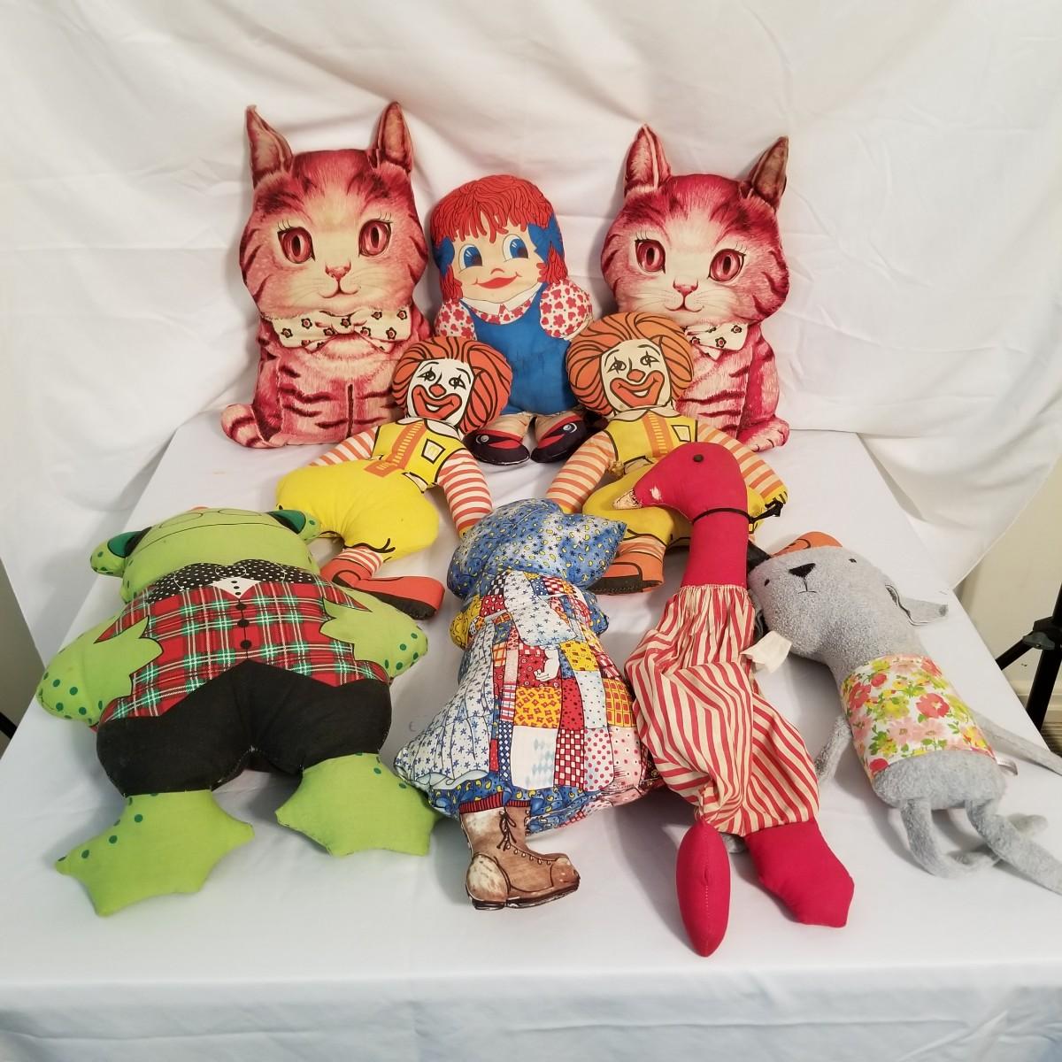 A collection of soft plush animals.  Two cats, a frog, a Holly Hobbie and two Ronald McDonalds, plus a red goose and more. Goose is 28" long, items mostly in good condition (note the wear on the Ronald McDonalds). Nine items total. Shipping available.
