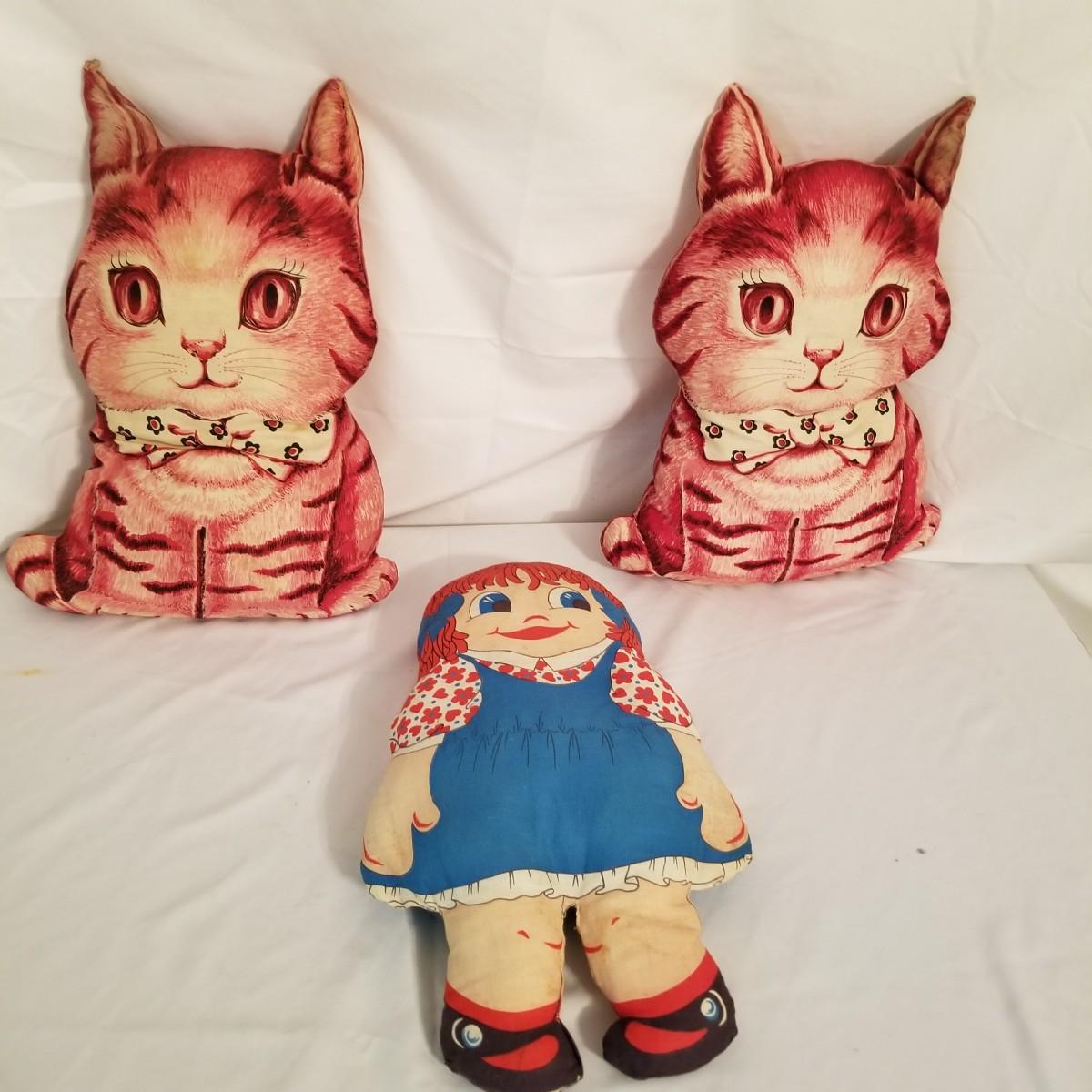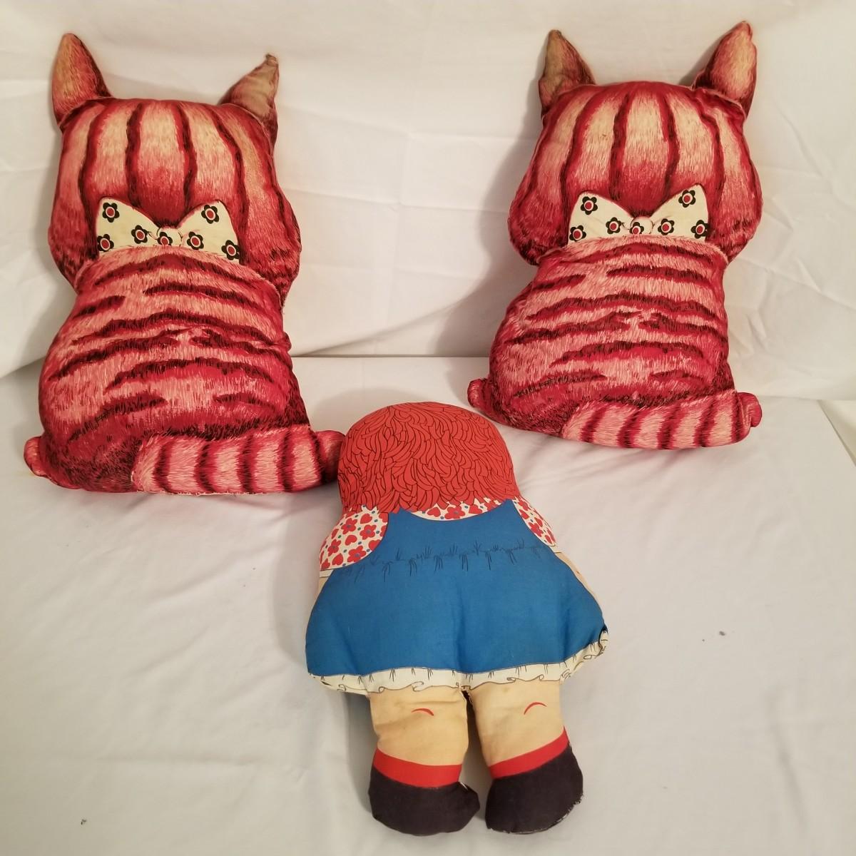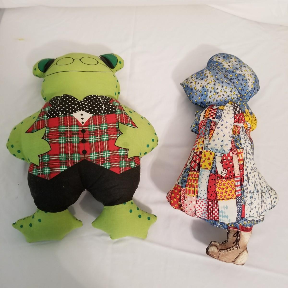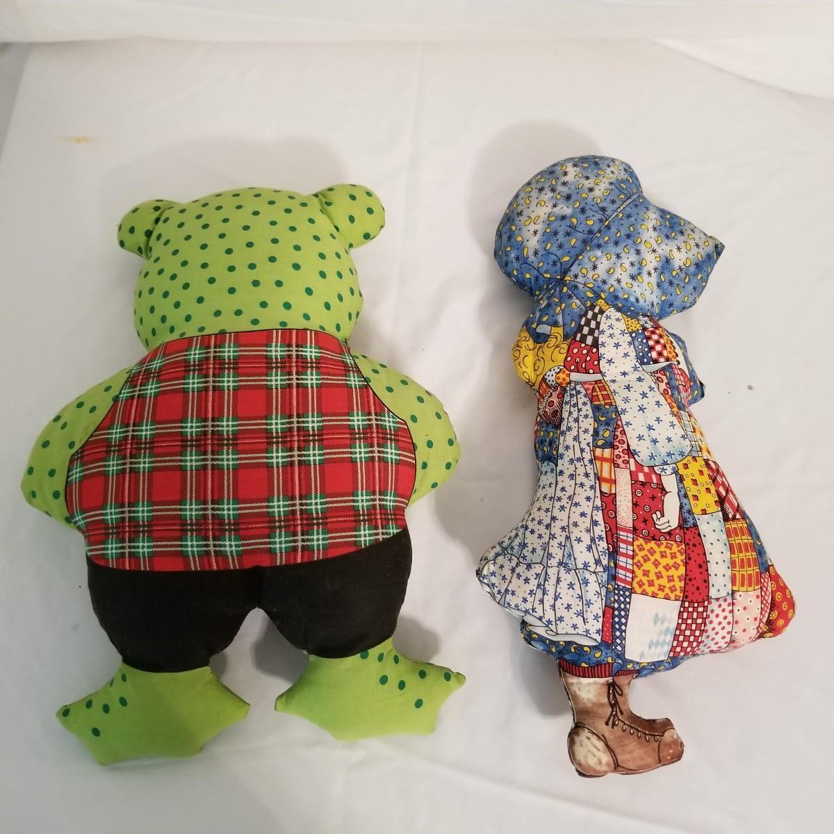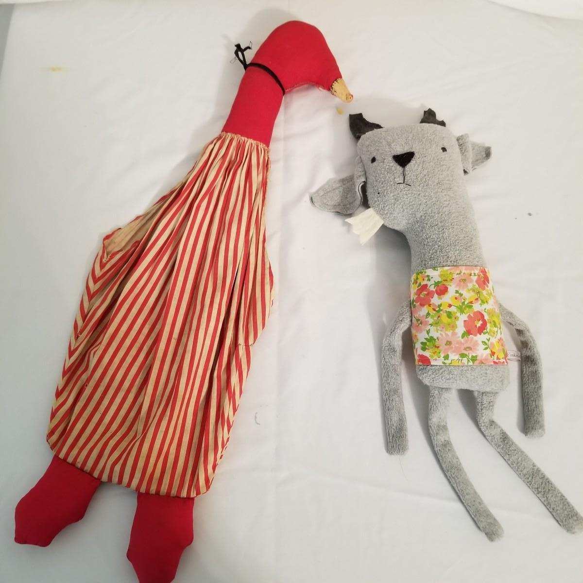 A collection of soft plush animals.  Two cats, a frog, a Holly Hobbie and two Ronald McDonalds, plus a red goose and more. Goose is 28" long, items mostly in good condition (note the wear on the Ronald McDonalds). Nine items total. Shipping available.