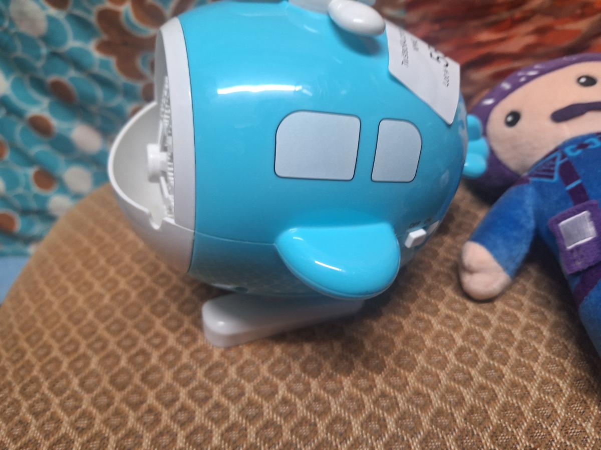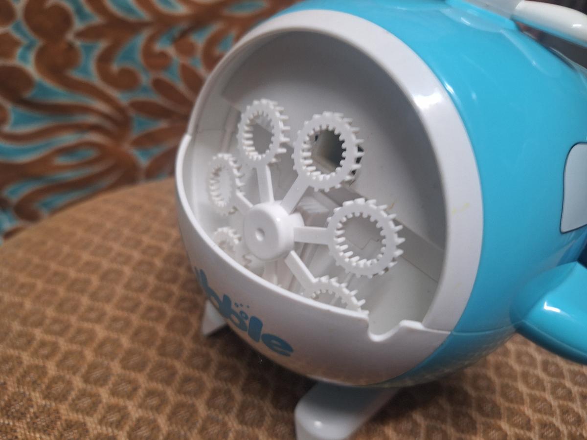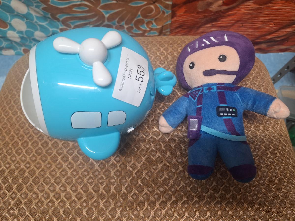 stuffed astronaut and a toy bubble maker shaped like a helicopter