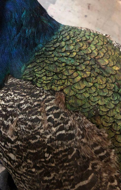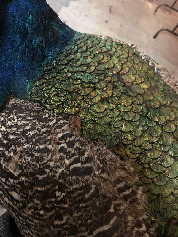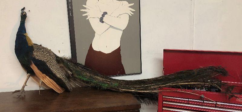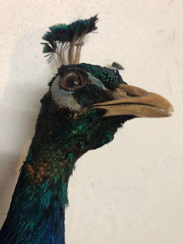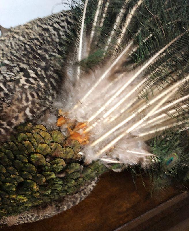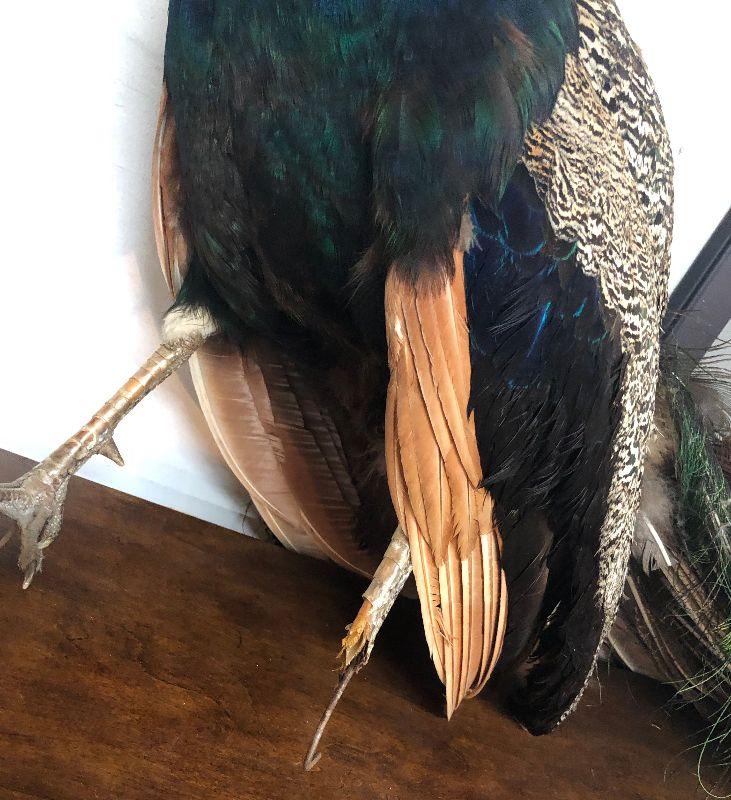 Here is a stuffed Peacock with beautiful plumage...needs repair..missing one foot(pictured)...Unique display...