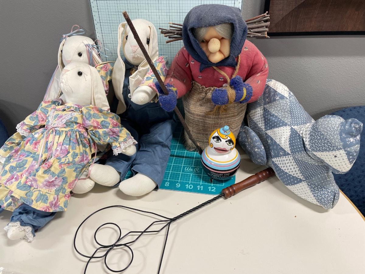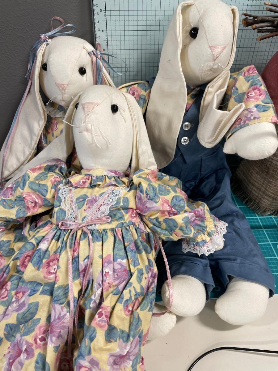 Stuffed rabbits, old lady and cat