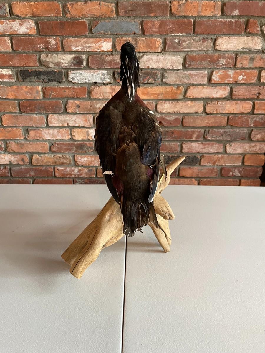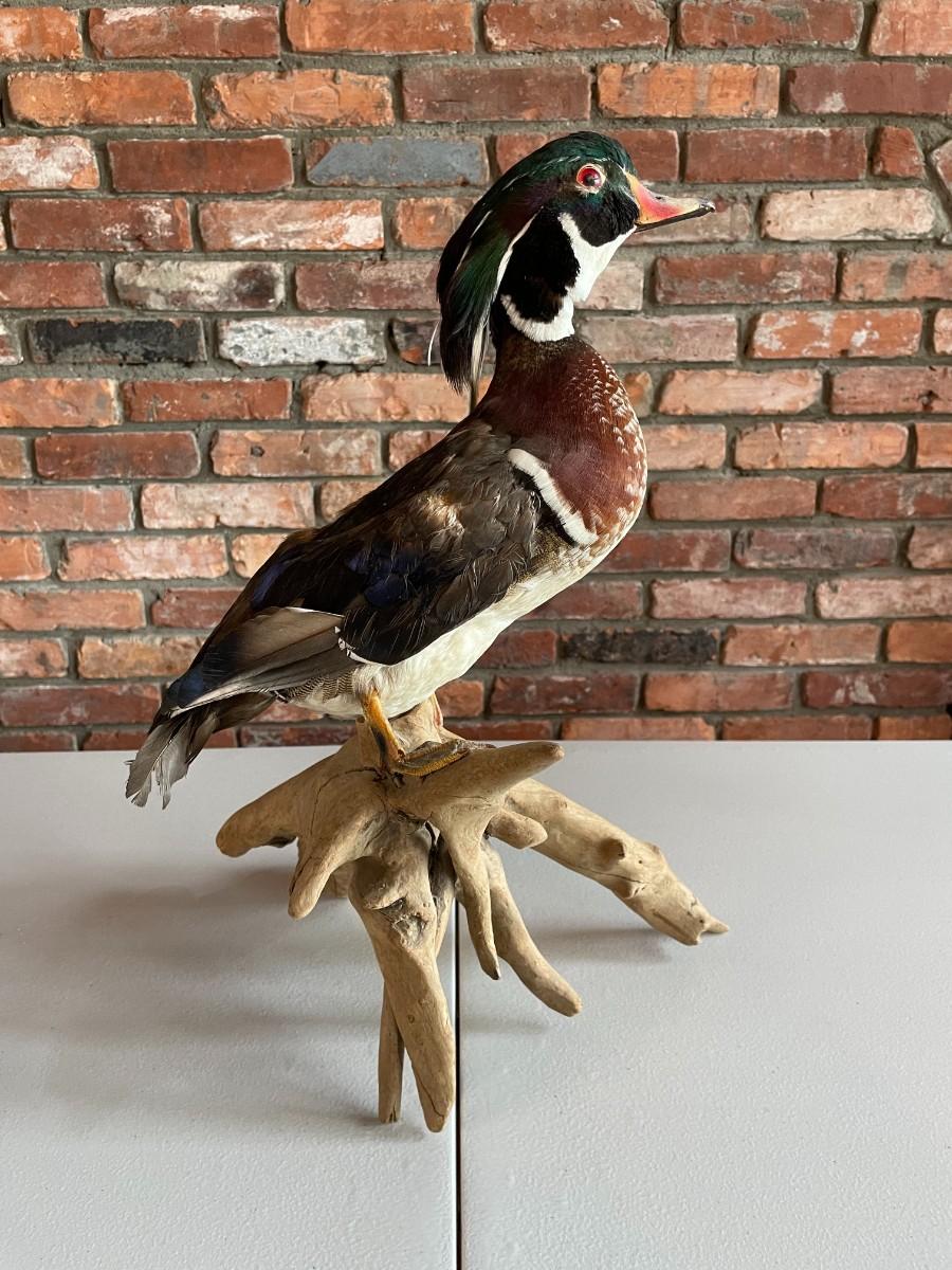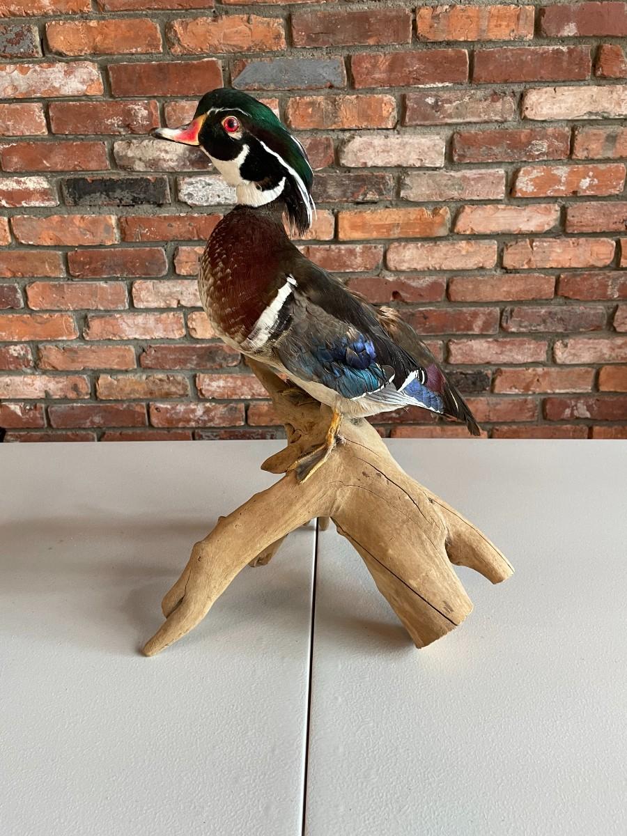 Beautiful and real stuffed wood duck on a branch. 15L x 5W x 17 1/2H.