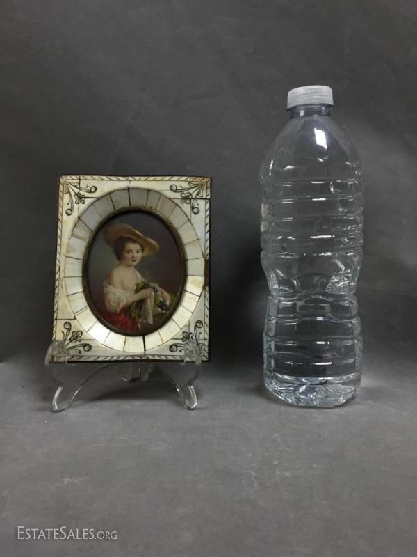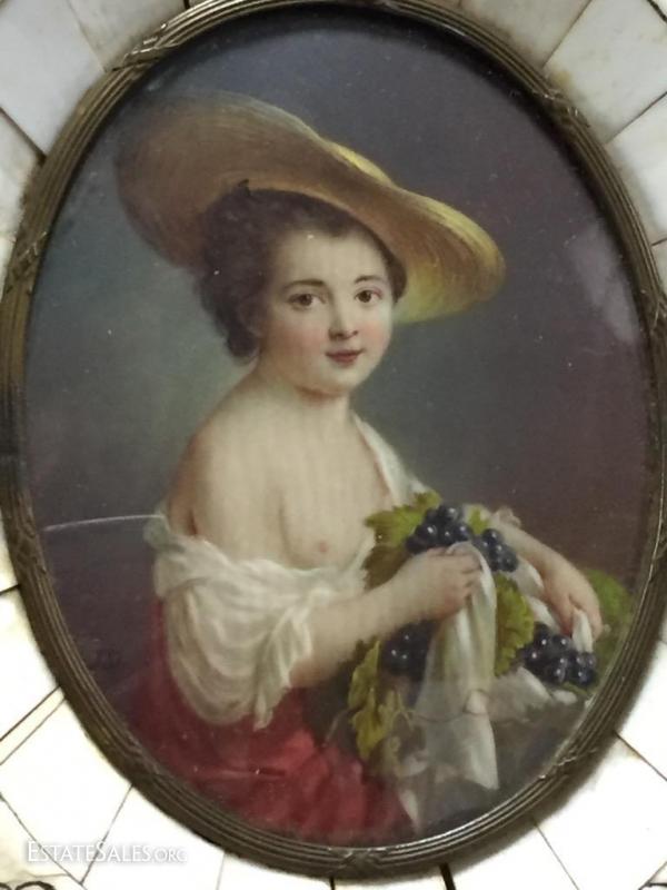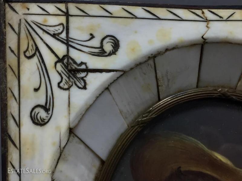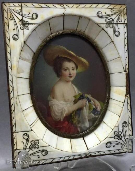 Stunning 19th century miniature portrait of child with grapes in carved bone frame with metal accents and curved glass 5 inches long
