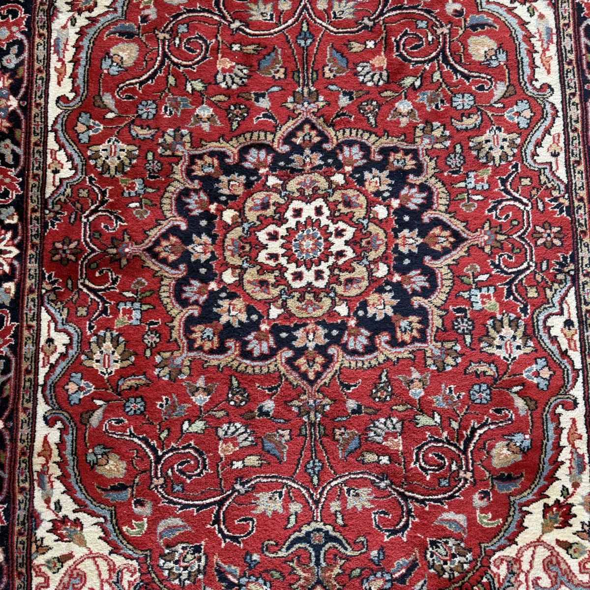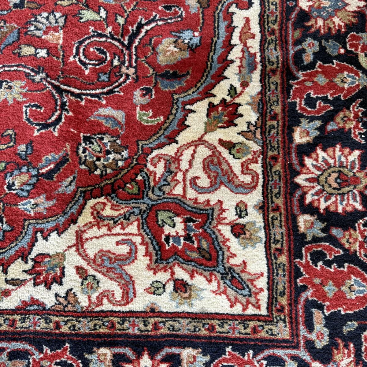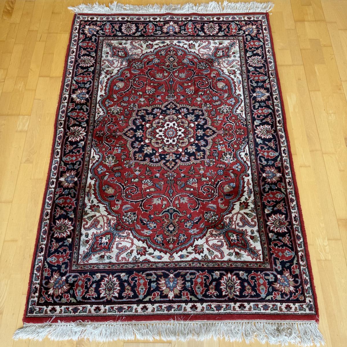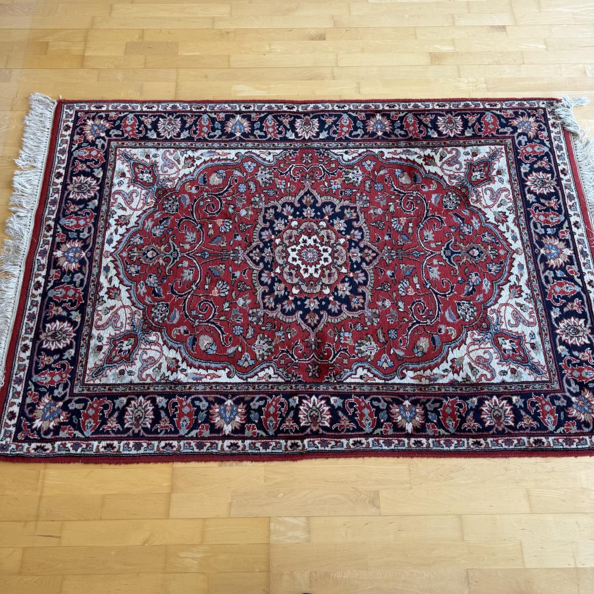The lot contains a stunning area rug. It features a vibrant ornate floral patters in navy, light blue, and red. This rug measures 4’1” x 6’. There are a couple spots of discoloration, see pictures for details. Shipping available.