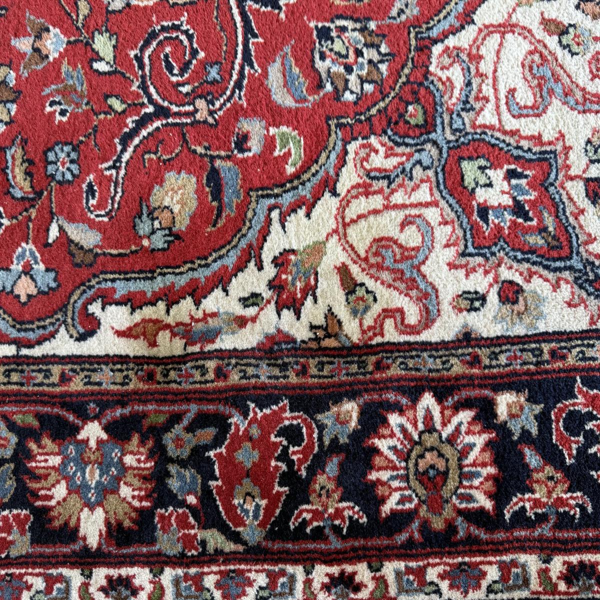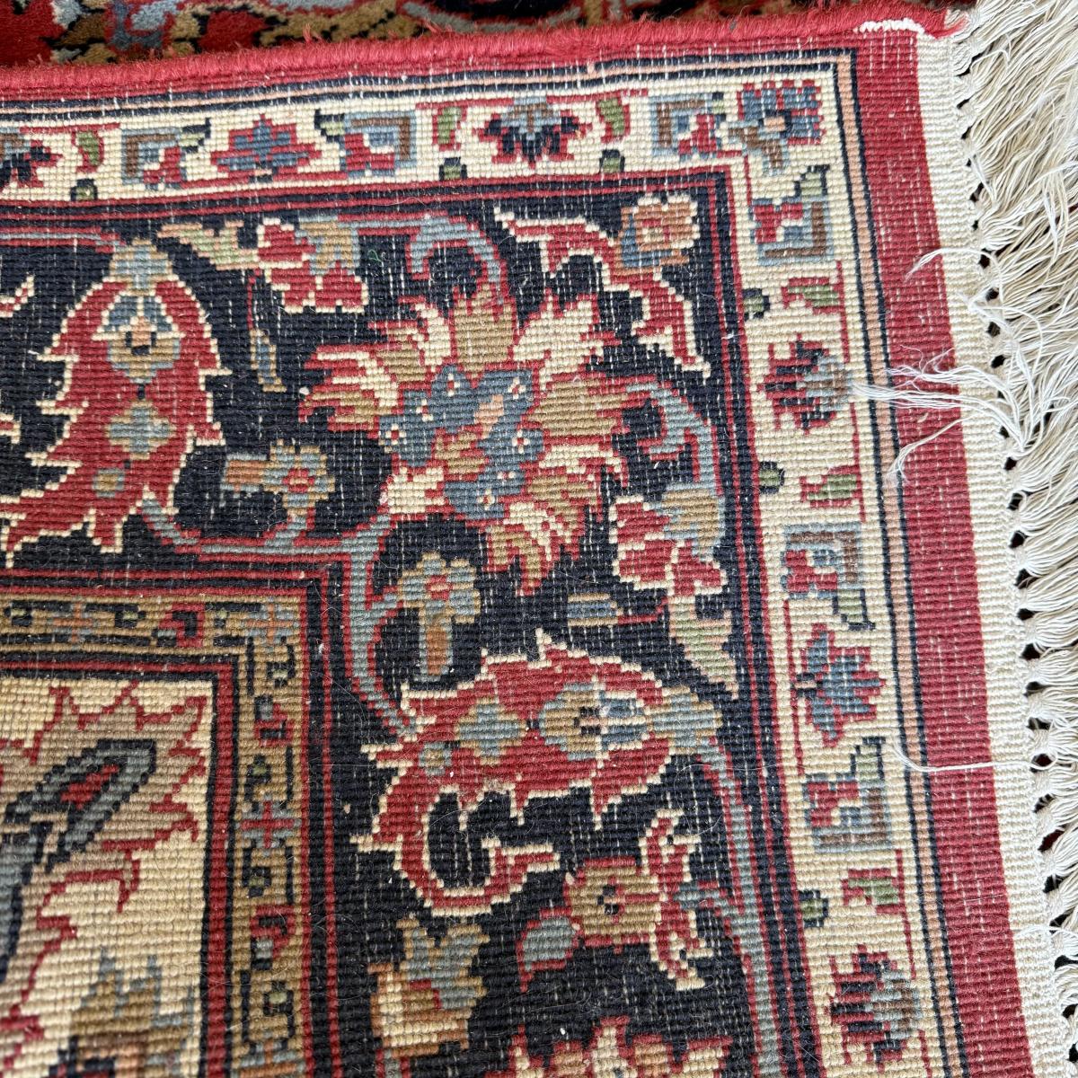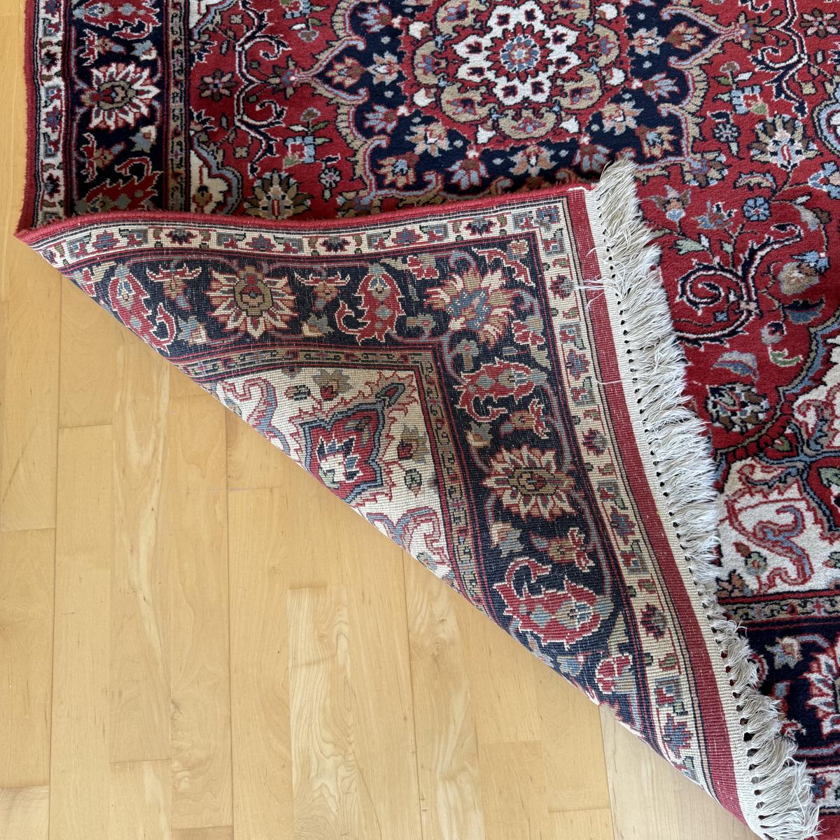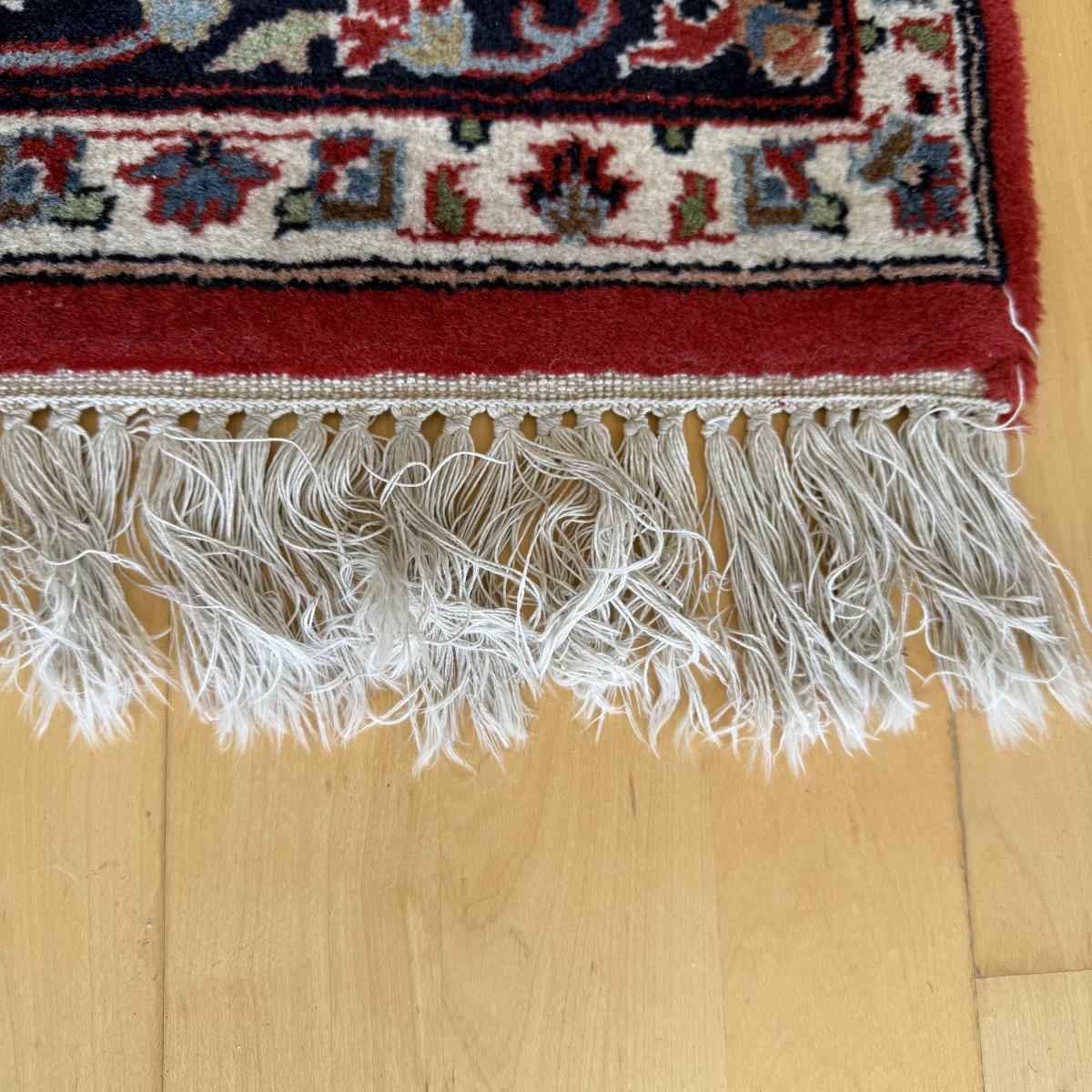 The lot contains a stunning area rug. It features a vibrant ornate floral patters in navy, light blue, and red. This rug measures 4’1” x 6’. There are a couple spots of discoloration, see pictures for details. Shipping available.