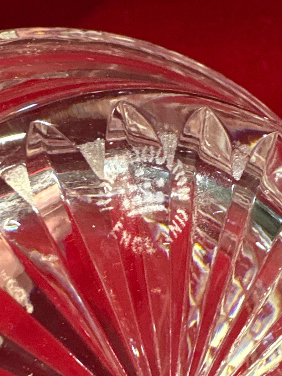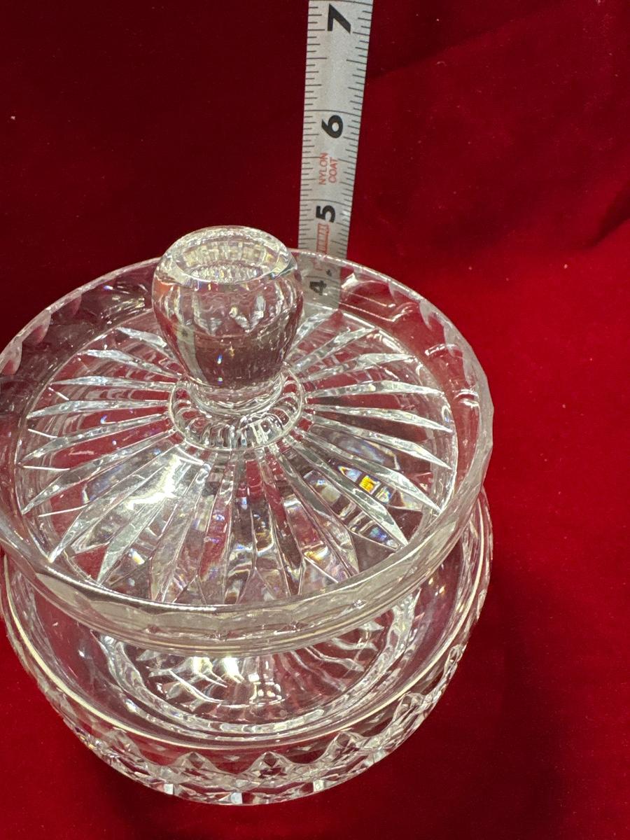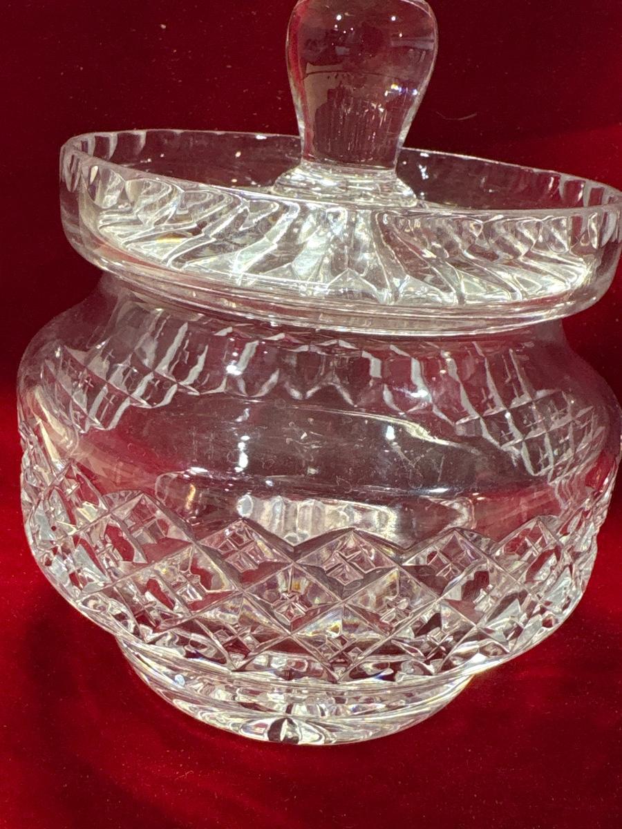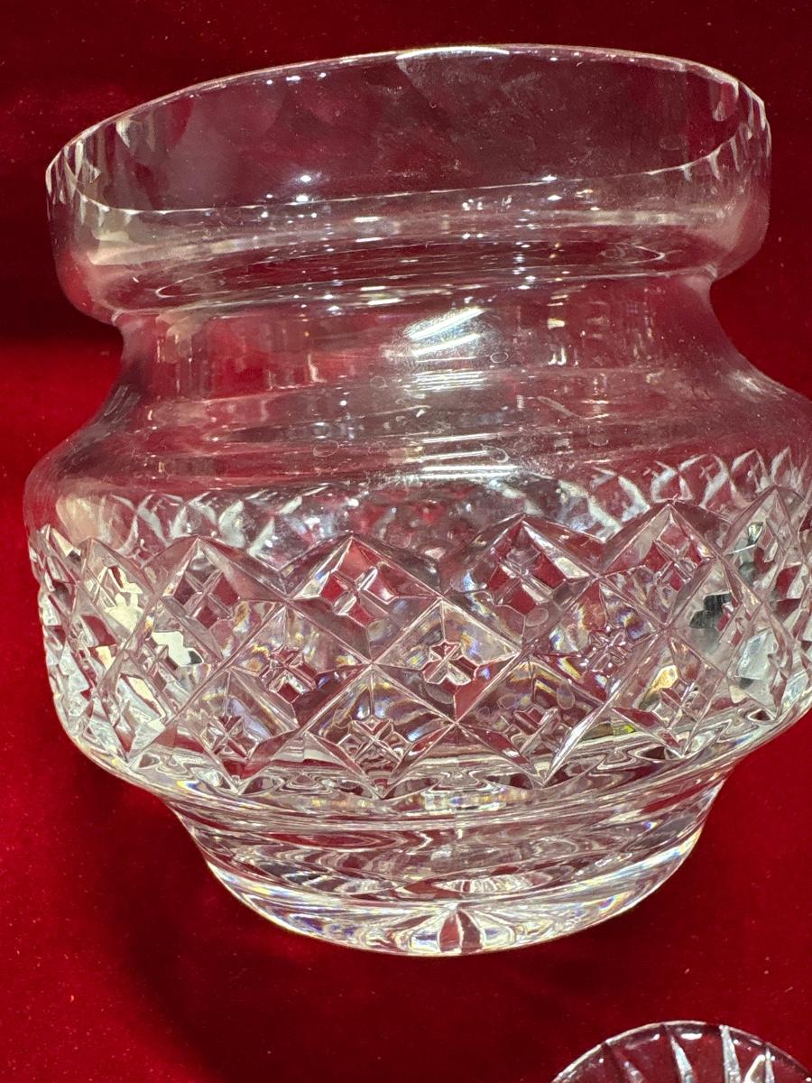 Signed lidded crystal biscuit barrel or jar. Intricate diamond cuts on base and linear cuts on lid.