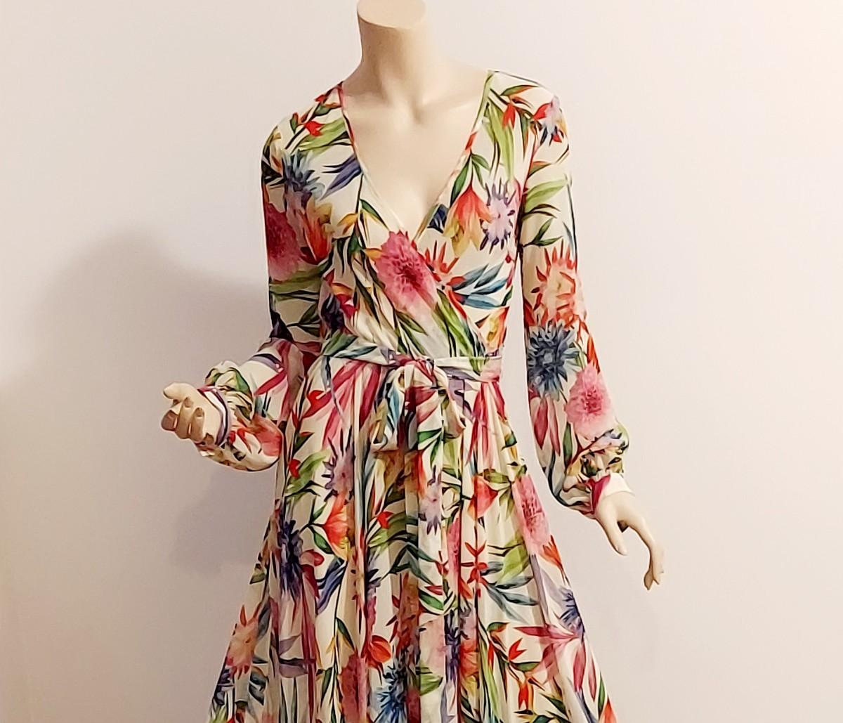 What a Beauty this Maxi flowy giwn is its a cross Vodice that fall fluid to a very full Amazing Skirt it is like and in like New Cobdition maybe used once or not. It is a Stunner