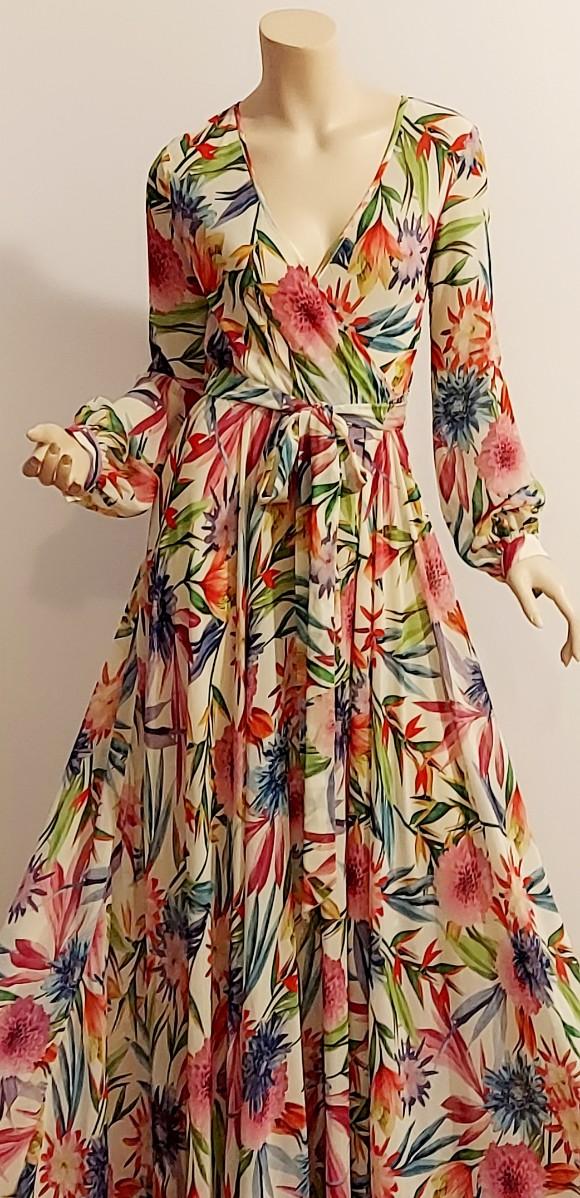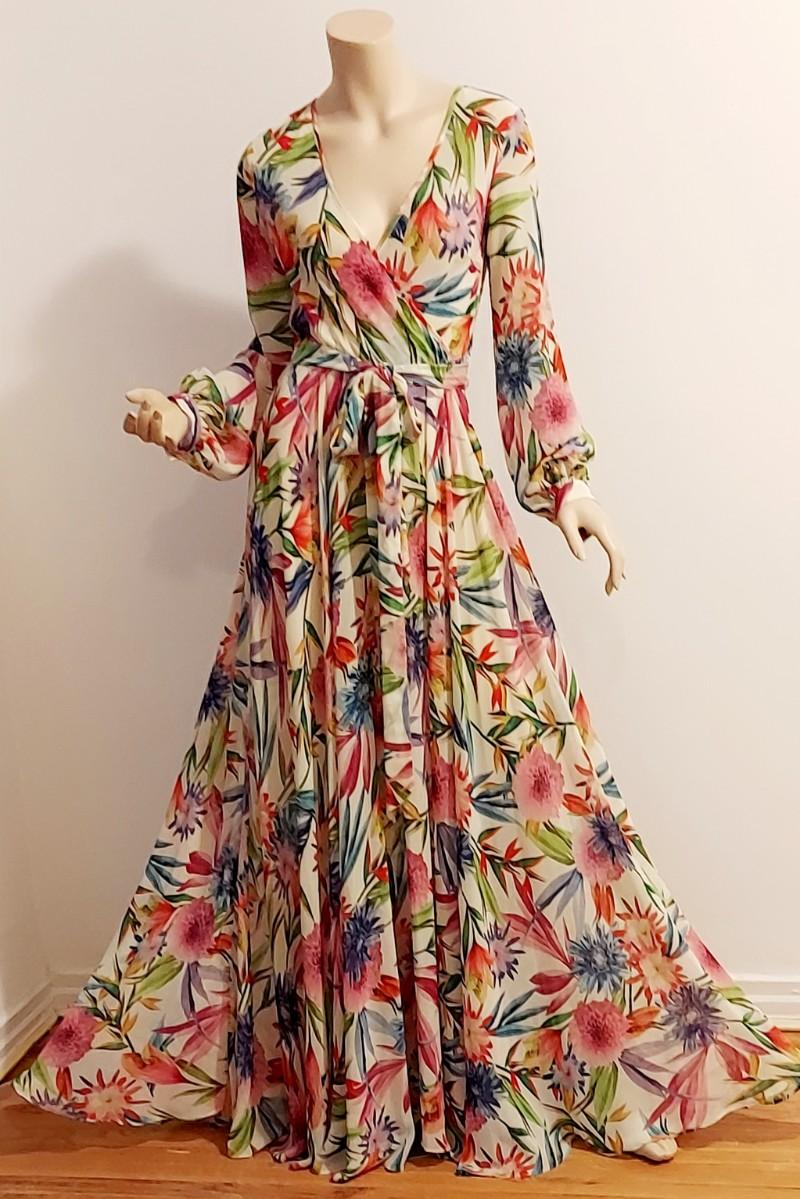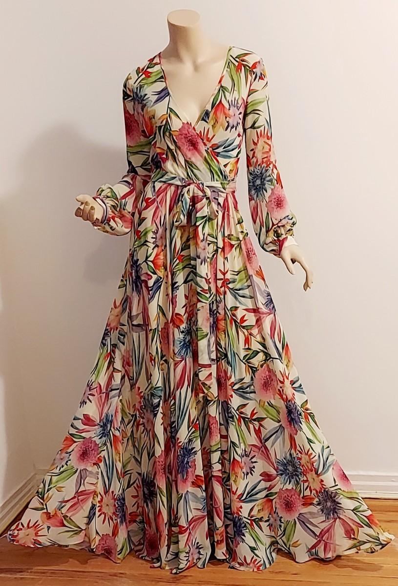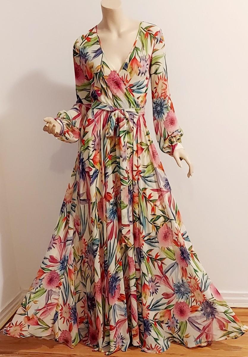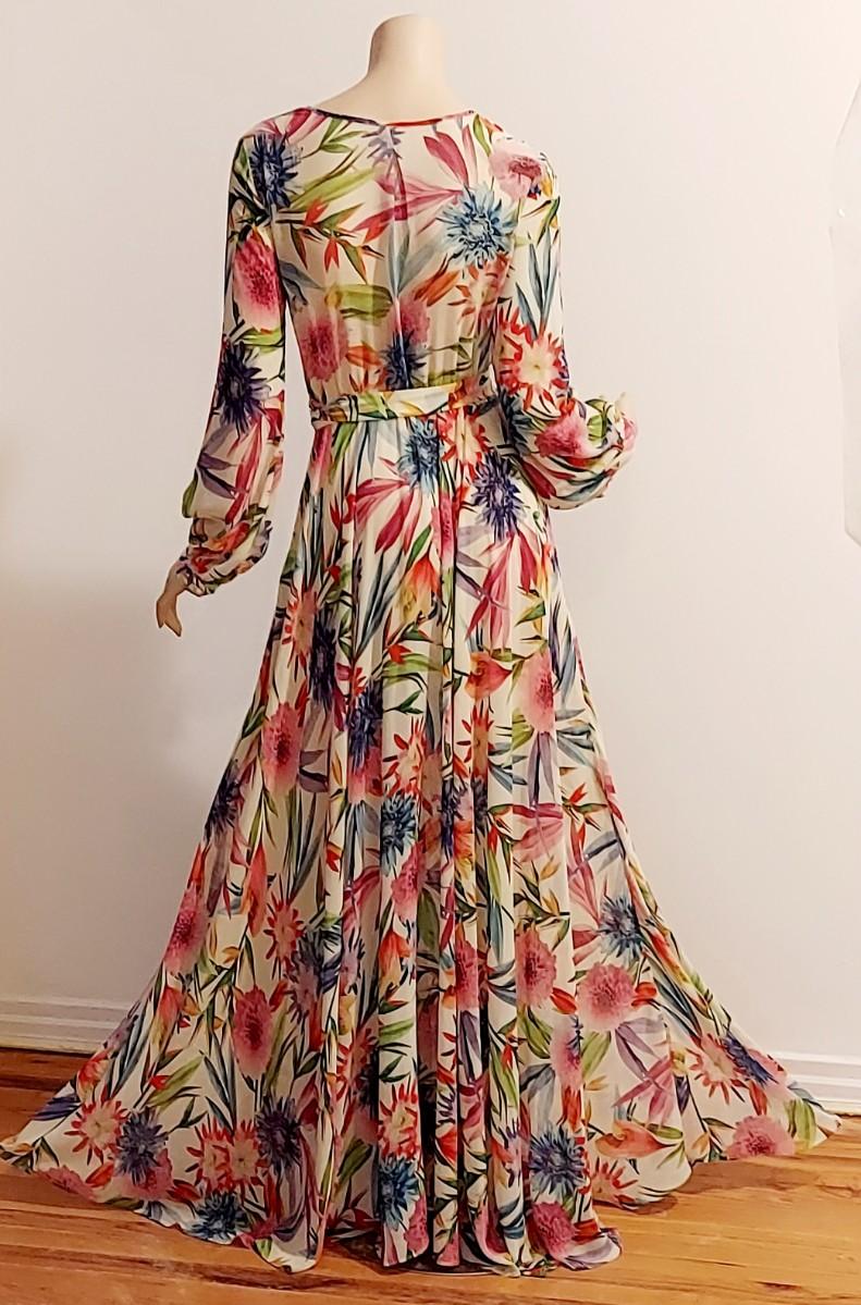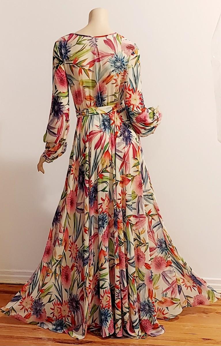 What a Beauty this Maxi flowy giwn is its a cross Vodice that fall fluid to a very full Amazing Skirt it is like and in like New Cobdition maybe used once or not. It is a Stunner