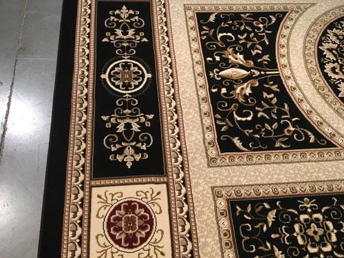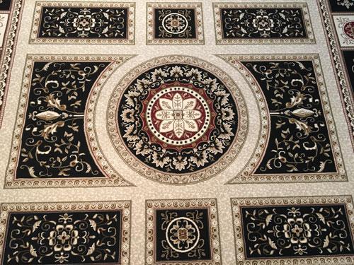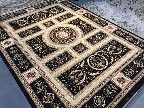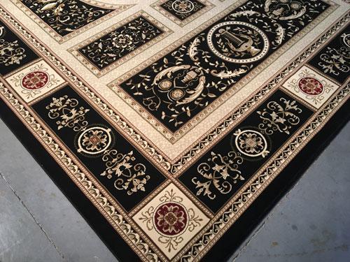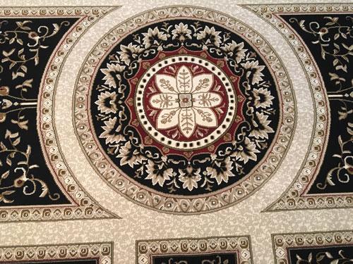 8x11 grand French Palace Design Brand Name Rug, Premium thick and high Resolution 1.0 million ppsm Quality in ,Black, Gold, Ivory and Burgundy highLighted Colors,Durable and easy to care polyproplene Pile Power Loomed in Turkey.