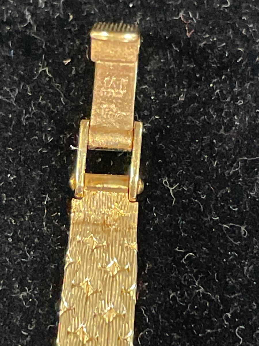 This watch is 14k gold and has 8 sparkling diamonds and is stunning!