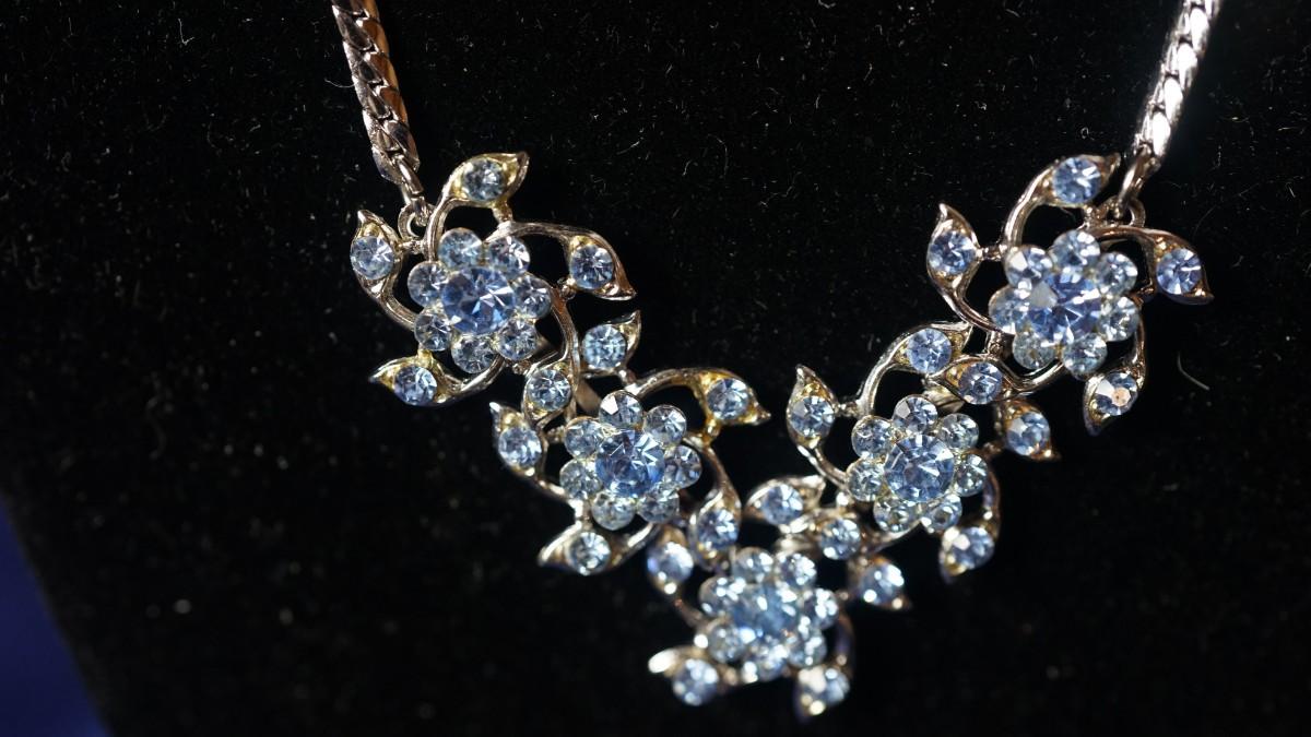 Includes four necklaces, one large brooch style pins, two pairs of earrings and a bracelet.