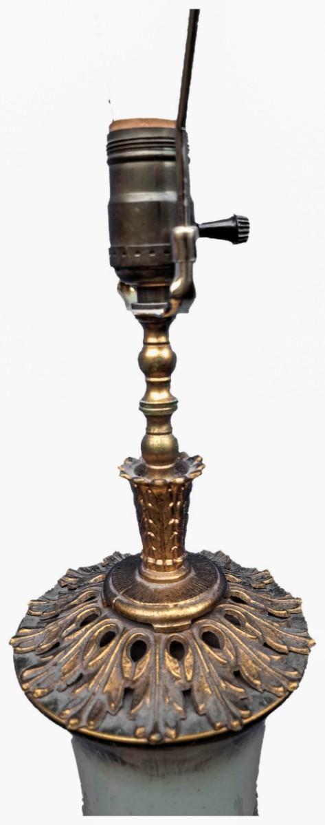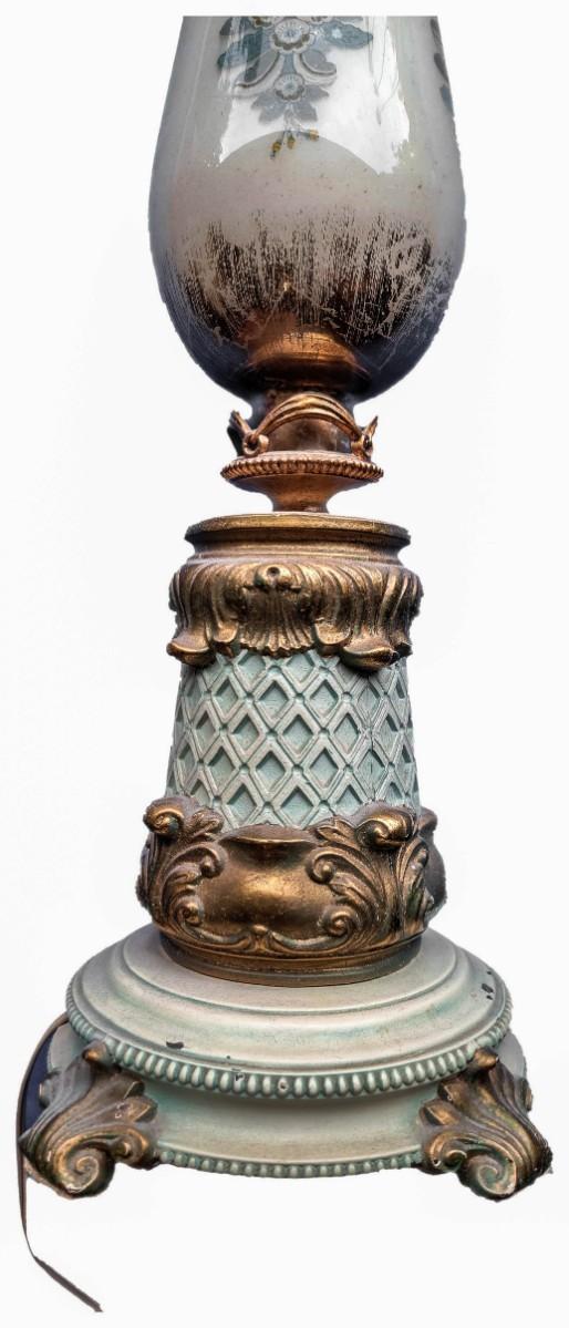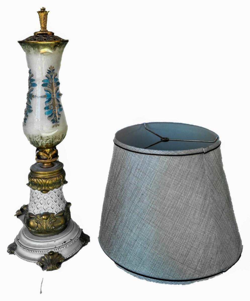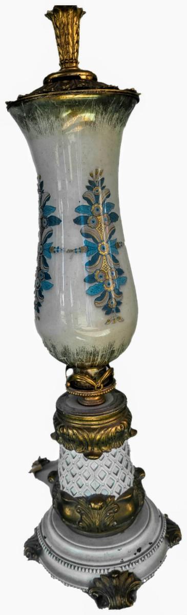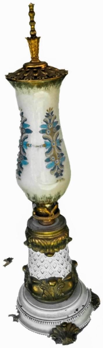 Measures about 30" in height, has a diameter of about 5 "and the base has a diameter of 10". Probably European given the design, made of porcelain and ceramic bottom. IN VG conditions, not tested.