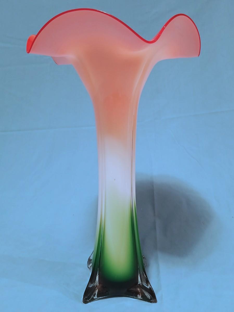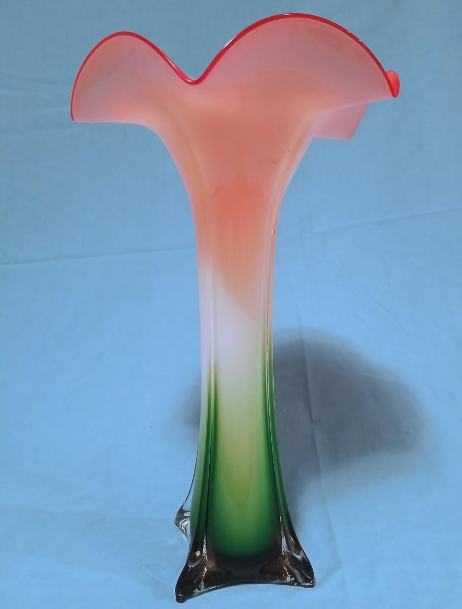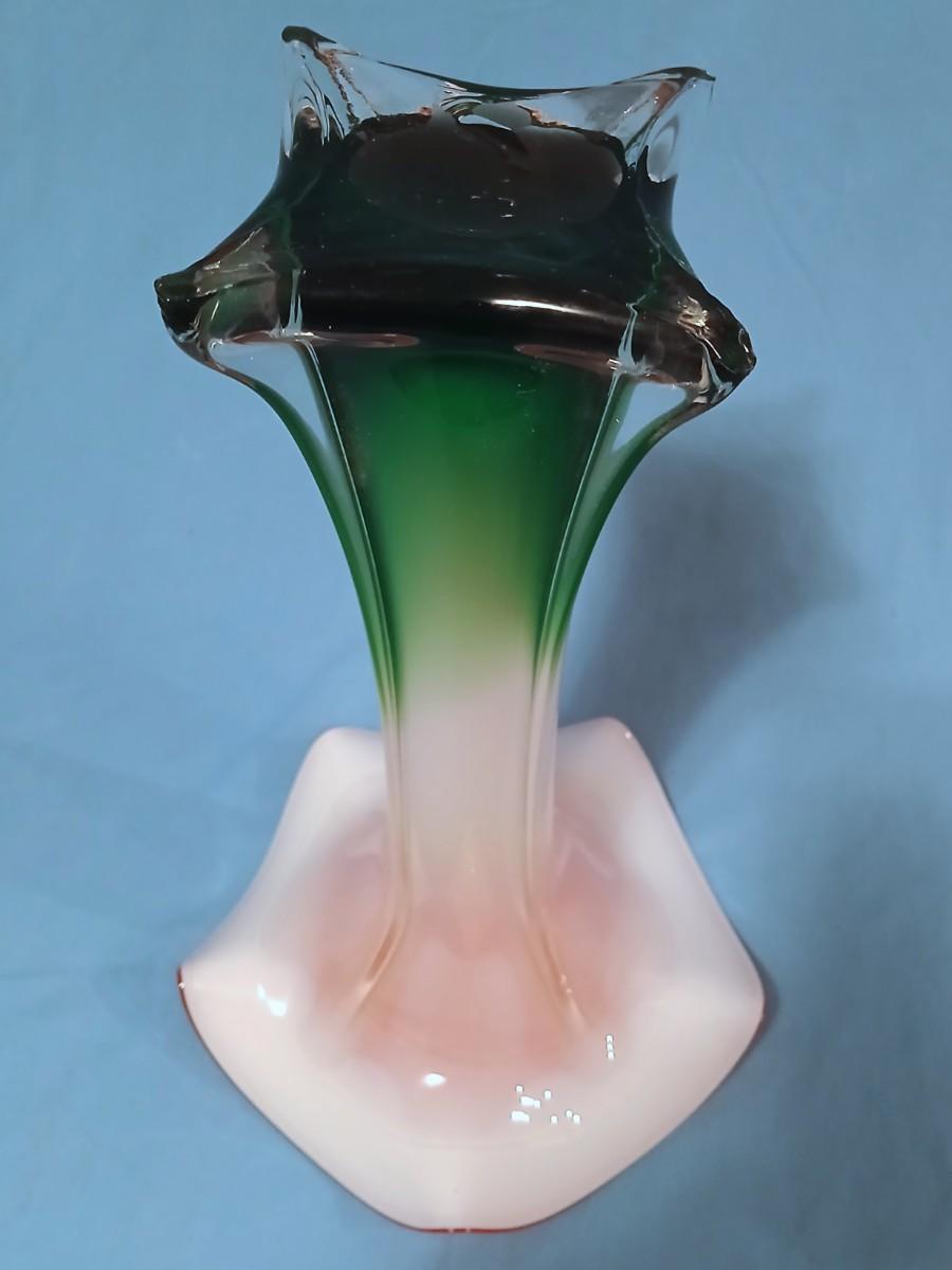Stunning Handblown Jack in the Pulpit Glass Vase - Cased Glass Clear Over Green, White and Pink