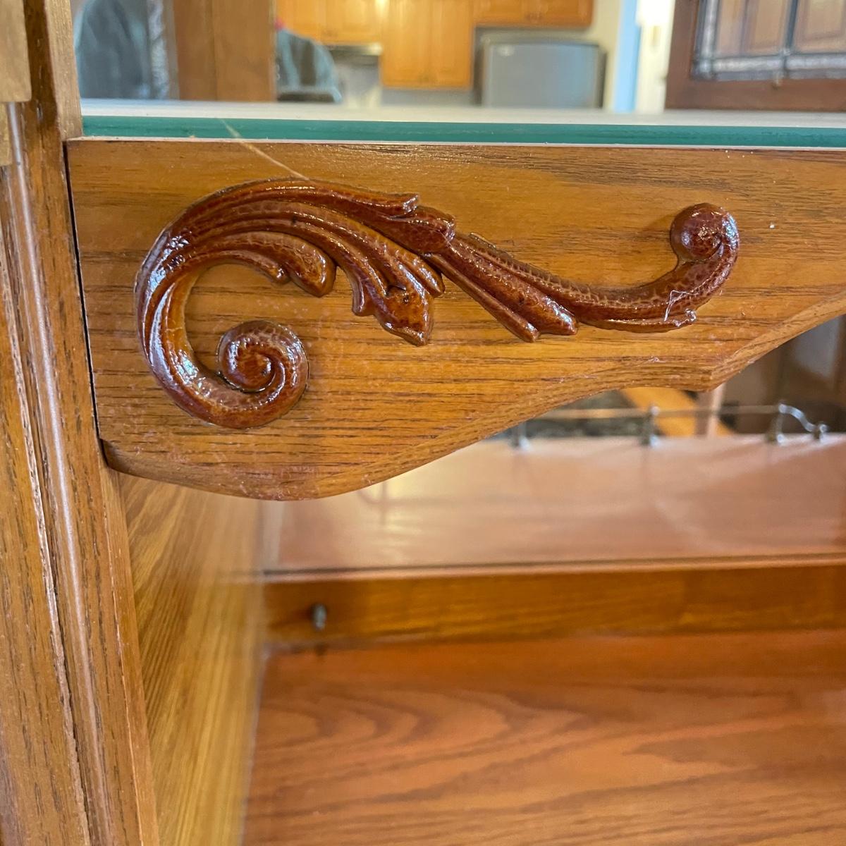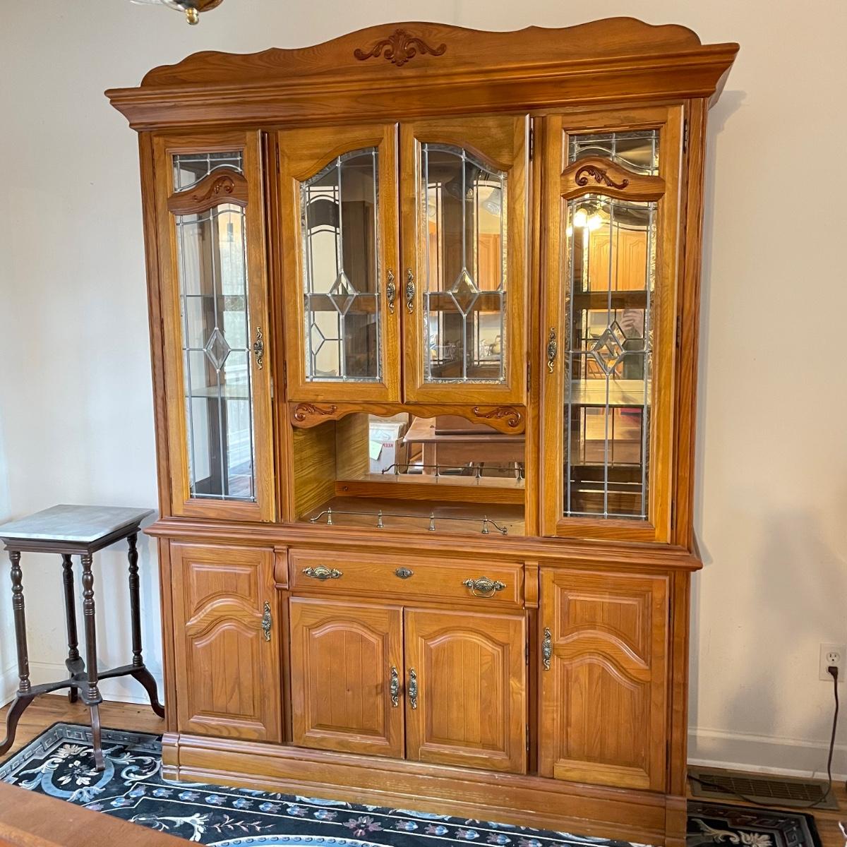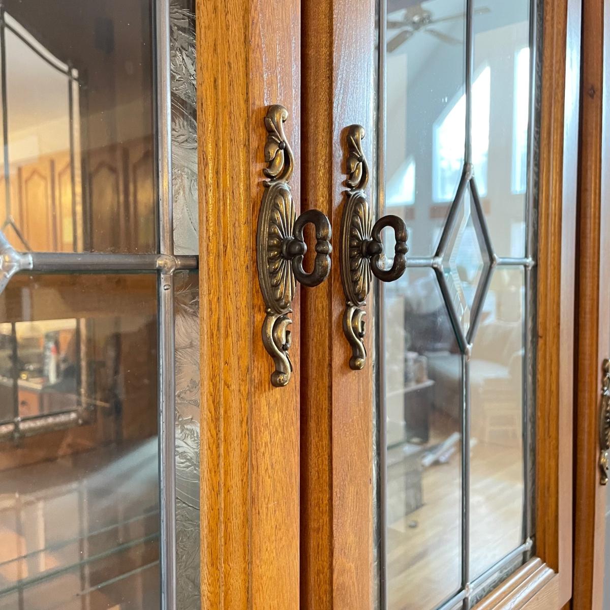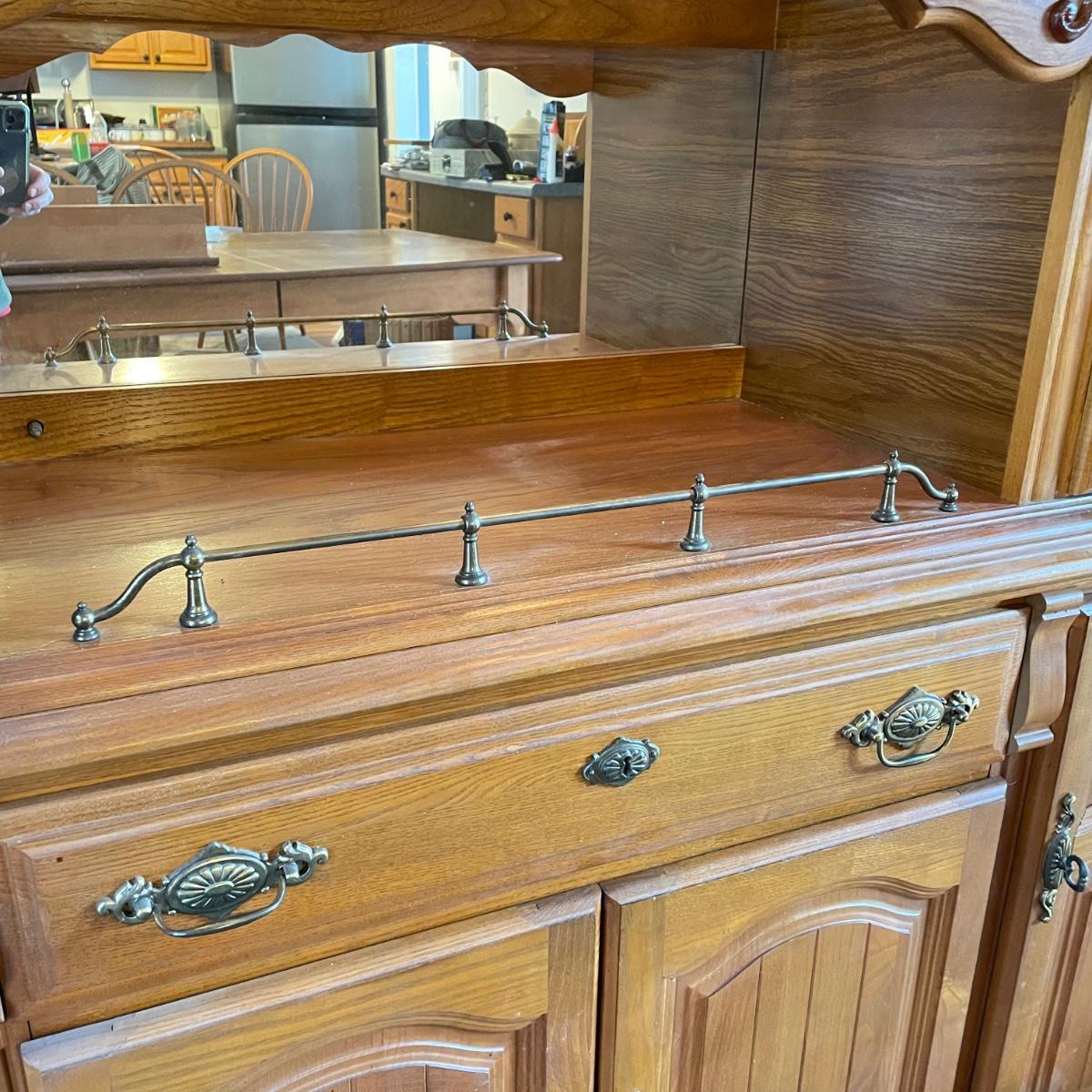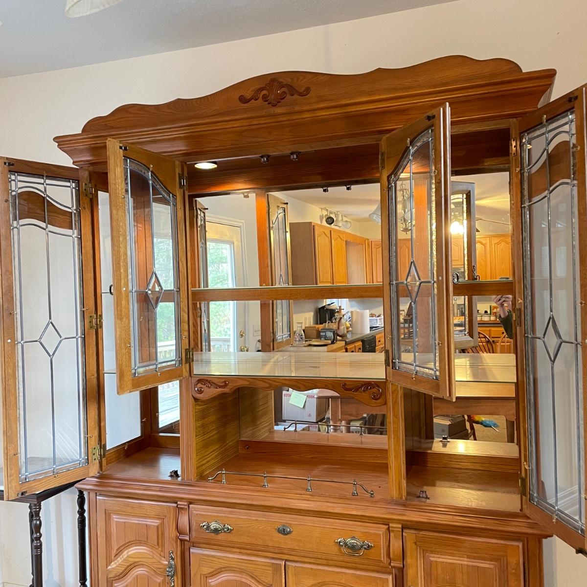 Stunning hutch with leaded glass doors, metal flair and excellent storage. The bottom of the hutch has one drawer and four doors to a single cabinet with a fixed shelf. The drawer has a lock, but a key is not included. The top has a unique single cabinet with two fixed glass shelves and a mirror backing with two working lights. The glass shelves each have a plate ridge to display your China or decor. Some blemishes are found along the bottom near the floor, the upper part is in very nice condition. Piece measures 62” x 17” x 78”. Piece is extremely heavy, please bring help to load, participants will need to navigate a flight of stairs off the porch. Local pick up only.