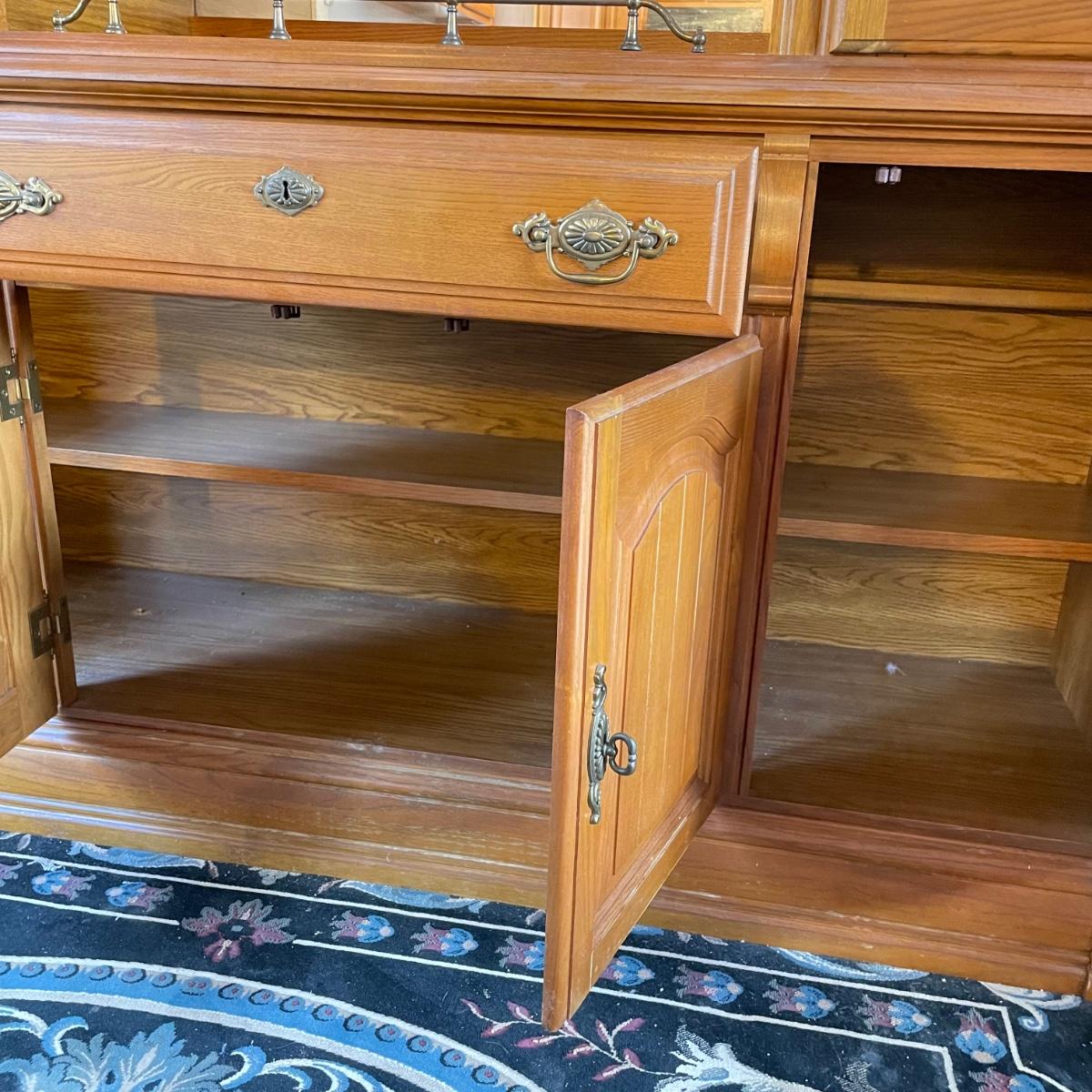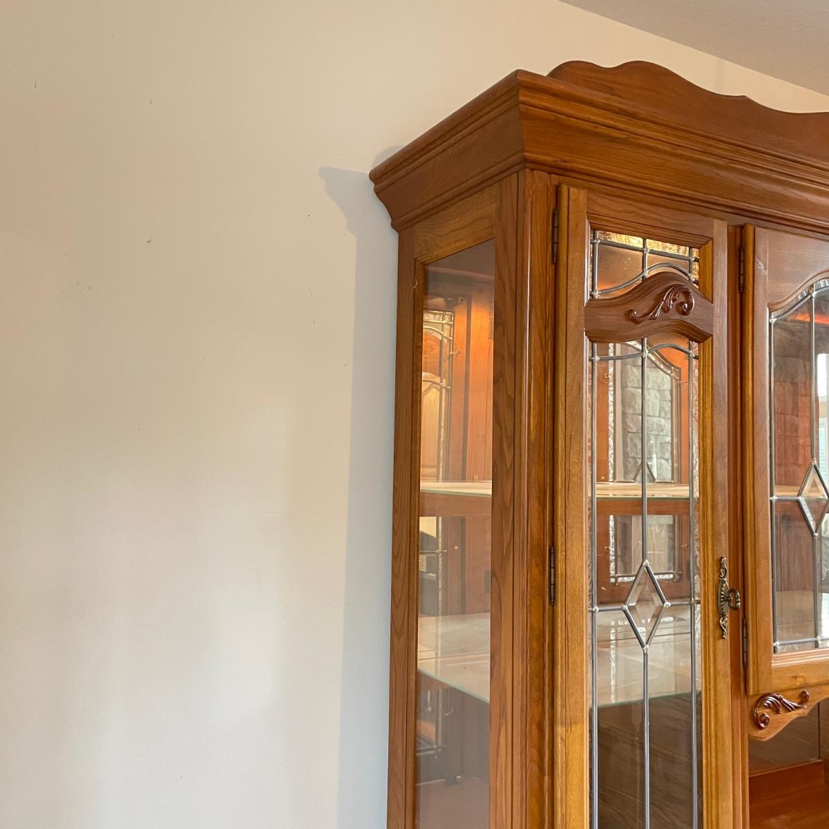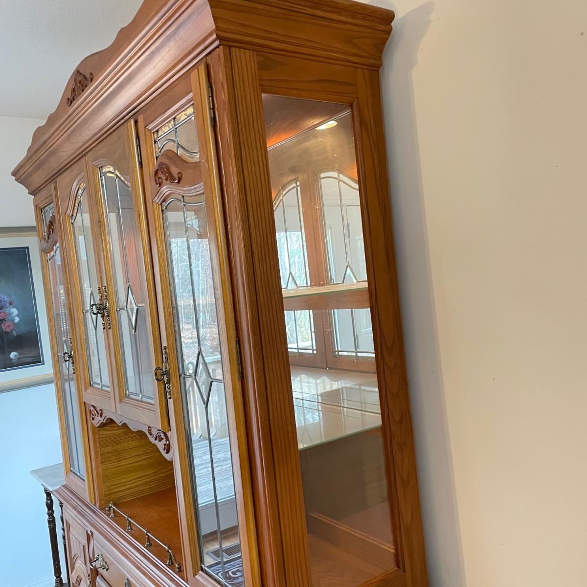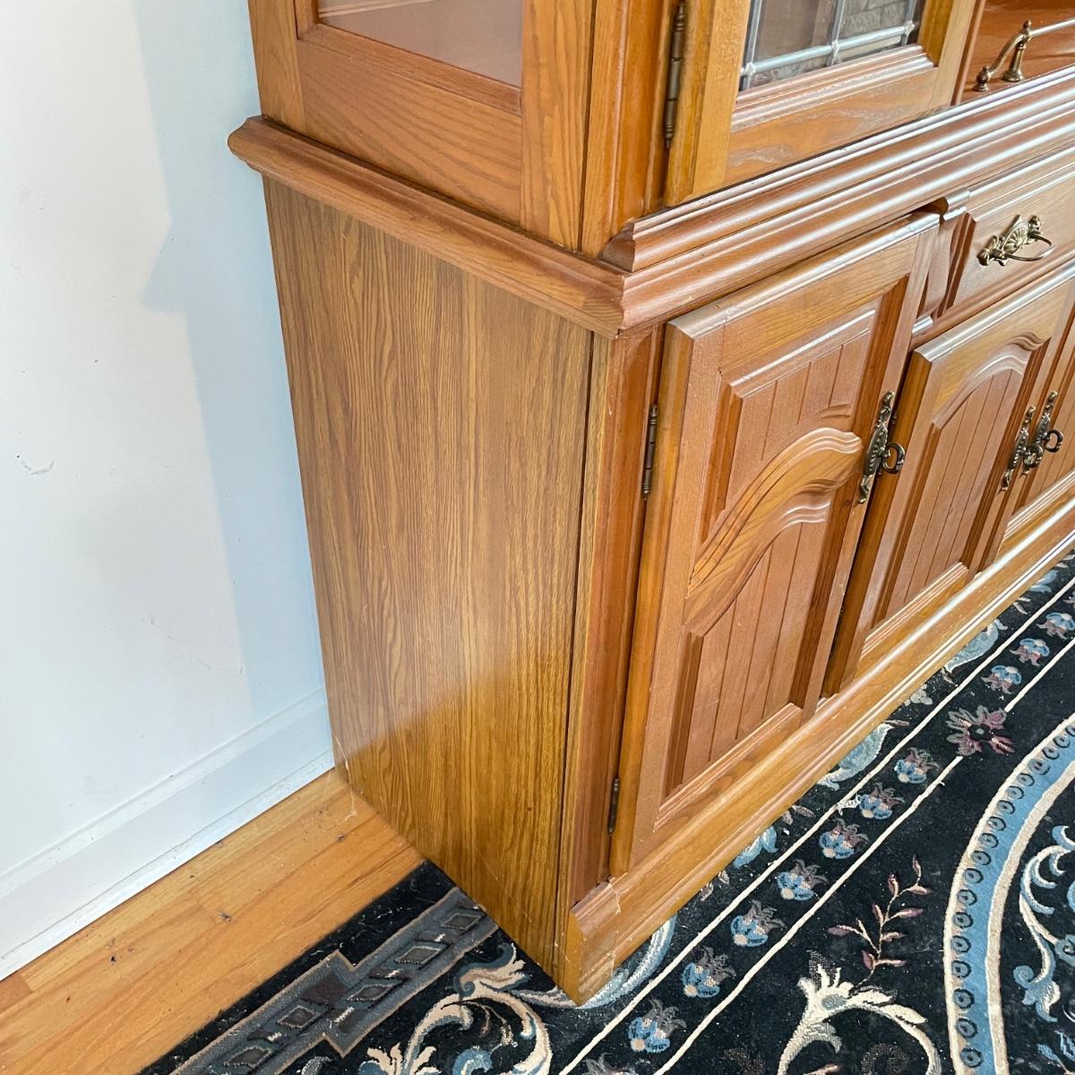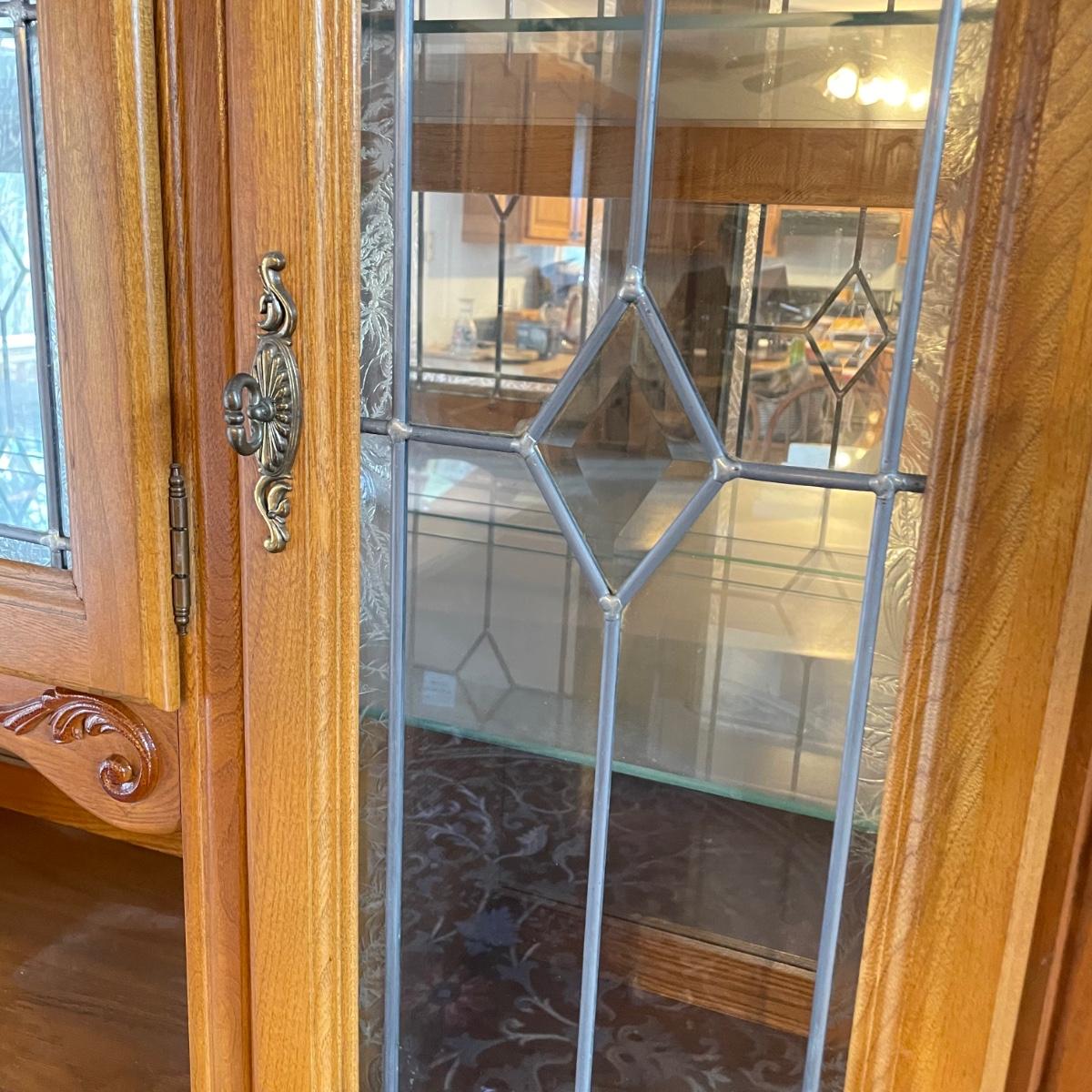 Stunning hutch with leaded glass doors, metal flair and excellent storage. The bottom of the hutch has one drawer and four doors to a single cabinet with a fixed shelf. The drawer has a lock, but a key is not included. The top has a unique single cabinet with two fixed glass shelves and a mirror backing with two working lights. The glass shelves each have a plate ridge to display your China or decor. Some blemishes are found along the bottom near the floor, the upper part is in very nice condition. Piece measures 62” x 17” x 78”. Piece is extremely heavy, please bring help to load, participants will need to navigate a flight of stairs off the porch. Local pick up only.