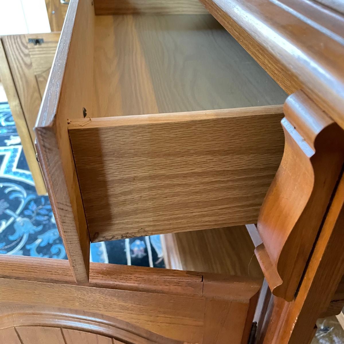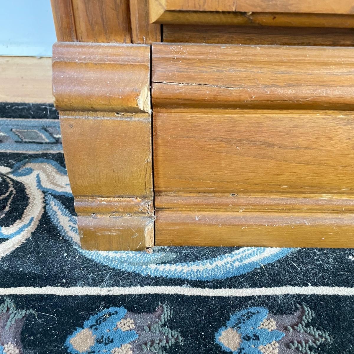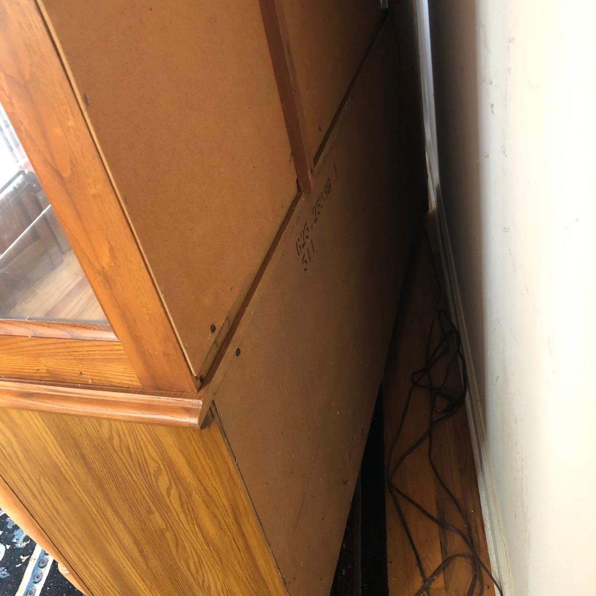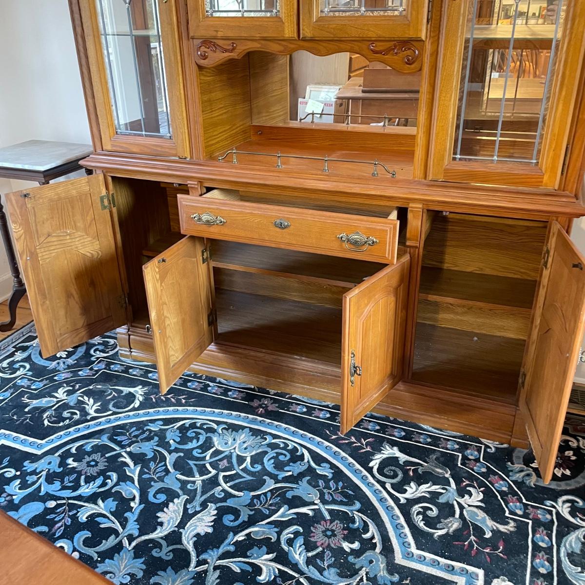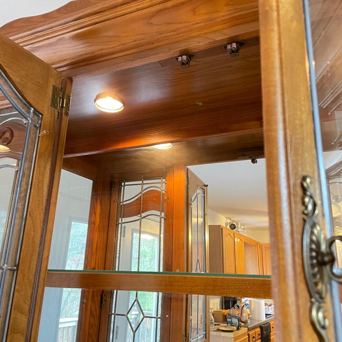 Stunning hutch with leaded glass doors, metal flair and excellent storage. The bottom of the hutch has one drawer and four doors to a single cabinet with a fixed shelf. The drawer has a lock, but a key is not included. The top has a unique single cabinet with two fixed glass shelves and a mirror backing with two working lights. The glass shelves each have a plate ridge to display your China or decor. Some blemishes are found along the bottom near the floor, the upper part is in very nice condition. Piece measures 62” x 17” x 78”. Piece is extremely heavy, please bring help to load, participants will need to navigate a flight of stairs off the porch. Local pick up only.