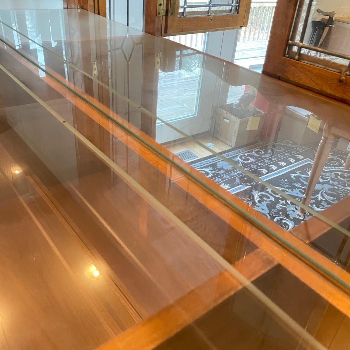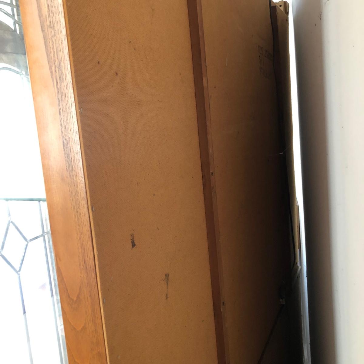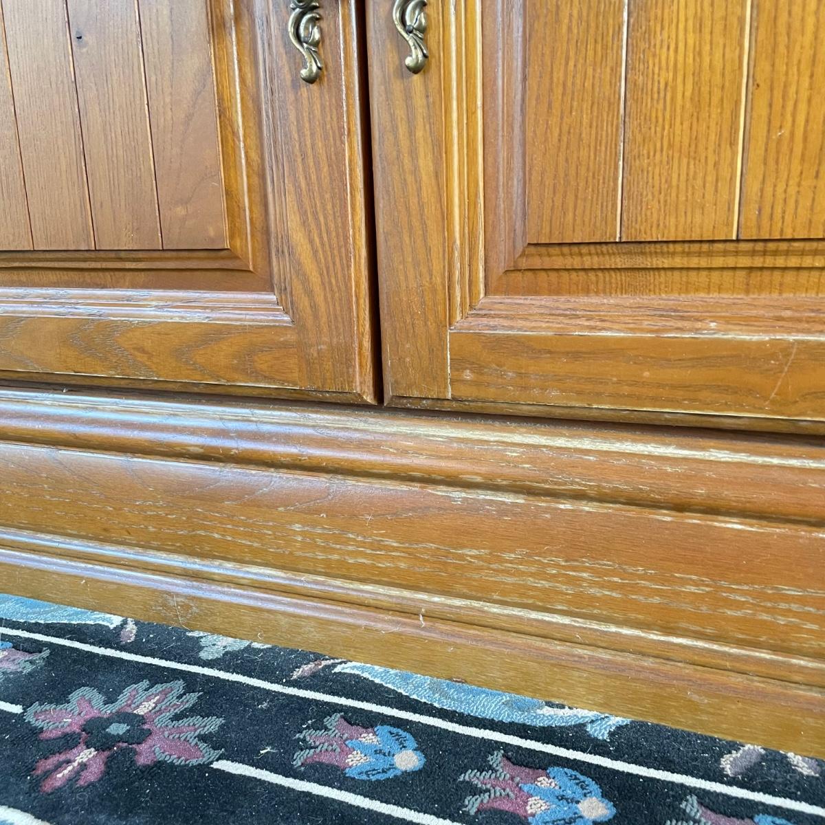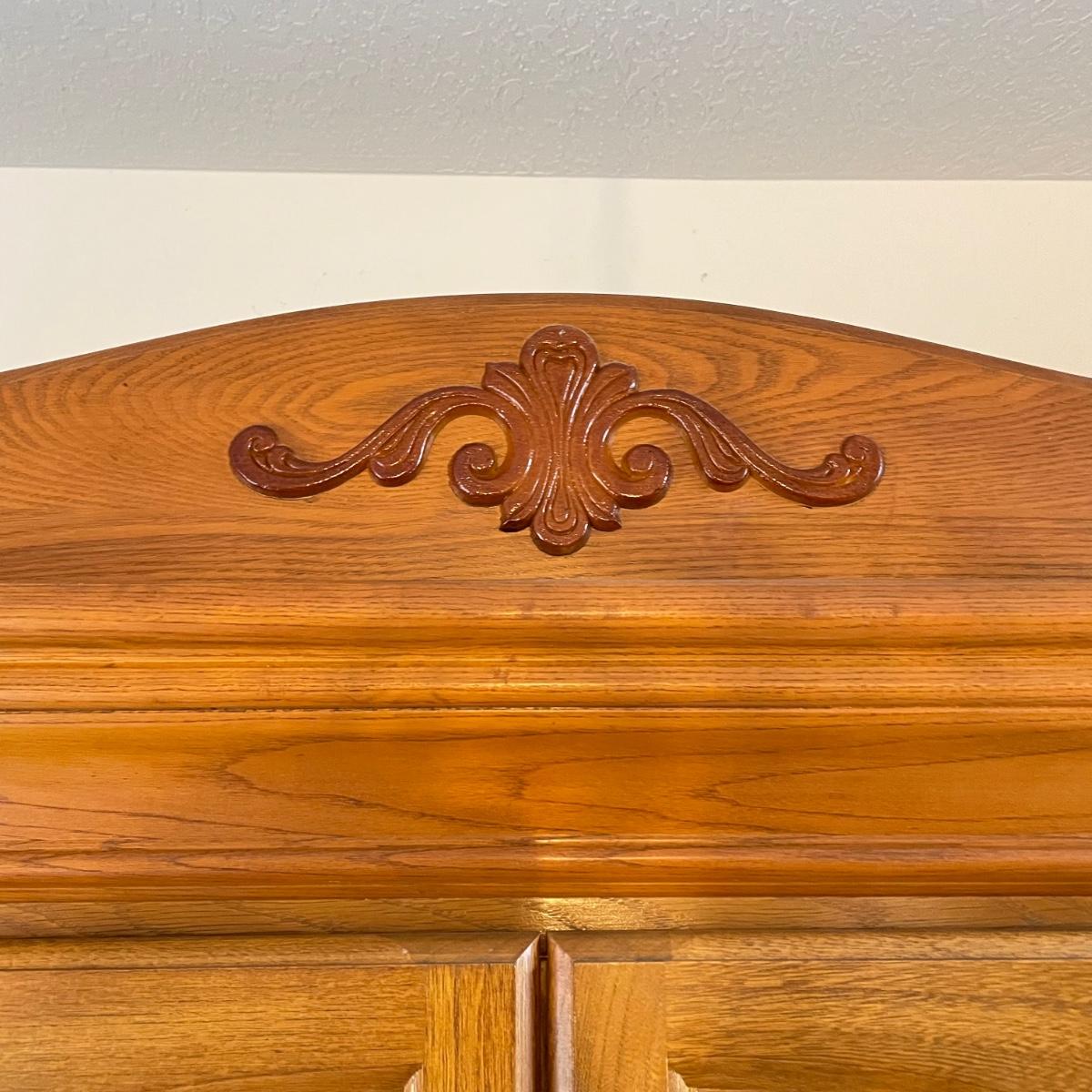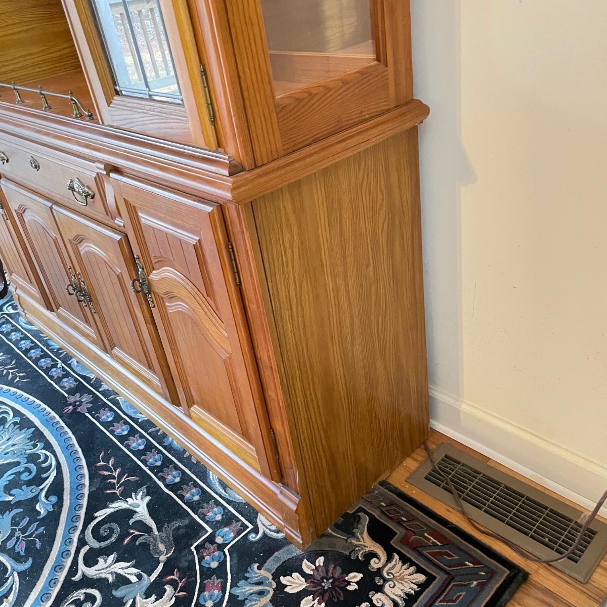 Stunning hutch with leaded glass doors, metal flair and excellent storage. The bottom of the hutch has one drawer and four doors to a single cabinet with a fixed shelf. The drawer has a lock, but a key is not included. The top has a unique single cabinet with two fixed glass shelves and a mirror backing with two working lights. The glass shelves each have a plate ridge to display your China or decor. Some blemishes are found along the bottom near the floor, the upper part is in very nice condition. Piece measures 62” x 17” x 78”. Piece is extremely heavy, please bring help to load, participants will need to navigate a flight of stairs off the porch. Local pick up only.