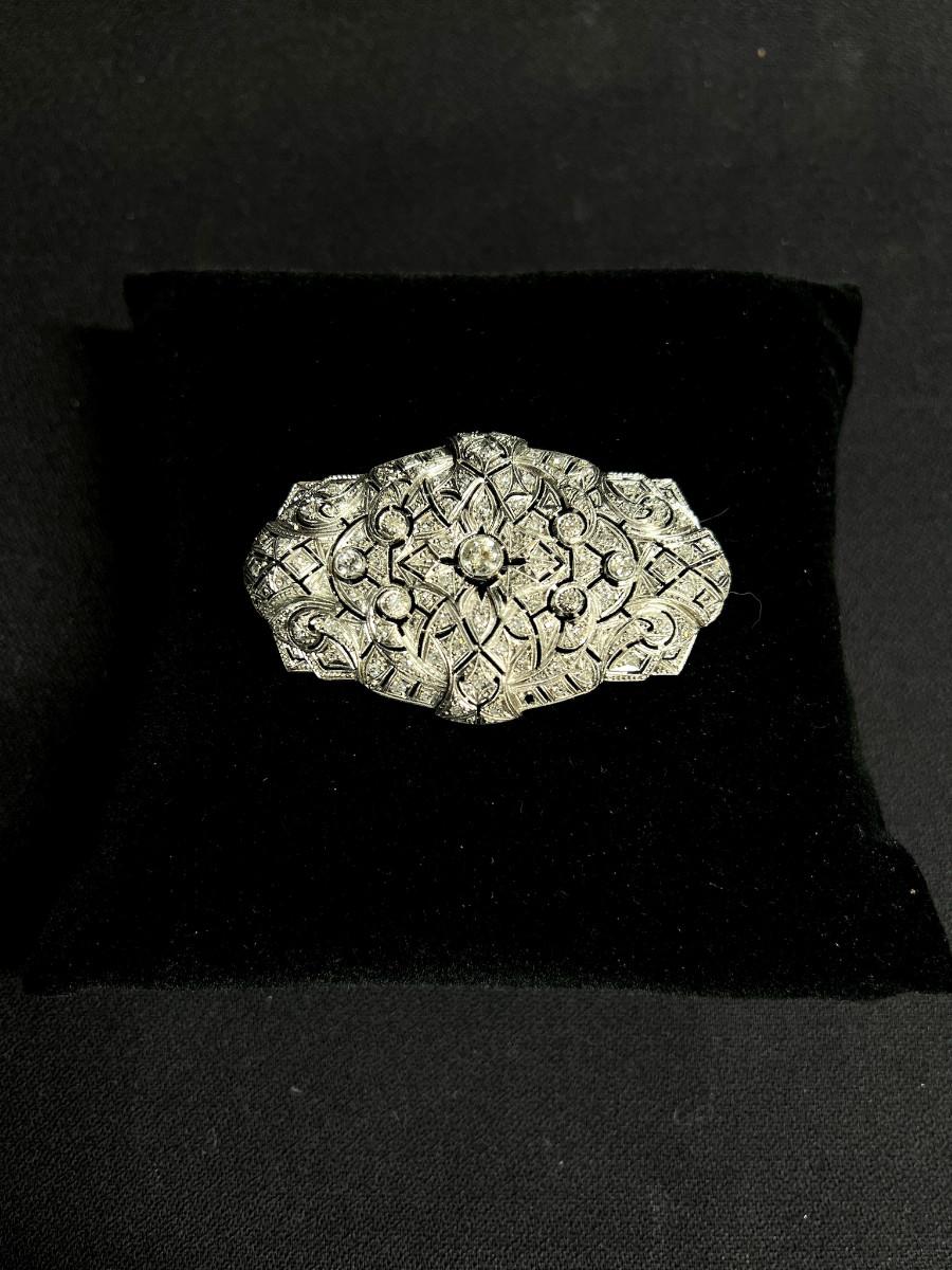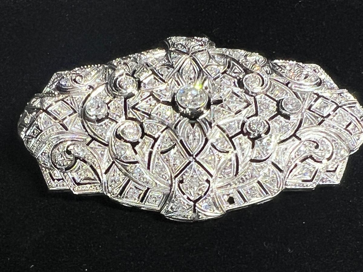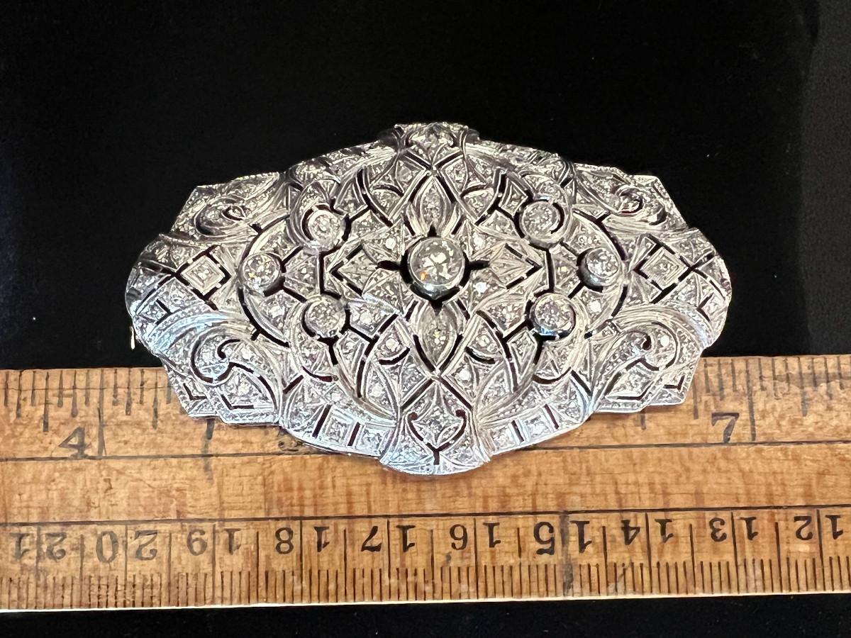 Gold was tested and diamonds verified by a local jeweler who said it could be up to 18k gold. No diamond carat weight provided. The central diamond is the largest. It has quite the presence and is very brilliant. There is one tiny stone missing on the lower part of the brooch. See pics.