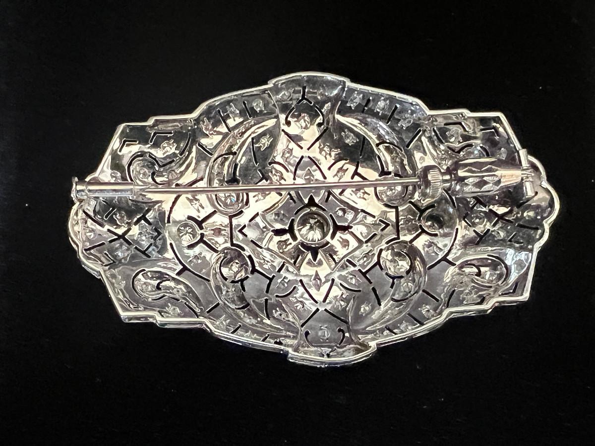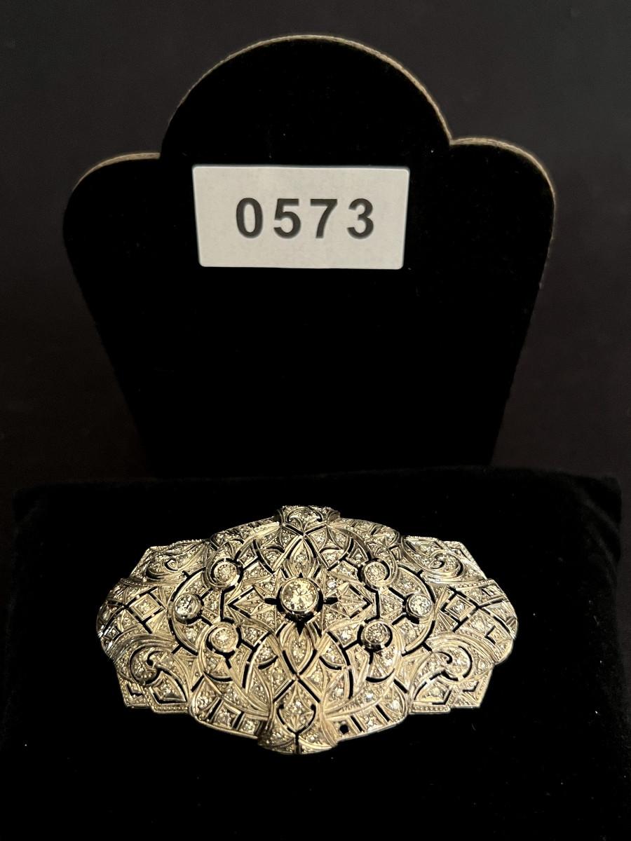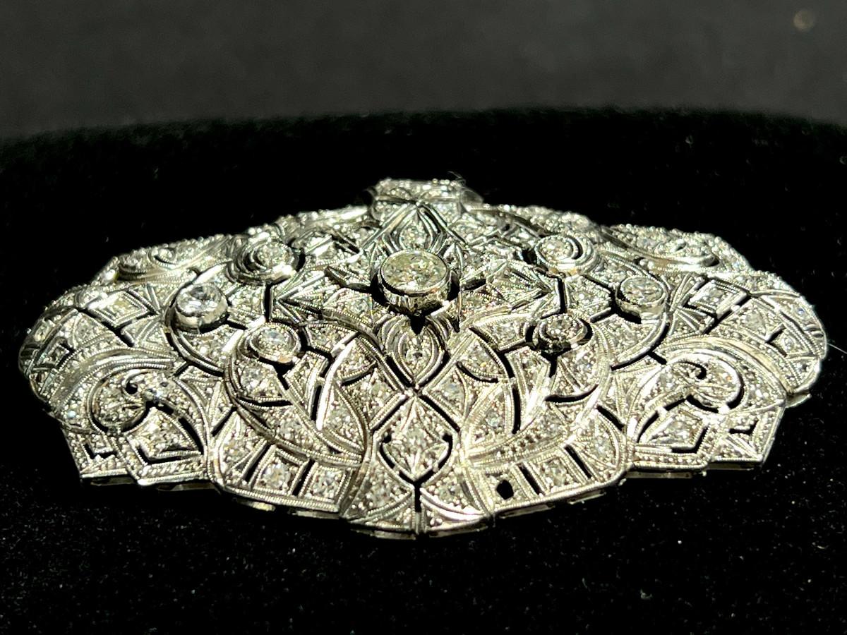 Gold was tested and diamonds verified by a local jeweler who said it could be up to 18k gold. No diamond carat weight provided. The central diamond is the largest. It has quite the presence and is very brilliant. There is one tiny stone missing on the lower part of the brooch. See pics.