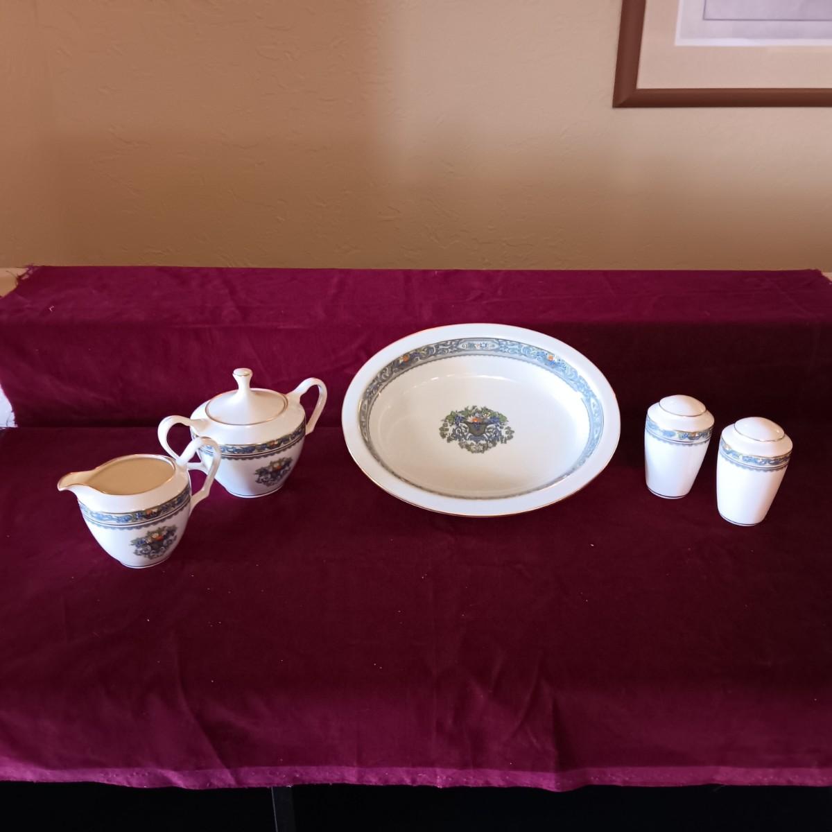 SERVING BOWL, SUGAR AND CREAM SET AND SALT/PEPPER SHAKERS