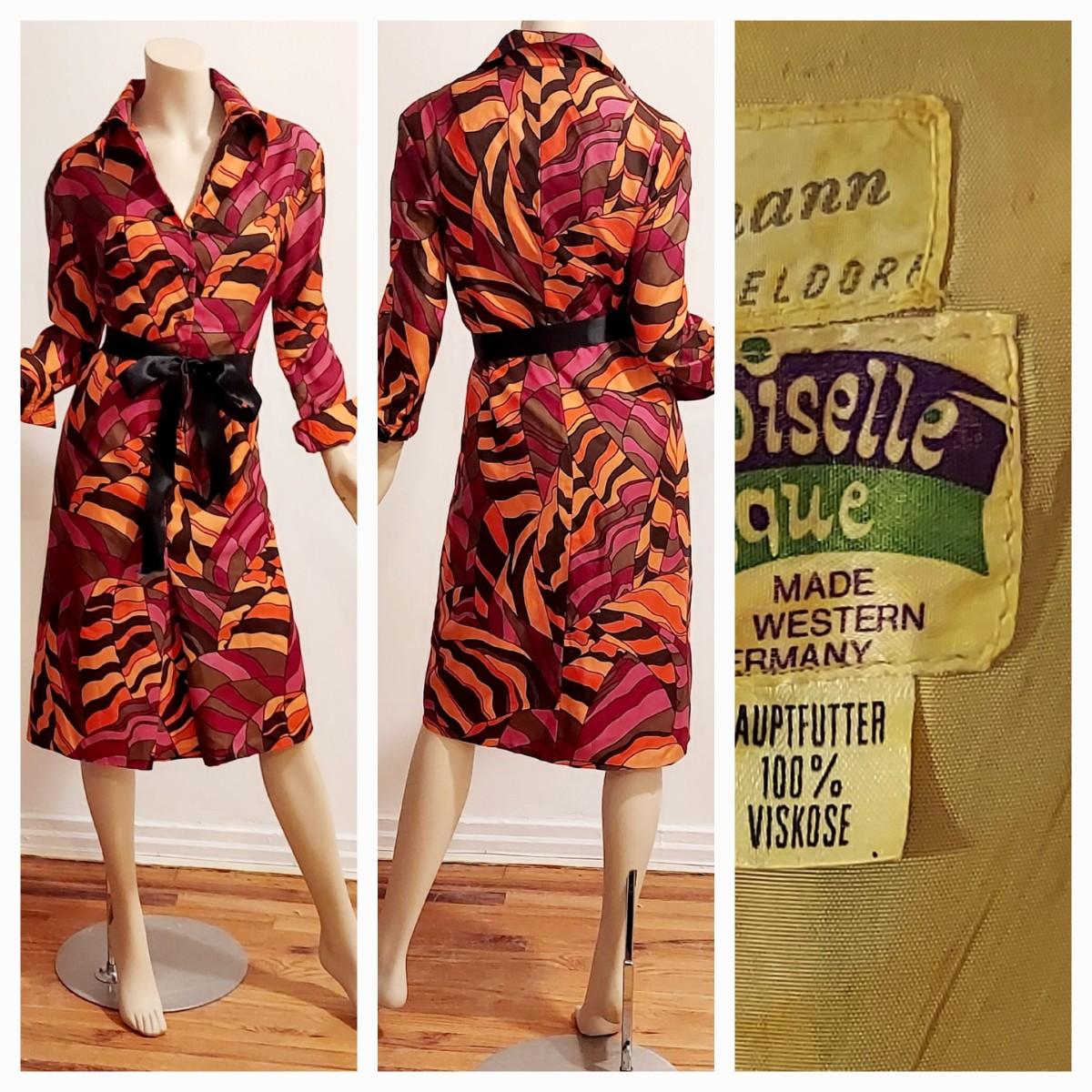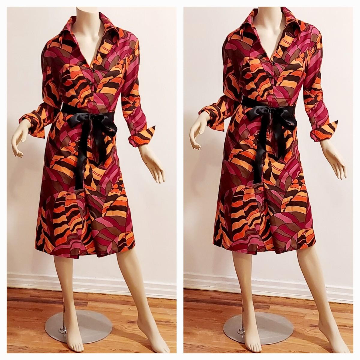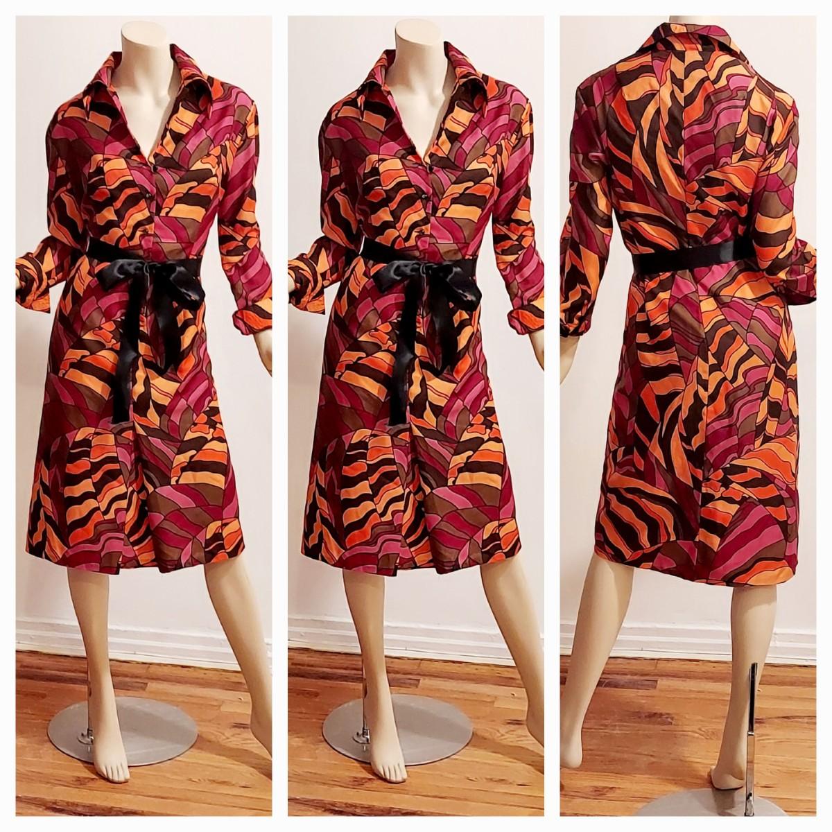 Beautiful button front day into eve dress with its Sash vibrant color and modern printed Design. In very good Vtg condition and very Feminine Classic.
