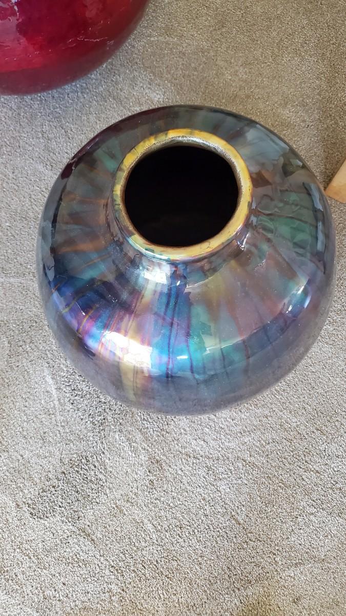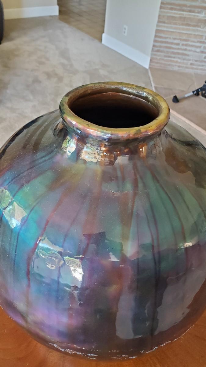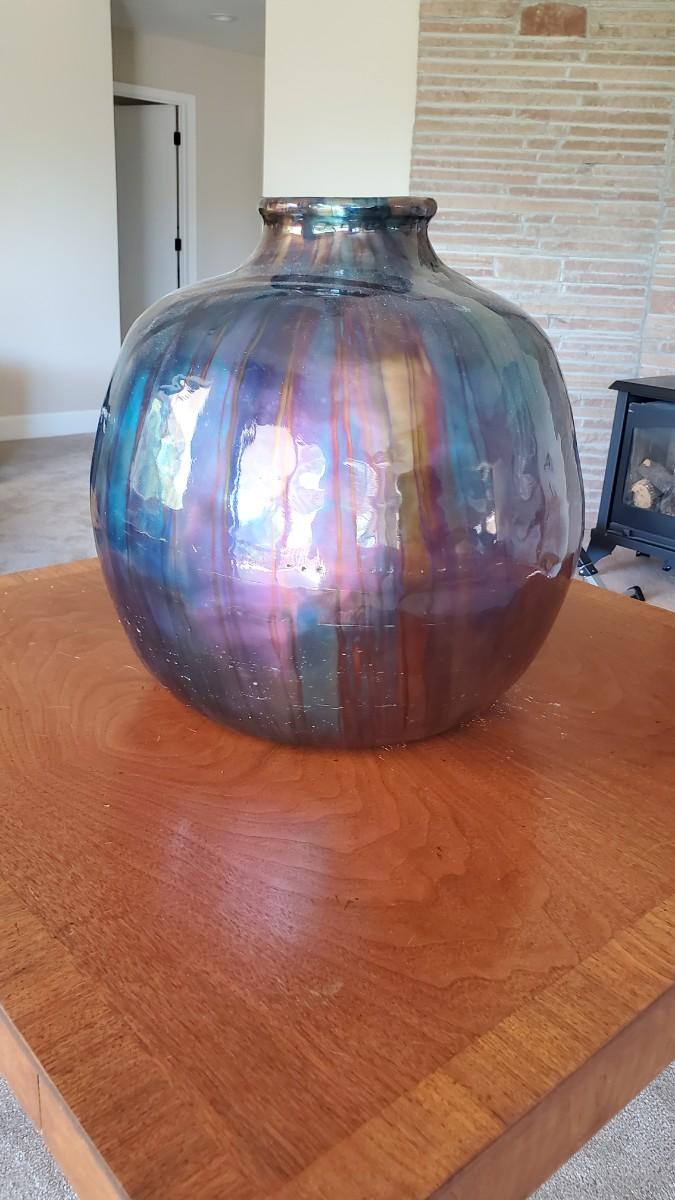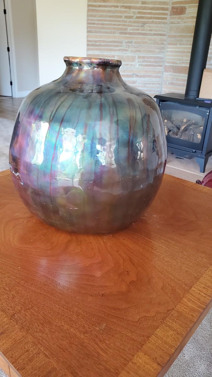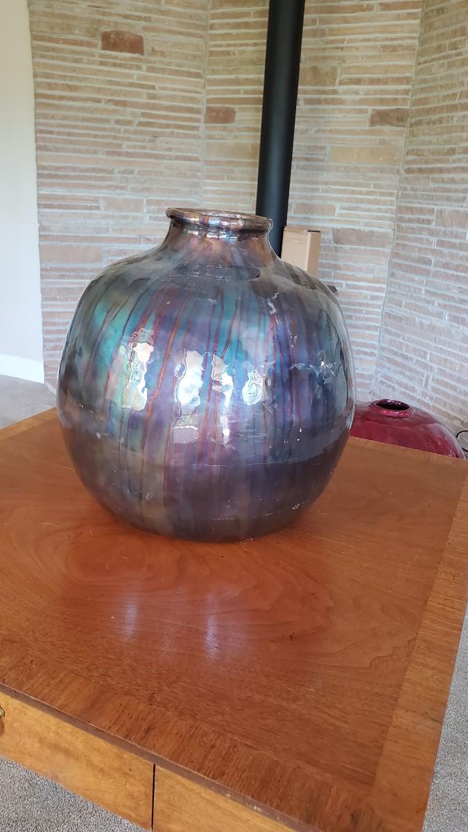 Stunning enameled copper vase. Some conditional issue where the enamel has worn off from hitting the wall. This area will patina over time, but for now the copper is showing through.