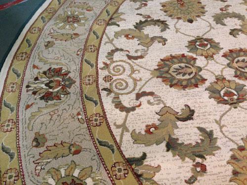 8x8 top of line Belgium made Brand Name Rug, in Oushak Pattern Premium Quality 1.0 m ppsm dense Pile in ,Ivory,Gold, Green and Multi Accent Colors ,made of Durable and easy to care, Polypropylene Pile Power Loomed in Belgium.