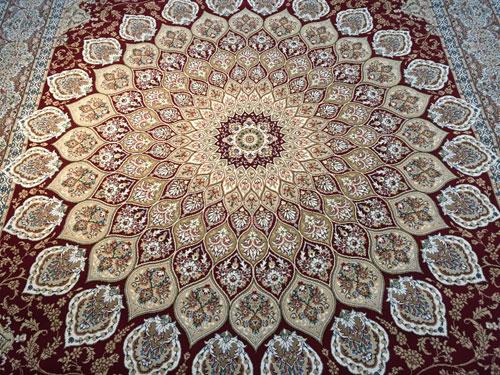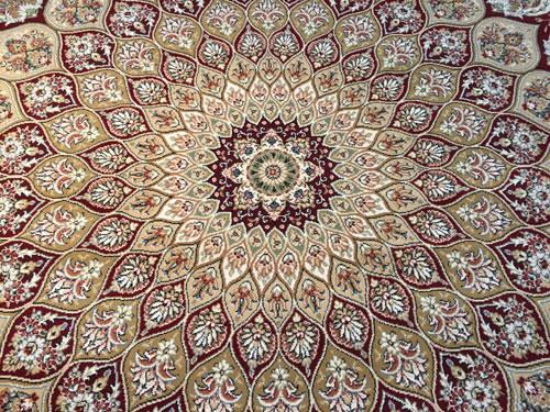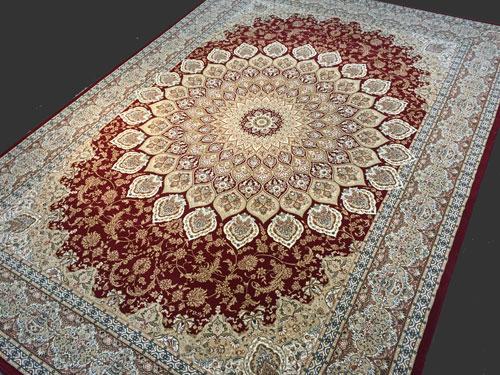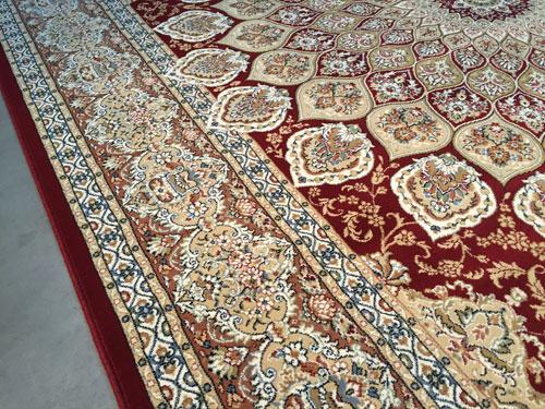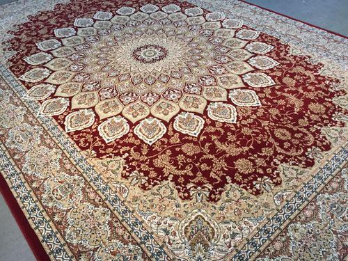 7 Feet 10 Inches X 11 Feet 2 Inches top of line Belgium made Brand Name Rug, in Persian Dome intricate and detailed Pattern Premium Quality 1.0 m ppsm dense Pile in Rich Red, and Multi Accent Colors ,made of Durable and easy to care, Polypropylene Pile Power Loomed in Belgium.