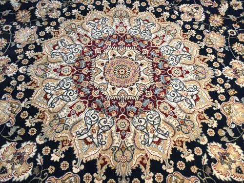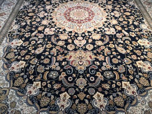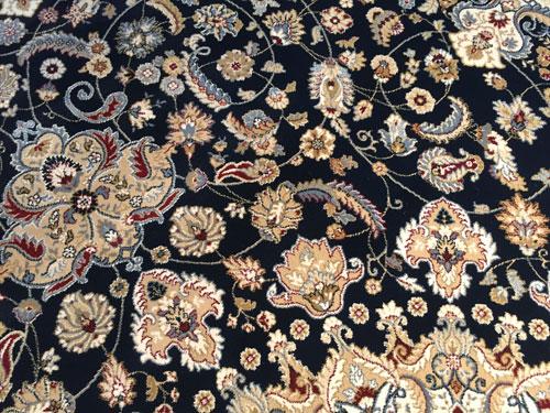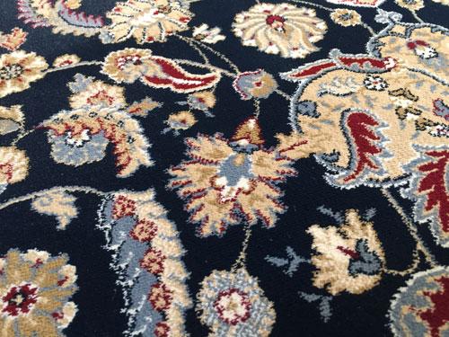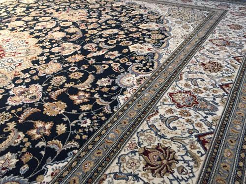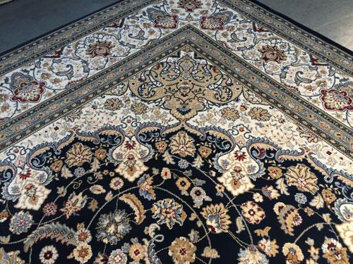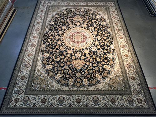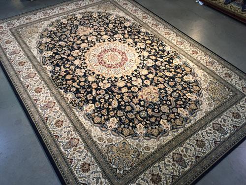 7 Feet 10 Inches X 11 Feet 2 Inches top of line Belgium made Brand Name Rug, in Persian Isfahan intricate and detailed Pattern Premium Quality 1.0 m ppsm dense Pile in Rich Navy Blue, Ivory, and Multi Accent Colors ,made of Durable and easy to care, Polypropylene Pile Power Loomed in Belgium.