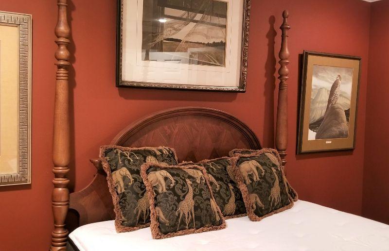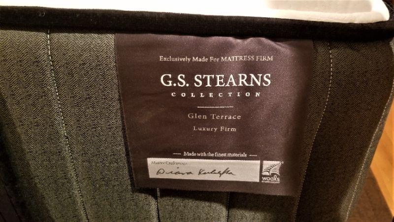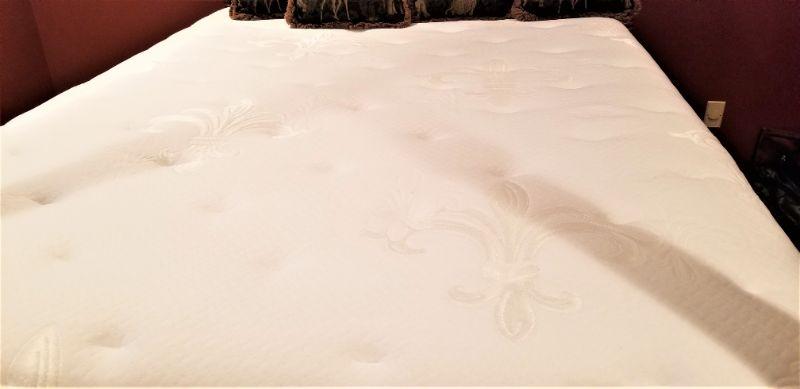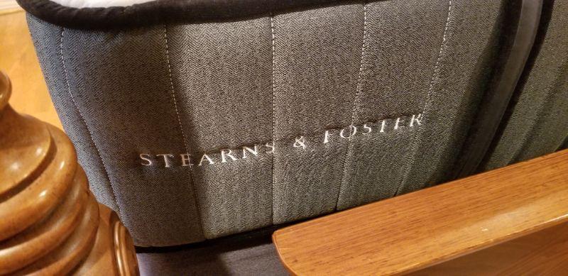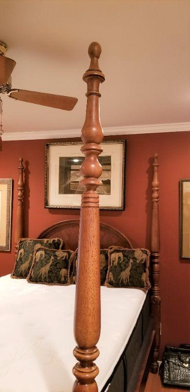 this gorgeous guest room Queen Four poster bed looks as though it has never been slept in. Luxury Sterns & Foster mattress set (the cheapest one they make is 1600.00) is "showroom fresh." The pillow shown on the bed come with it. Measures 85" tall, 90" long, 64 1/4" wide.