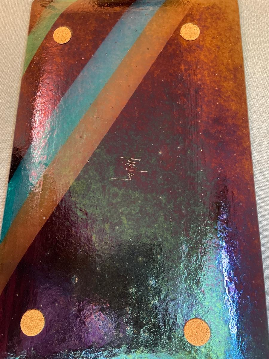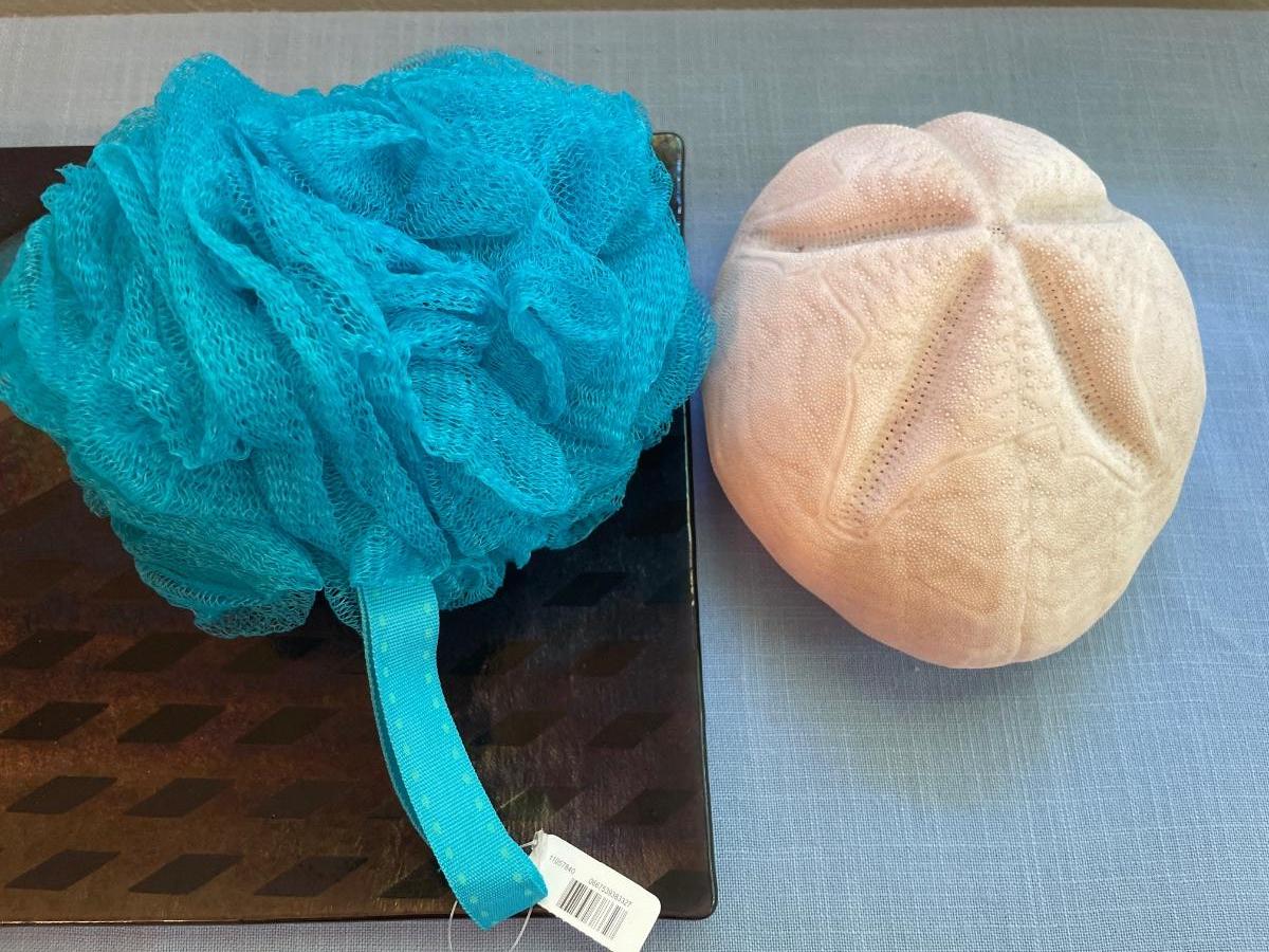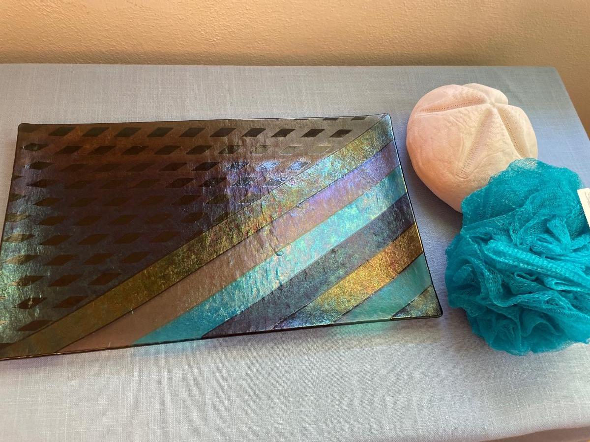 Glass tray is 15” x 9” and signed by Kurt McVay, Also new bath poof & large Sand dollar.