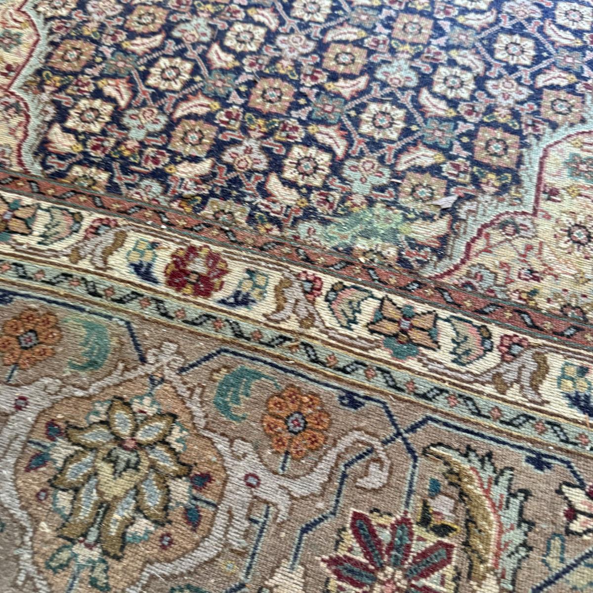 This magnificent hand-knotted Tabriz Persian area rug features a large center medallion with a vine and flower border. It has brick, navy, gold, light blue, pewter, brown, red, and green colors. The rug measures 6’9” x 10’1”. Including the fringe it reaches 10’10”. The fringe is intact in most areas but has some damage, see photos. the is some fraying on one side of the selvage.