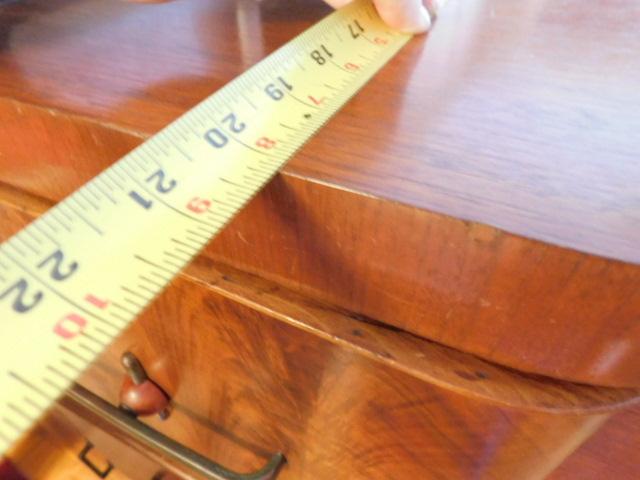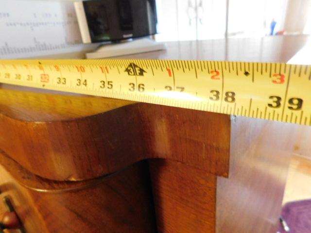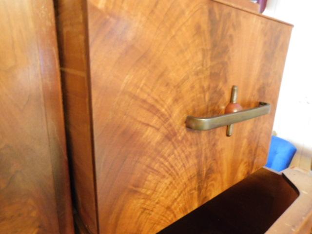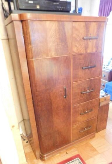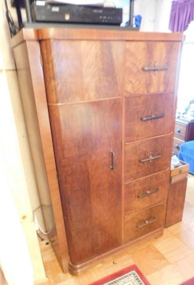 Stunning Vintage Art Deco Tall Boy Dresser Armoire Cabinet 38"x20"x60" has delamination at top left of cabinet as shown. This piece has fantastic eye appeal and stands out among the crowd!