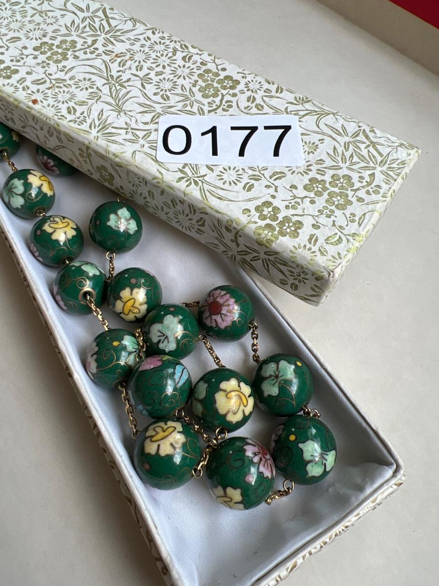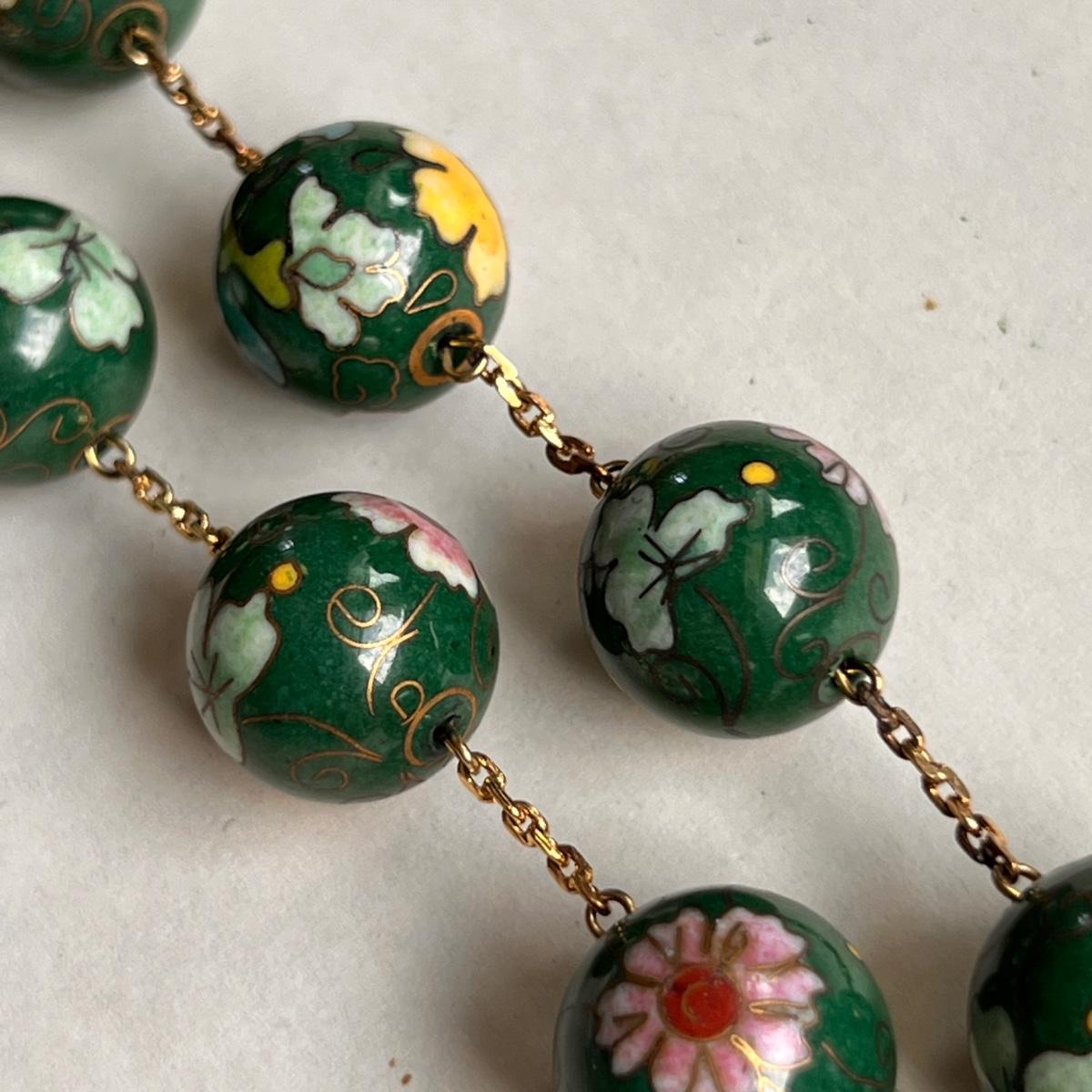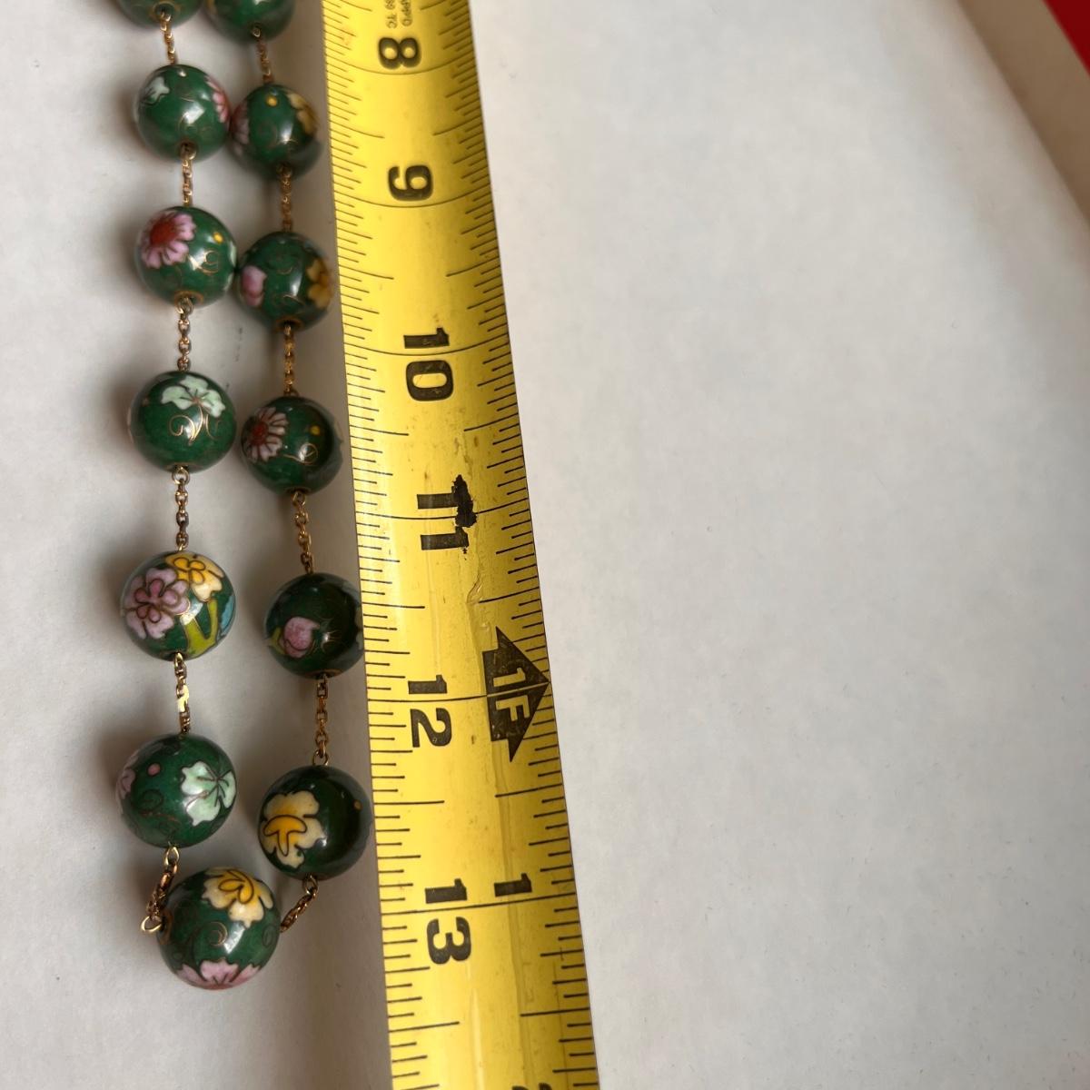 Green floral cloisonné beads linked with gold chain (chain has not been tested and is not stamped). It’s 13” long laying flat and does not have a clasp. This piece has weight to it and is high quality. Total weight of the necklace is 76.42 grams. No found chips or cracks to beads.