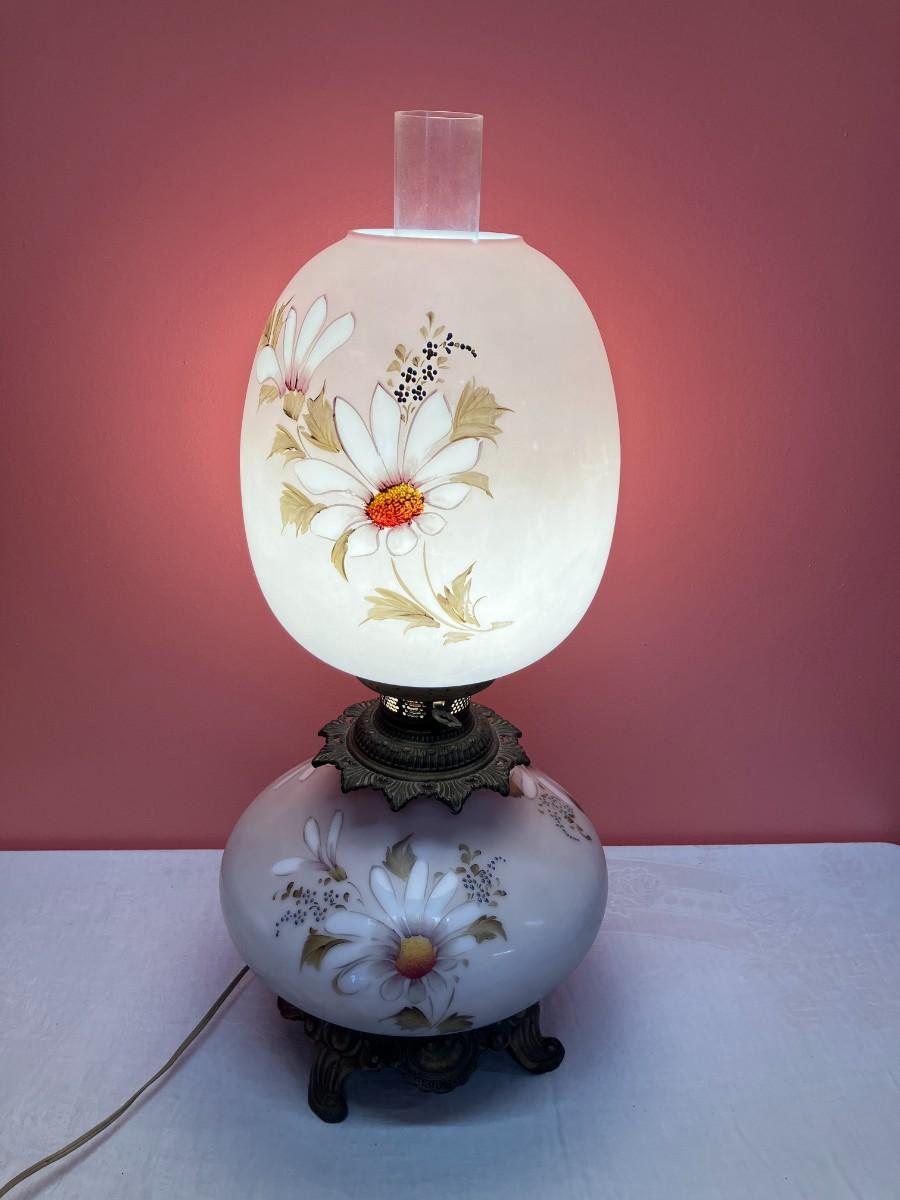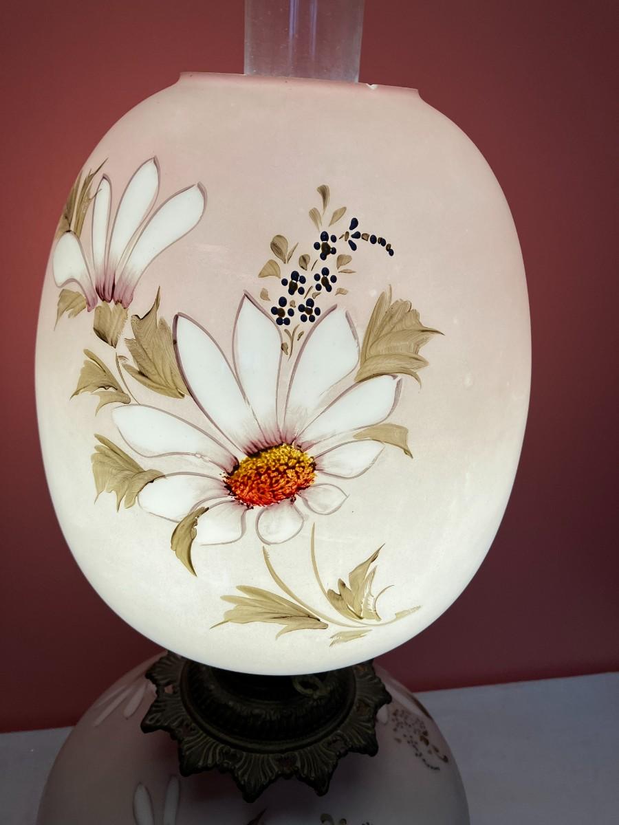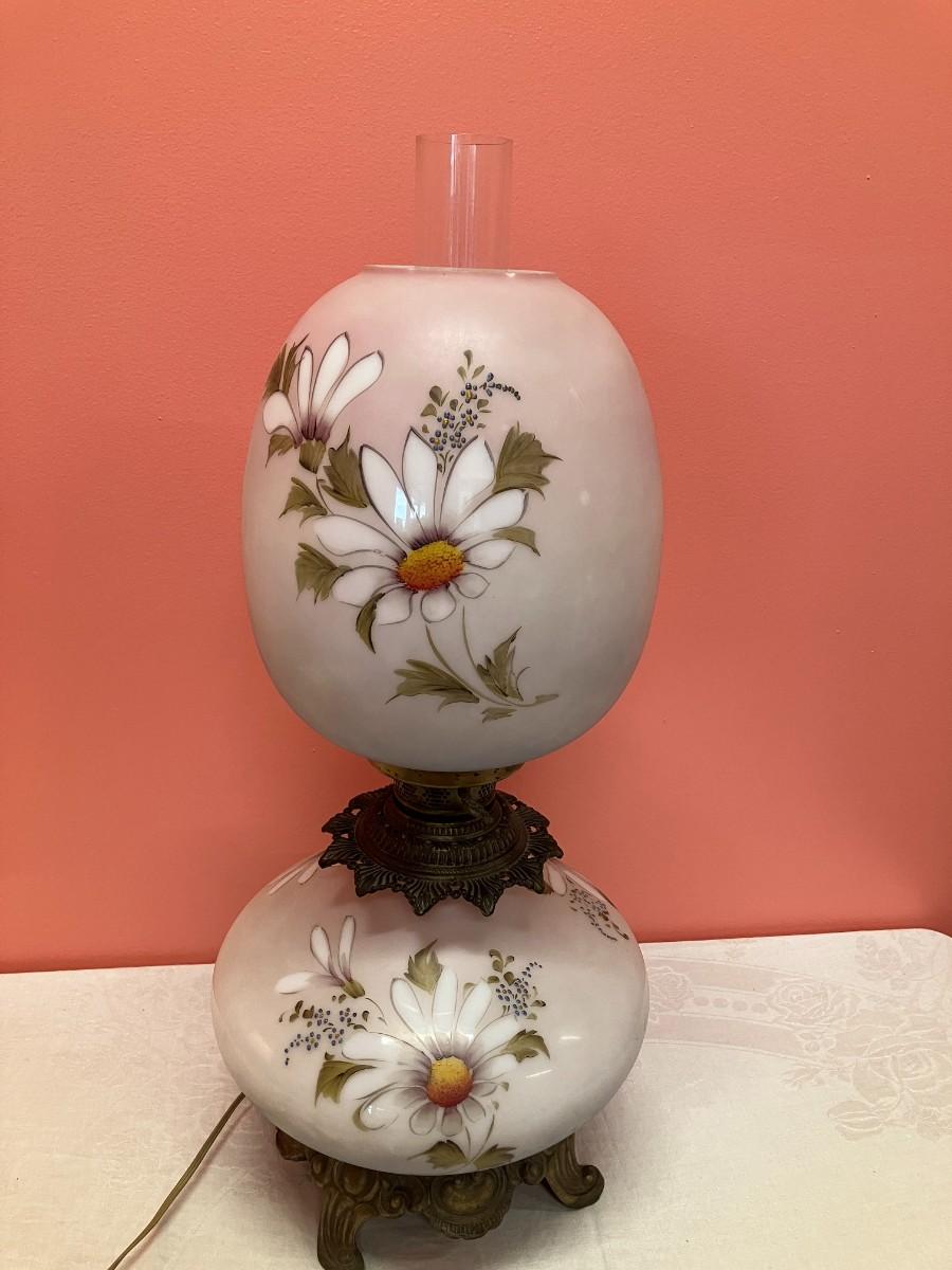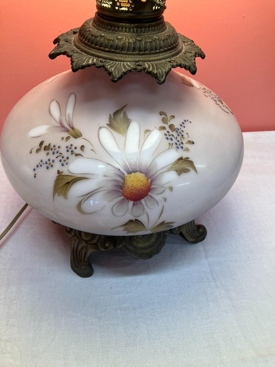 Beautiful vintage 27" tall electrified parlor/hurricane lamp with hand painted globes. No chips/cracks. Excellent condition!!