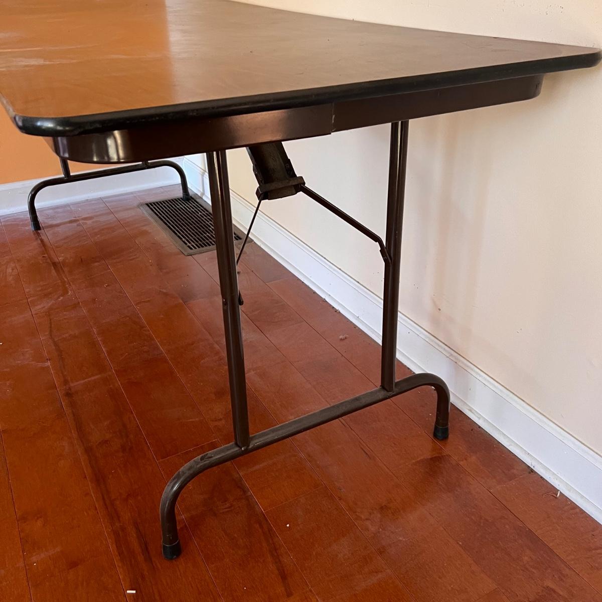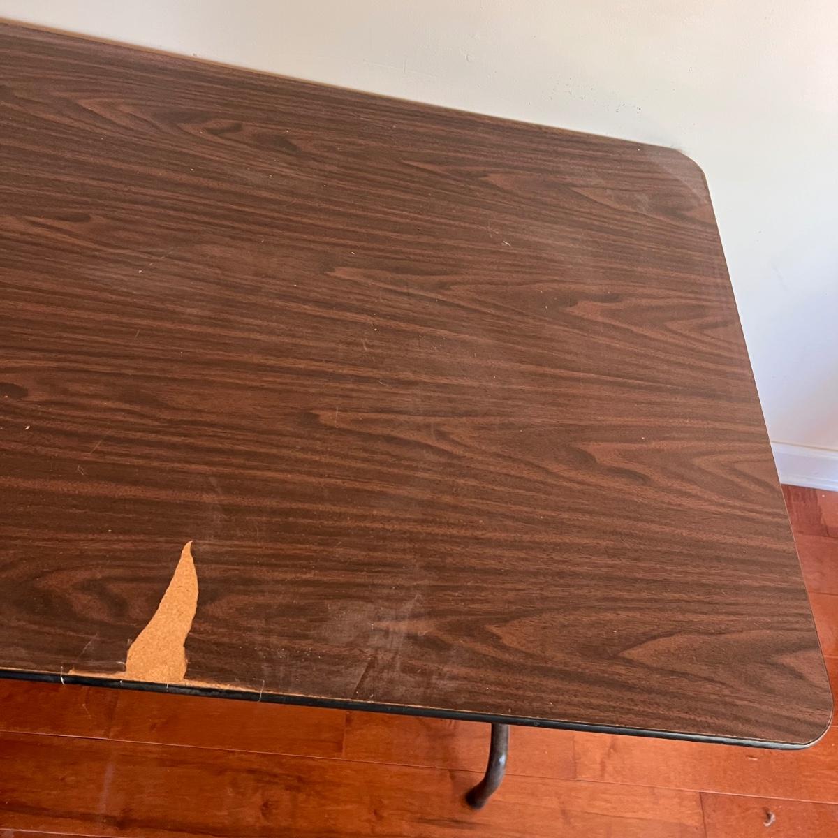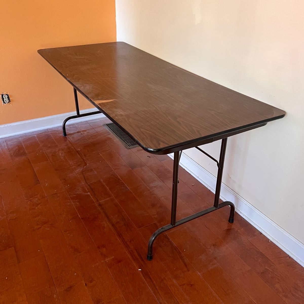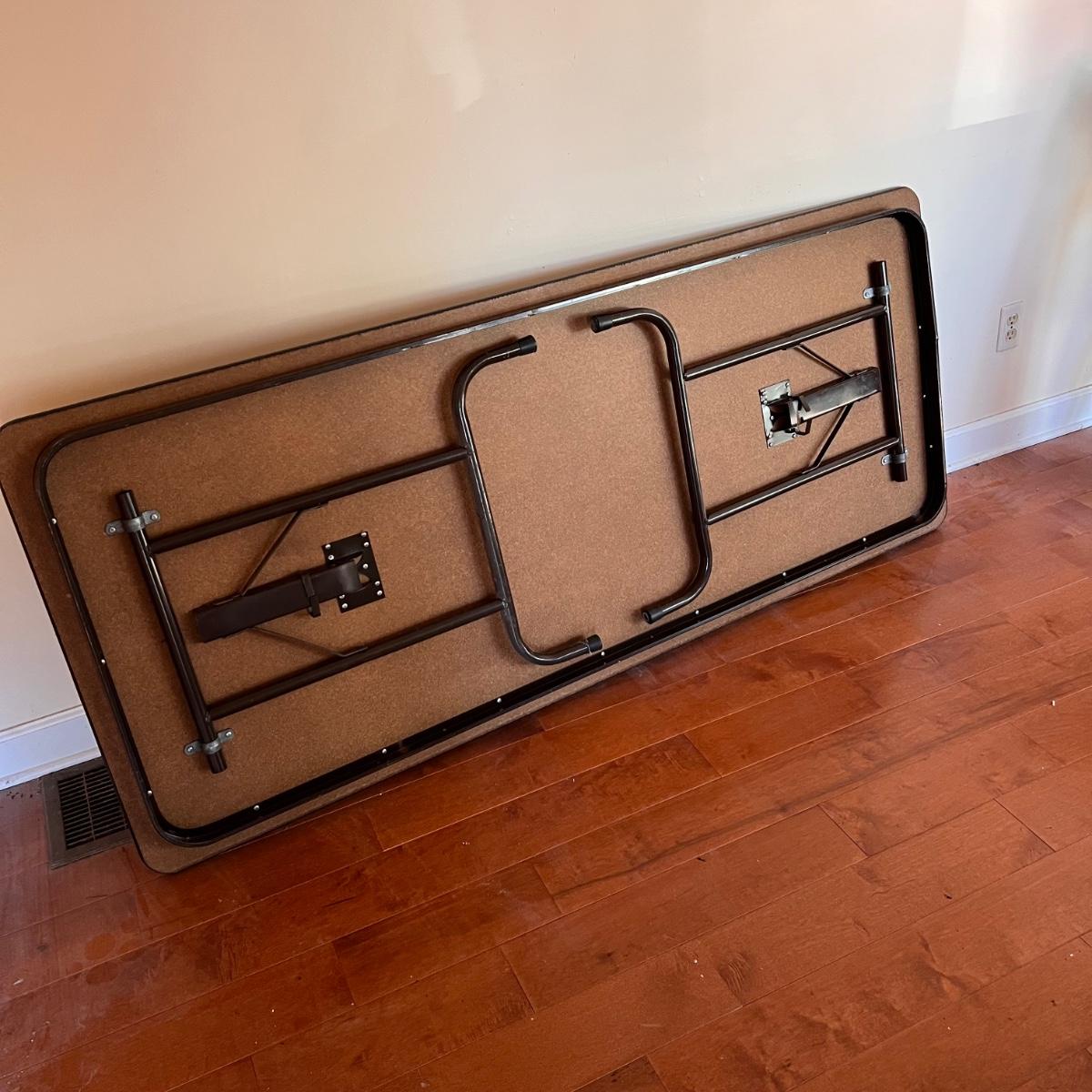 Super sturdy folding table has durable metal frame. Some slight wear on the tables top surface, see pics.