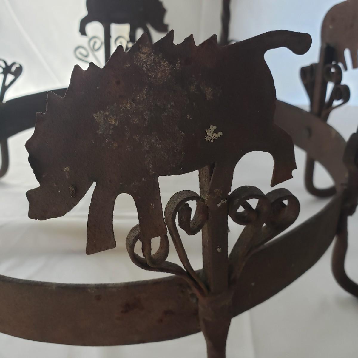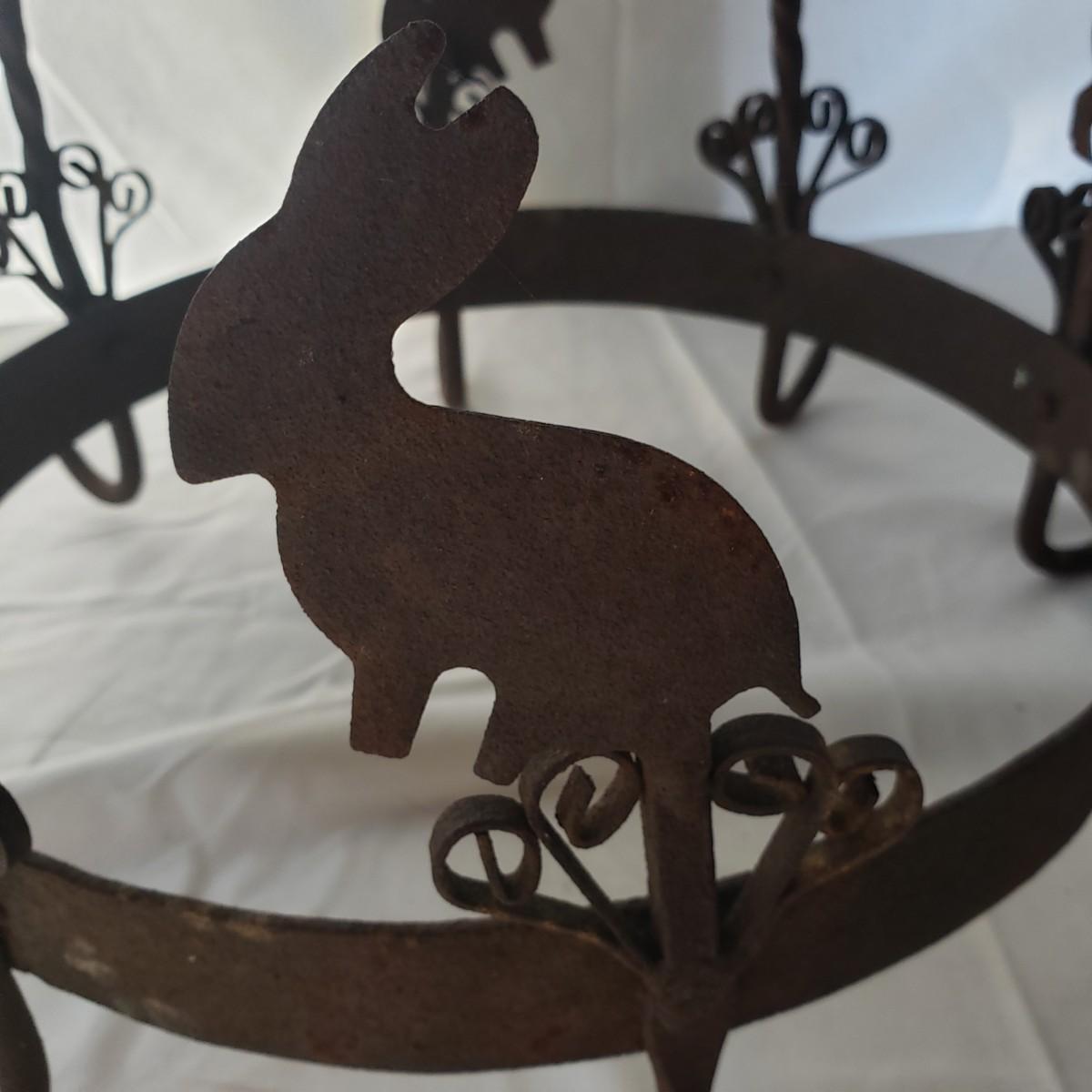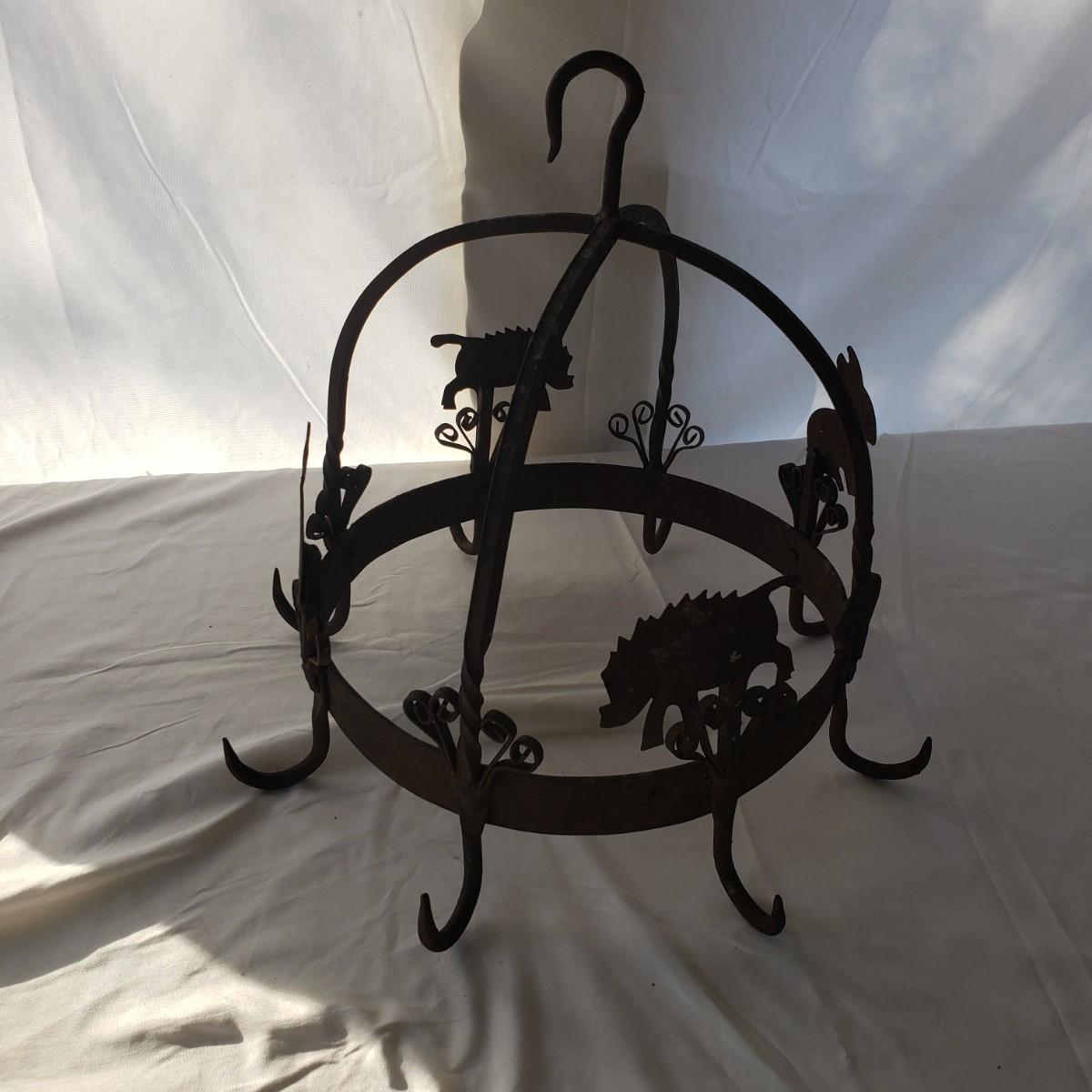 This metal cooking rack has eight hooks to hang pots and pans or whatever you're inspired to hang! This piece measures 16" x 15"H. The rabbit and hog decor have curled pieces under them.