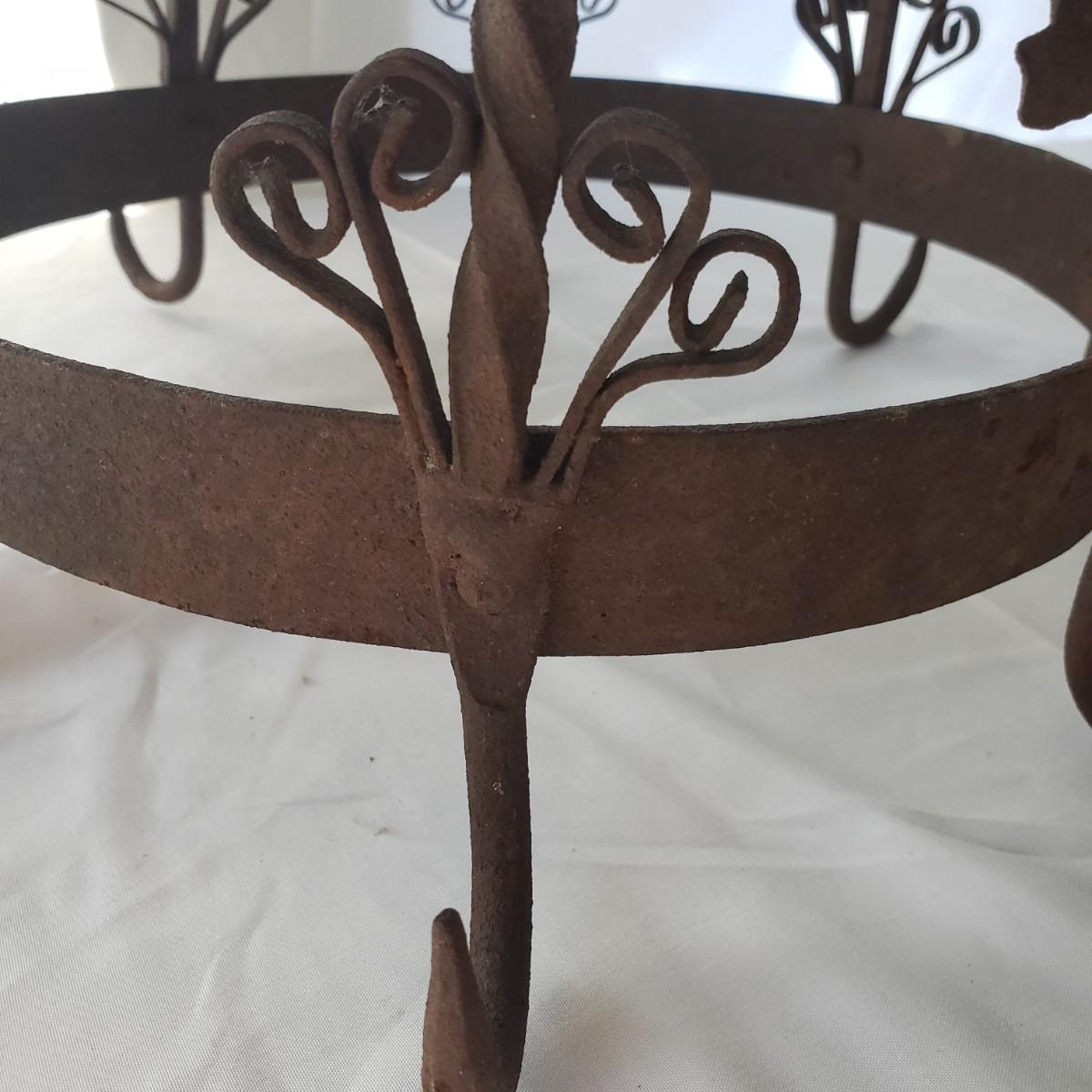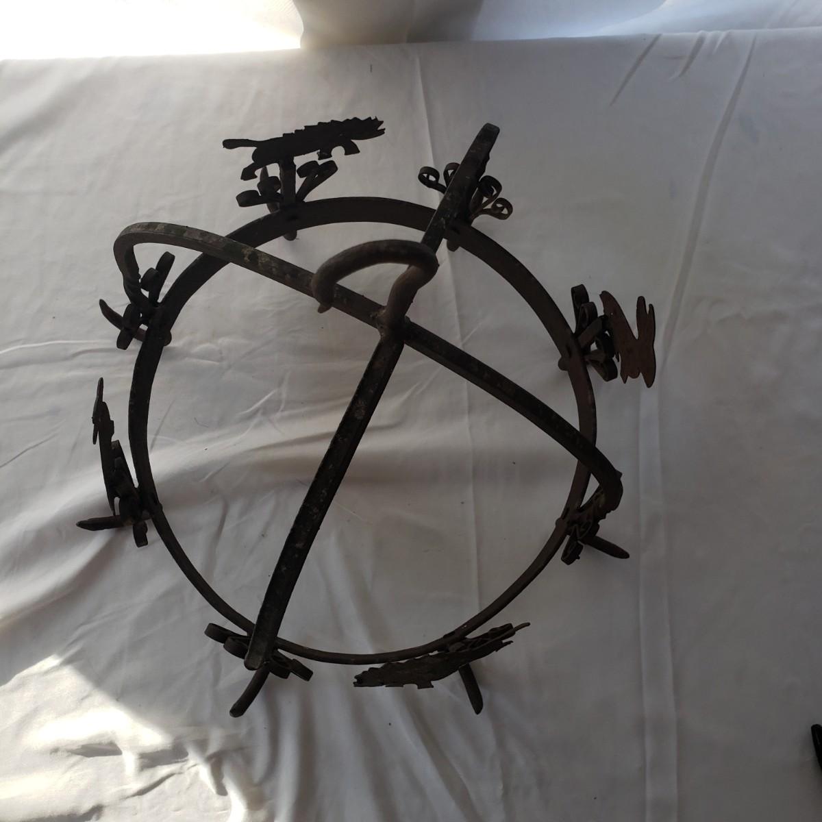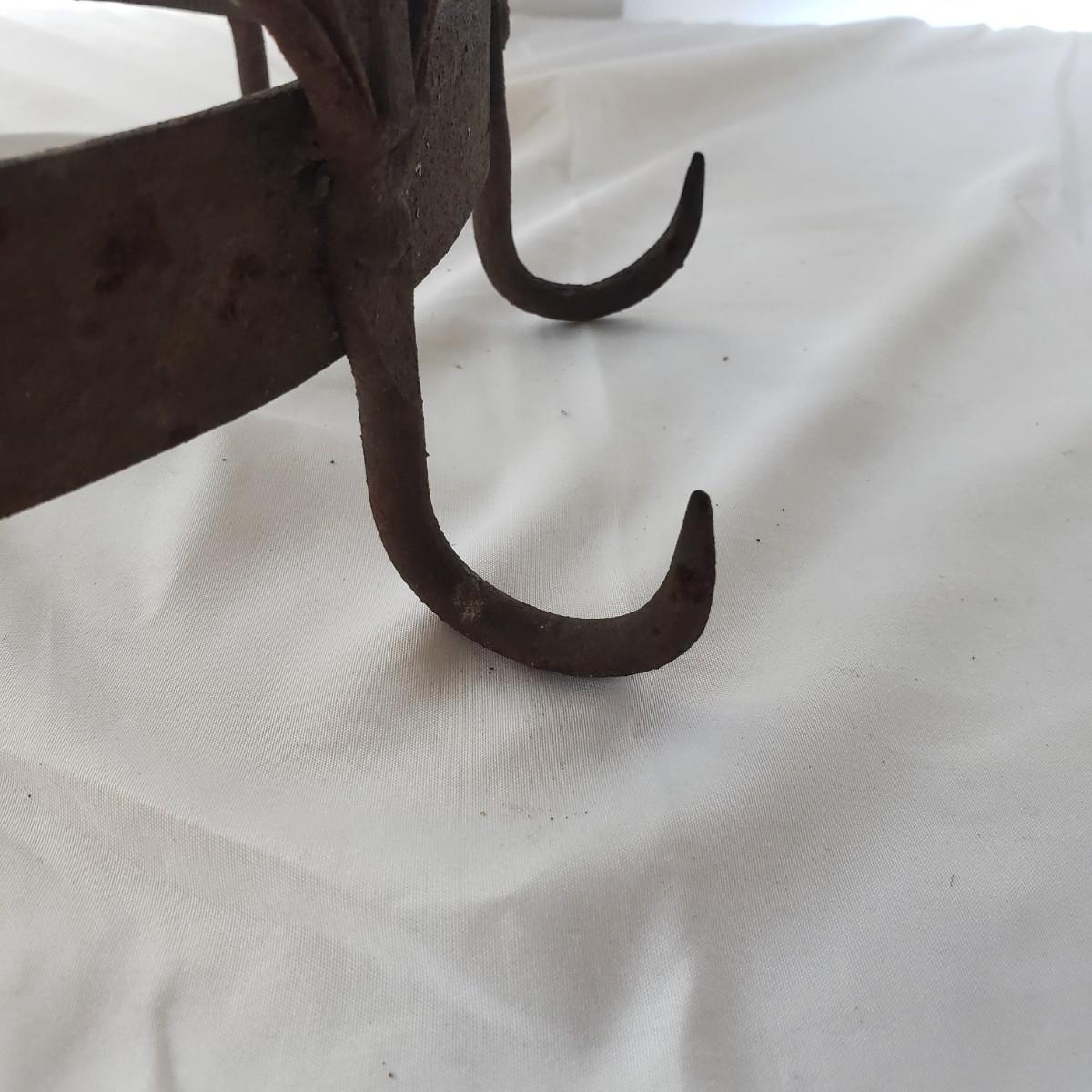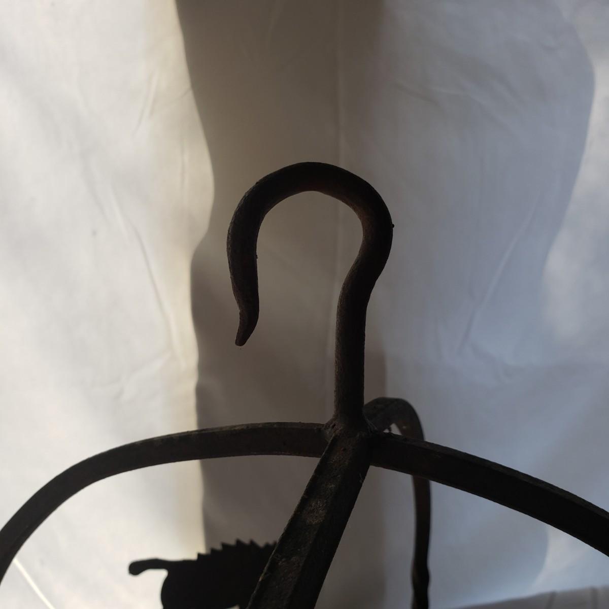 This metal cooking rack has eight hooks to hang pots and pans or whatever you're inspired to hang! This piece measures 16" x 15"H. The rabbit and hog decor have curled pieces under them.